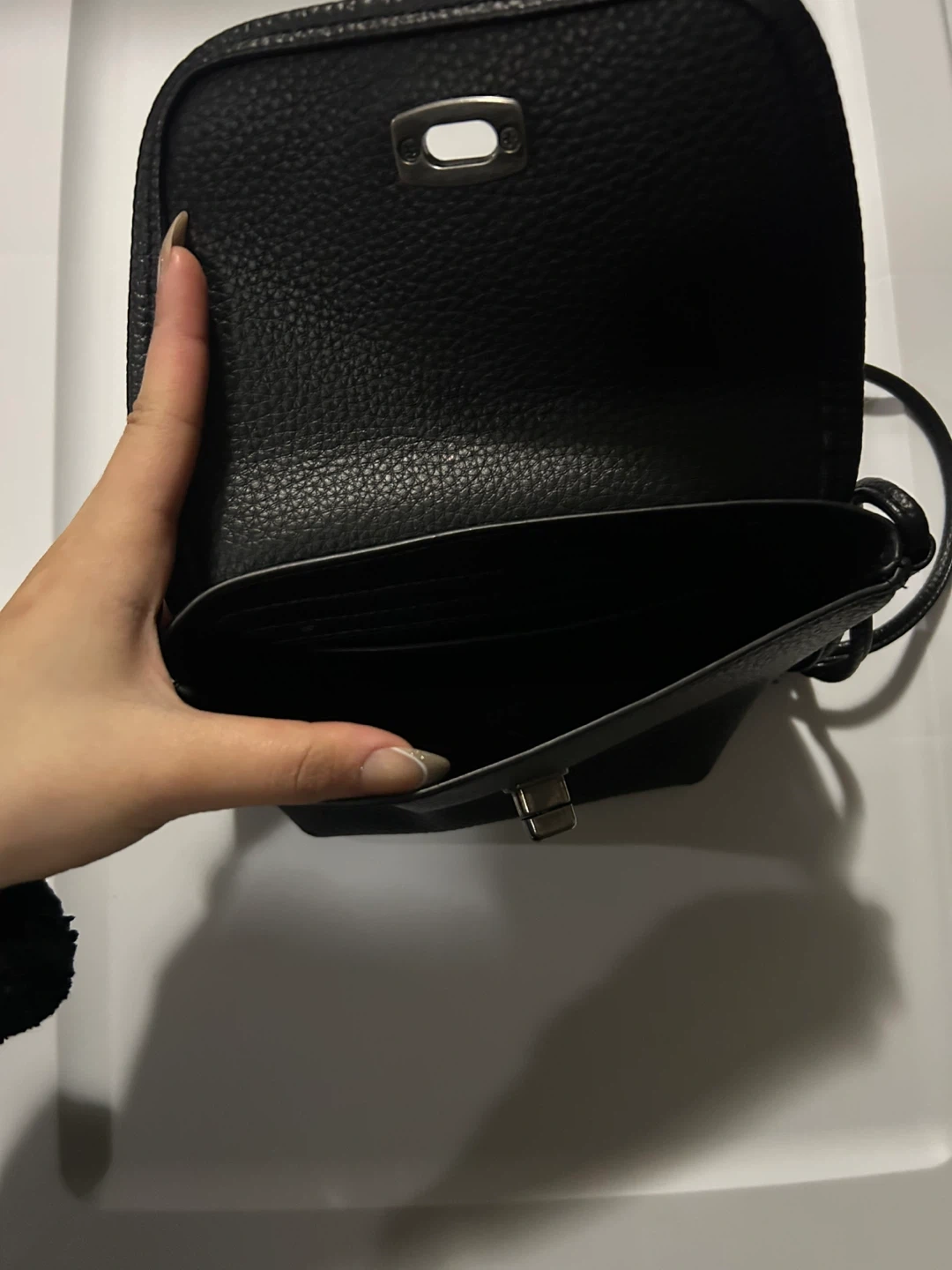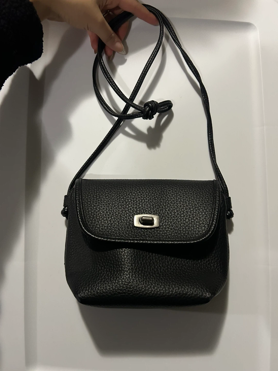 A cute black crossbody bag in great condition. It's perfect for carrying your essentials while keeping your hands free. The bag features a textured exterior and a simple, elegant design. It is a versatile accessory that can complement any outfit!