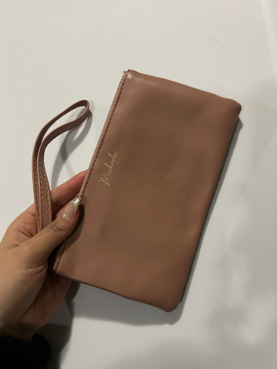 This is a cute Michaela wristlet wallet in a blush pink colour. It has a zippered closure and a wrist strap for easy carrying. Inside, there are card slots and a zippered compartment