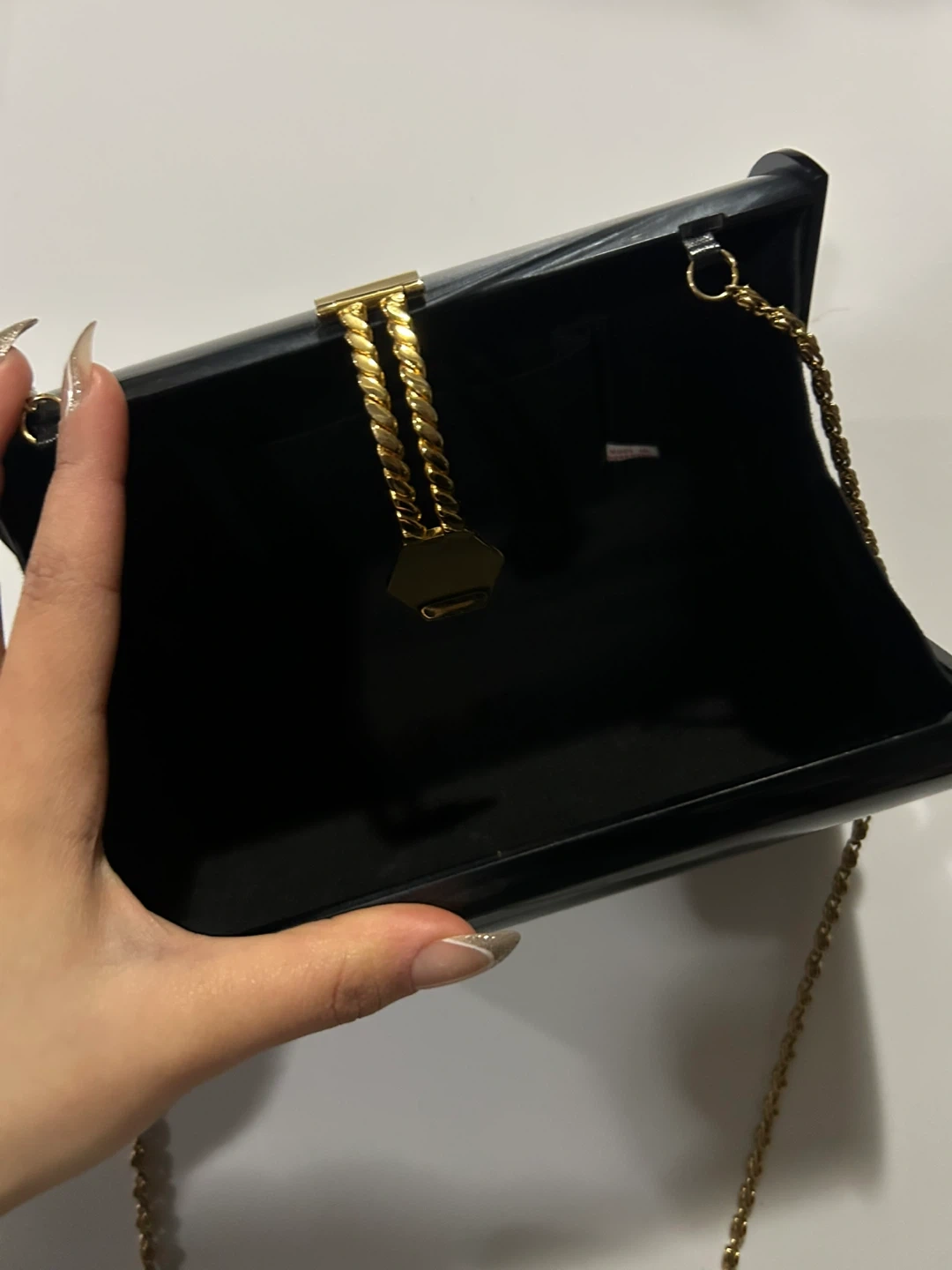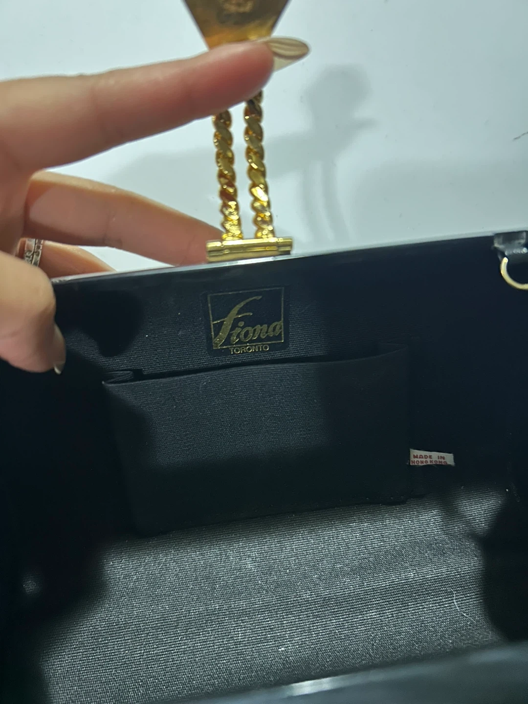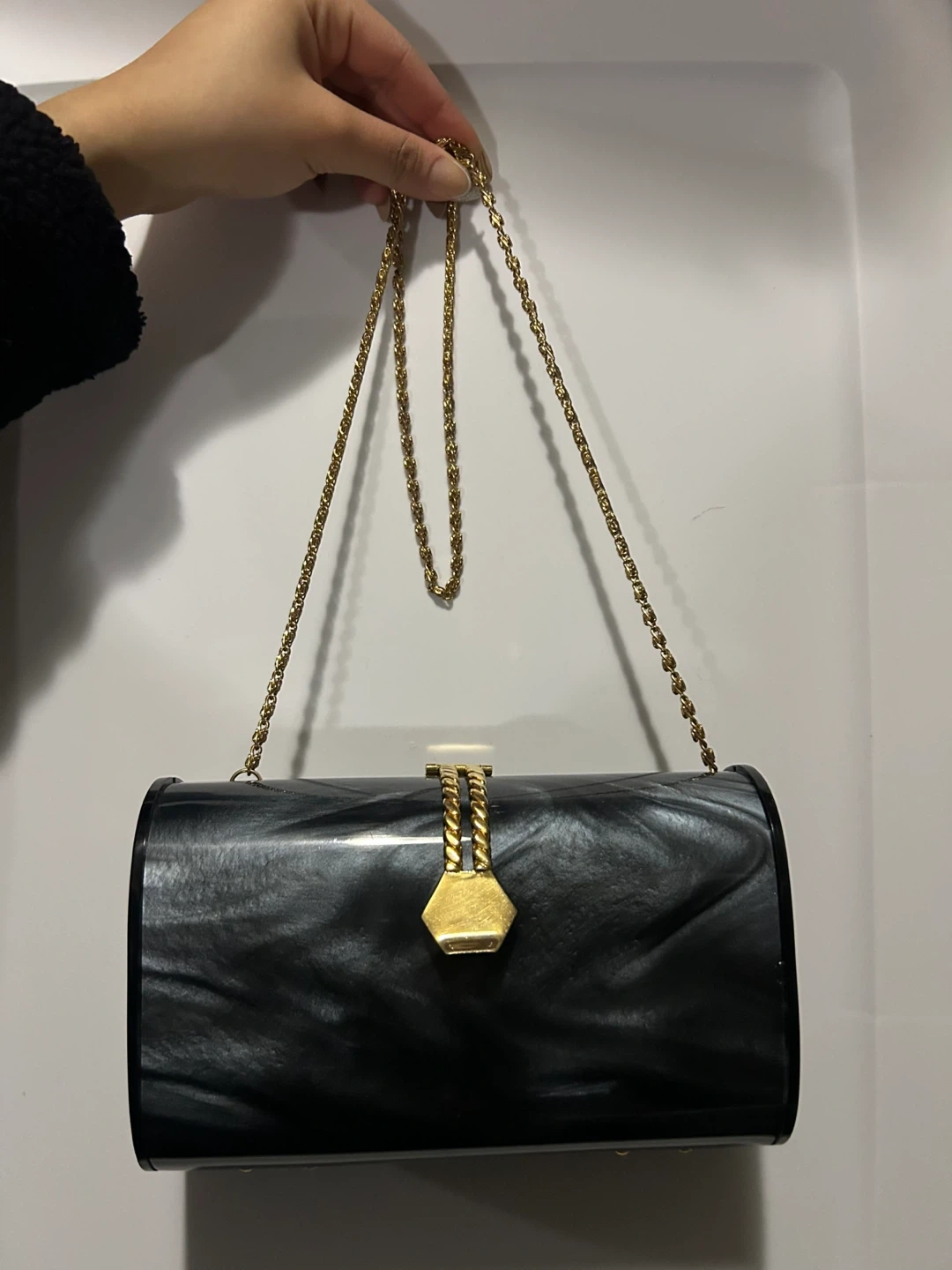 Selling a stylish Fiona Toronto clutch! It's black with a cool marbled effect and a gold chain strap. The interior is lined with a black fabric and has a small pocket. Perfect for evenings out or special occasions