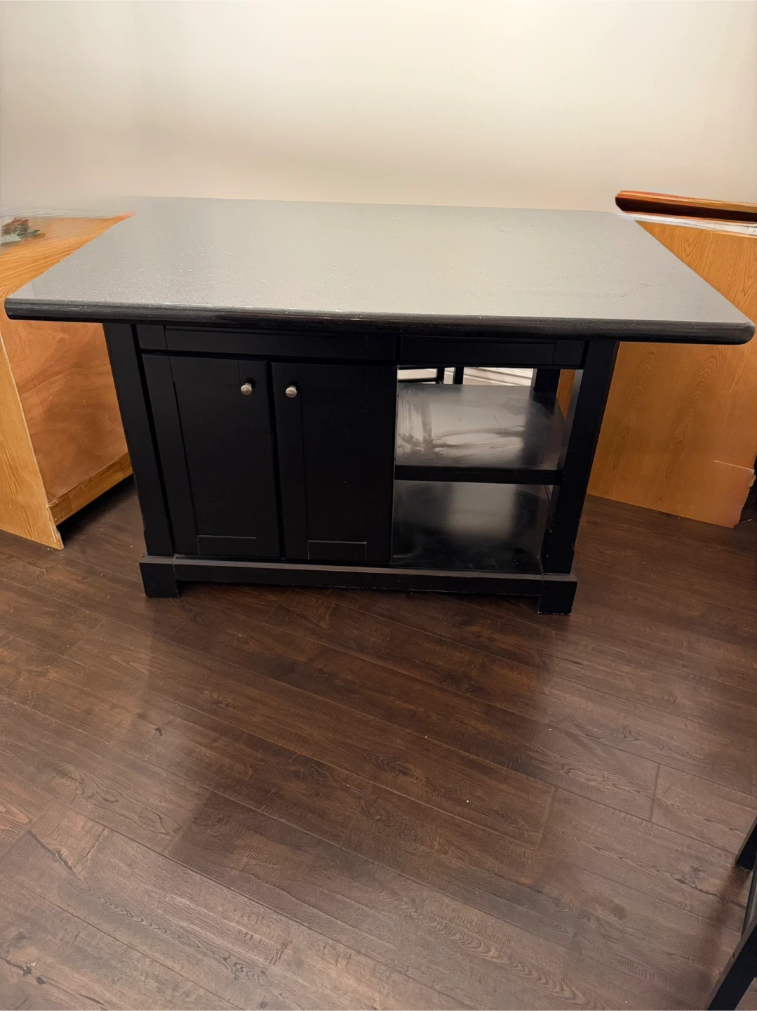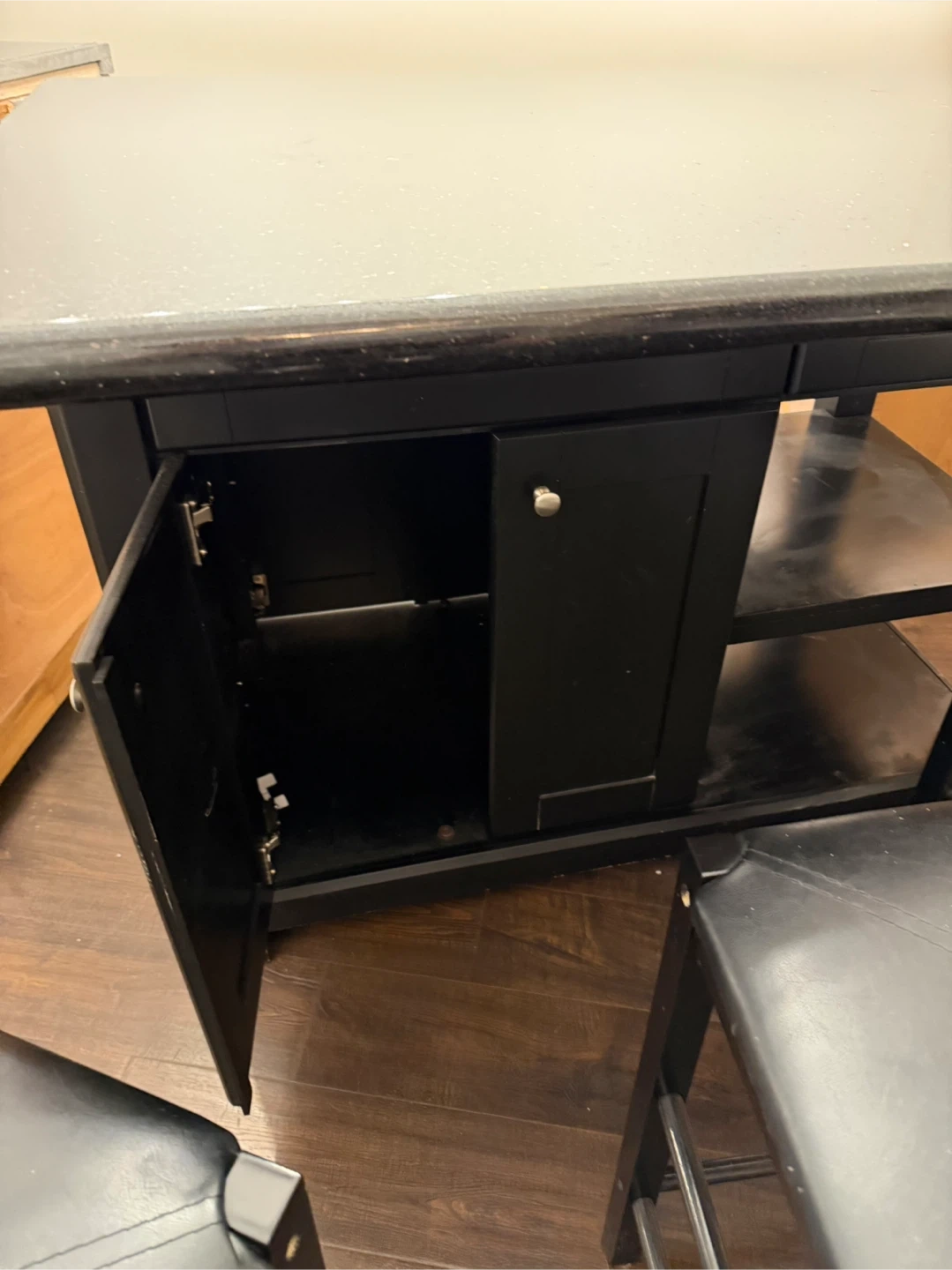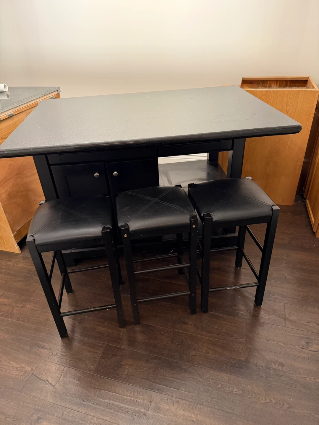 Beautiful kitchen island featuring a solid granite countertop. Includes three matching bar stools. Perfect for extra prep space, storage, or casual dining.