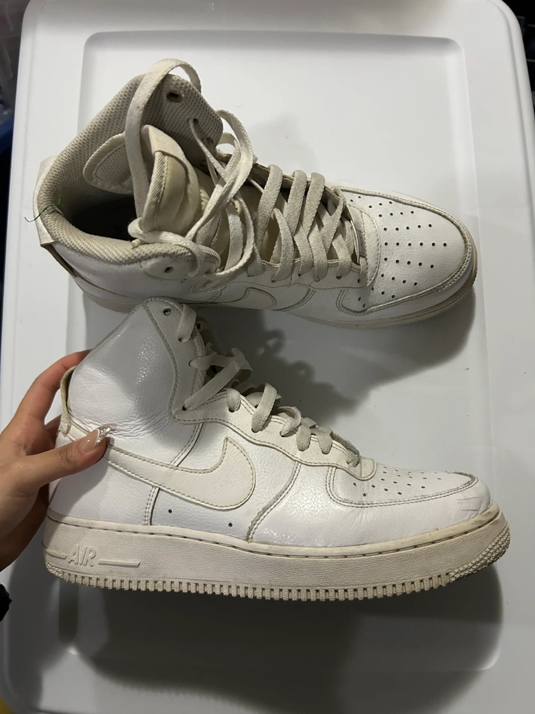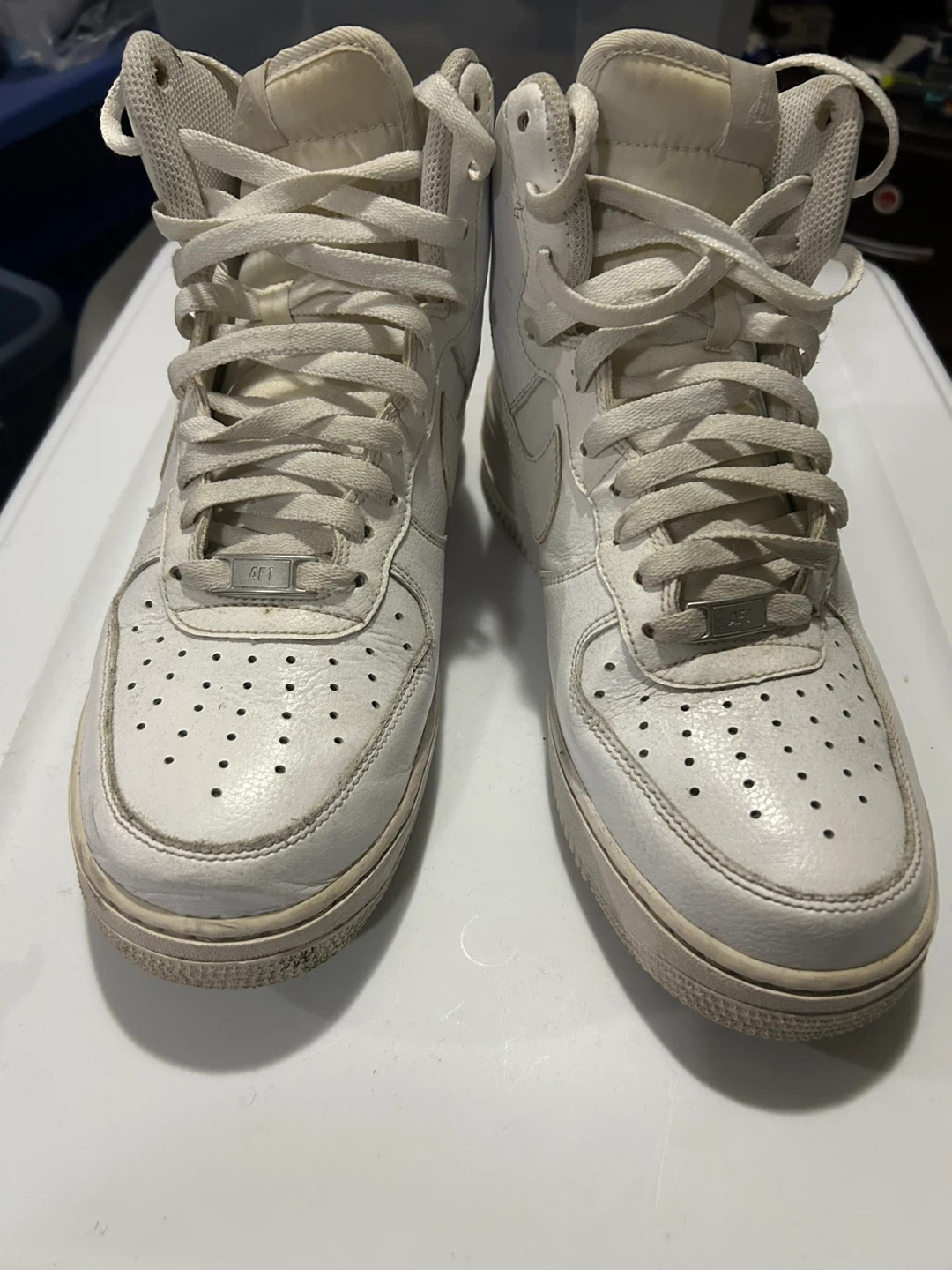 Selling a pair of Nike Air Force 1 High '07 sneakers in white! They are in used condition, as you can see in the photos. Size is 7 US. Some yellow staining uncleaned