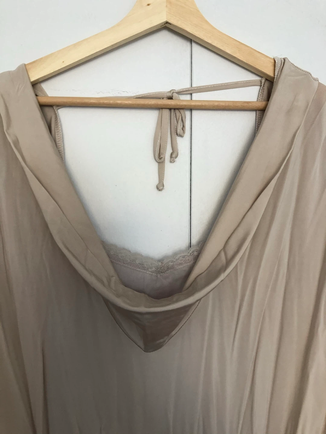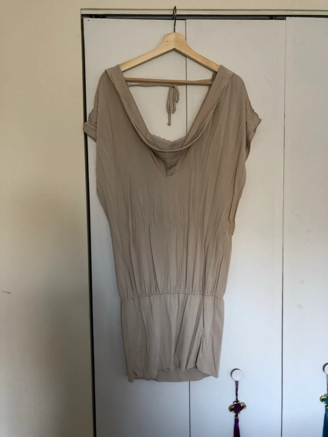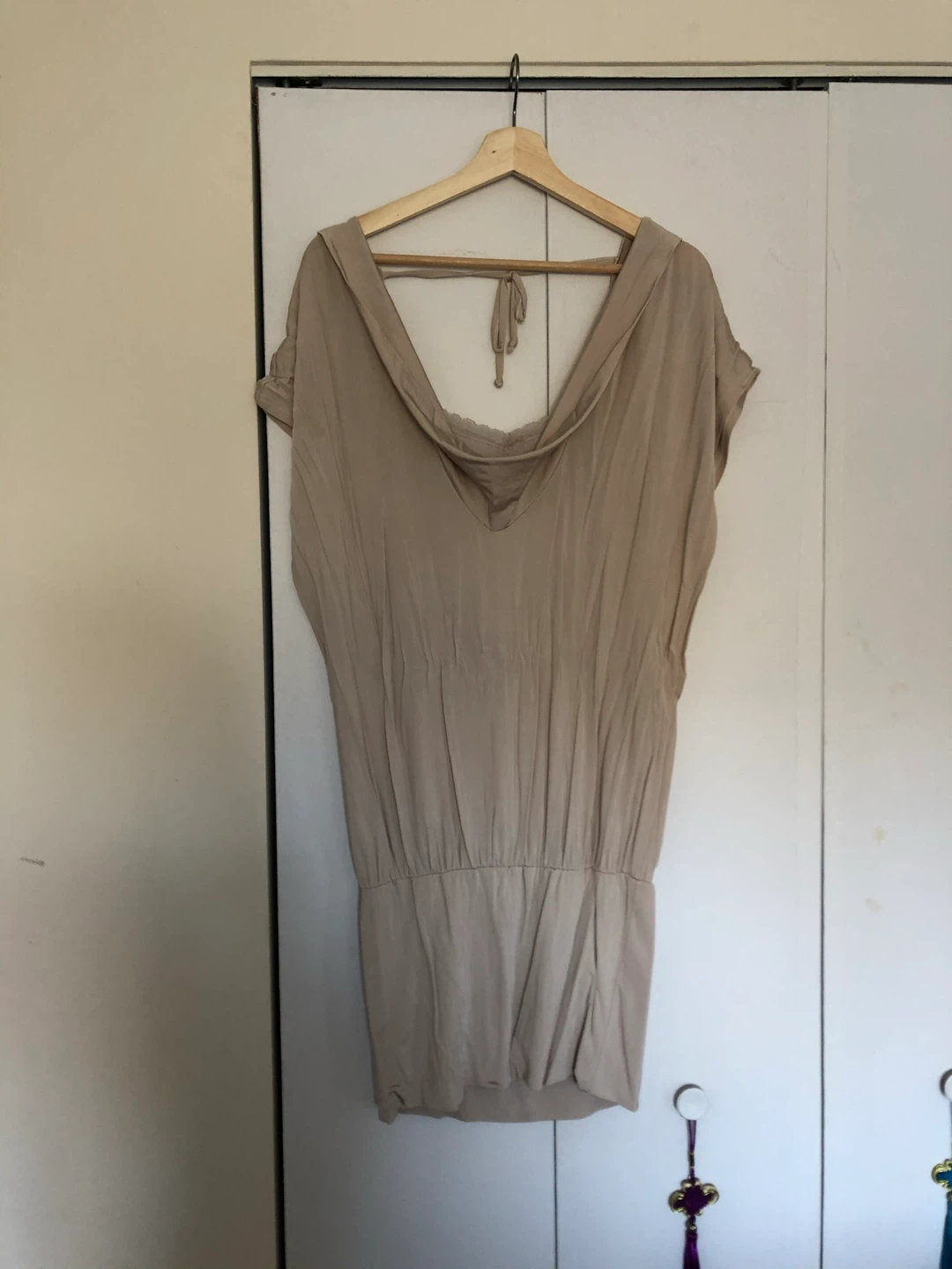 It features a unique cowl neck and a cinched waist for a flattering fit