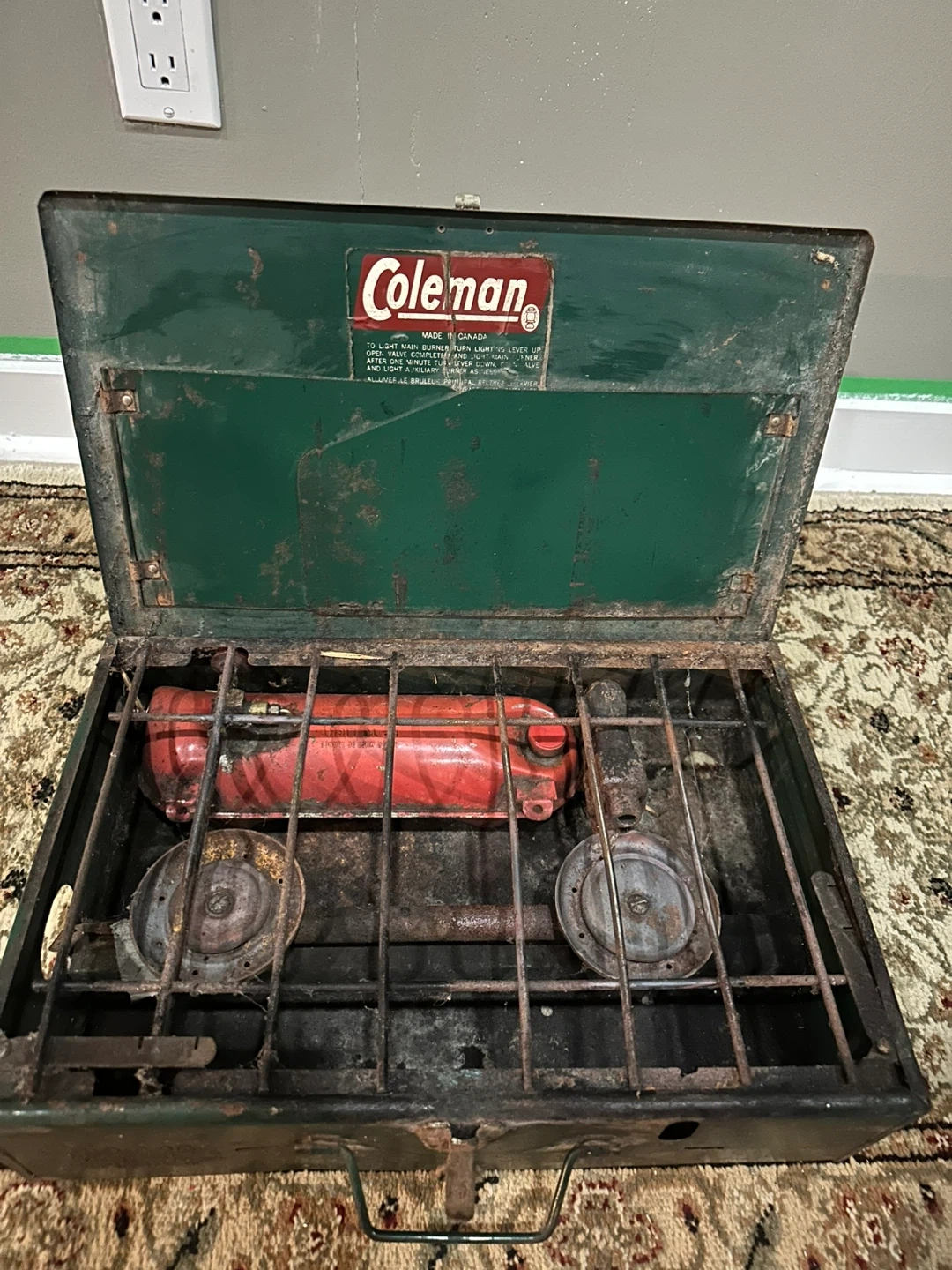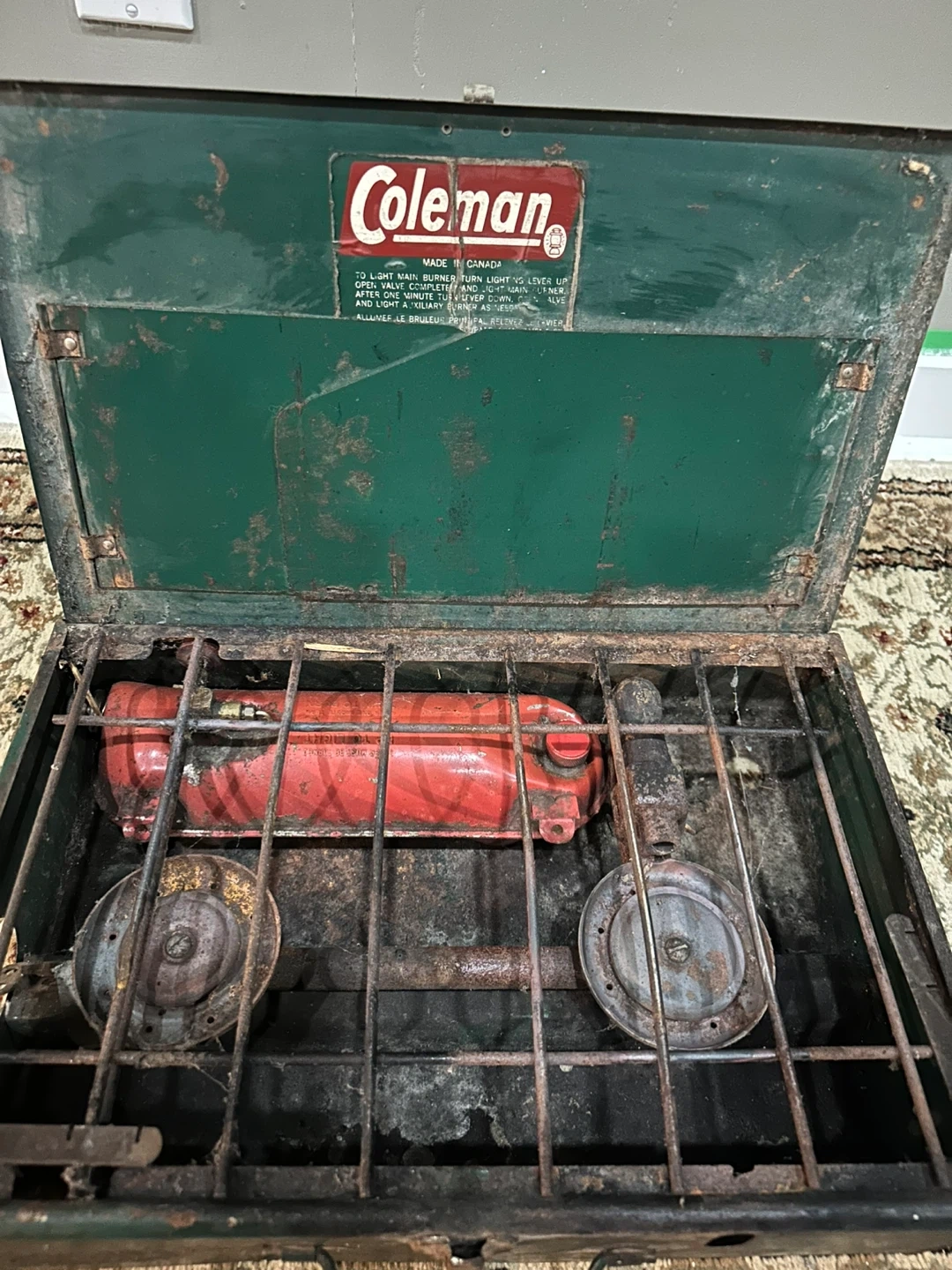 Selling a vintage Coleman 2-burner camp stove, made in Canada. It shows signs of wear and use, but it's a classic piece of camping equipment. Perfect for outdoor adventures or as a collector's item!