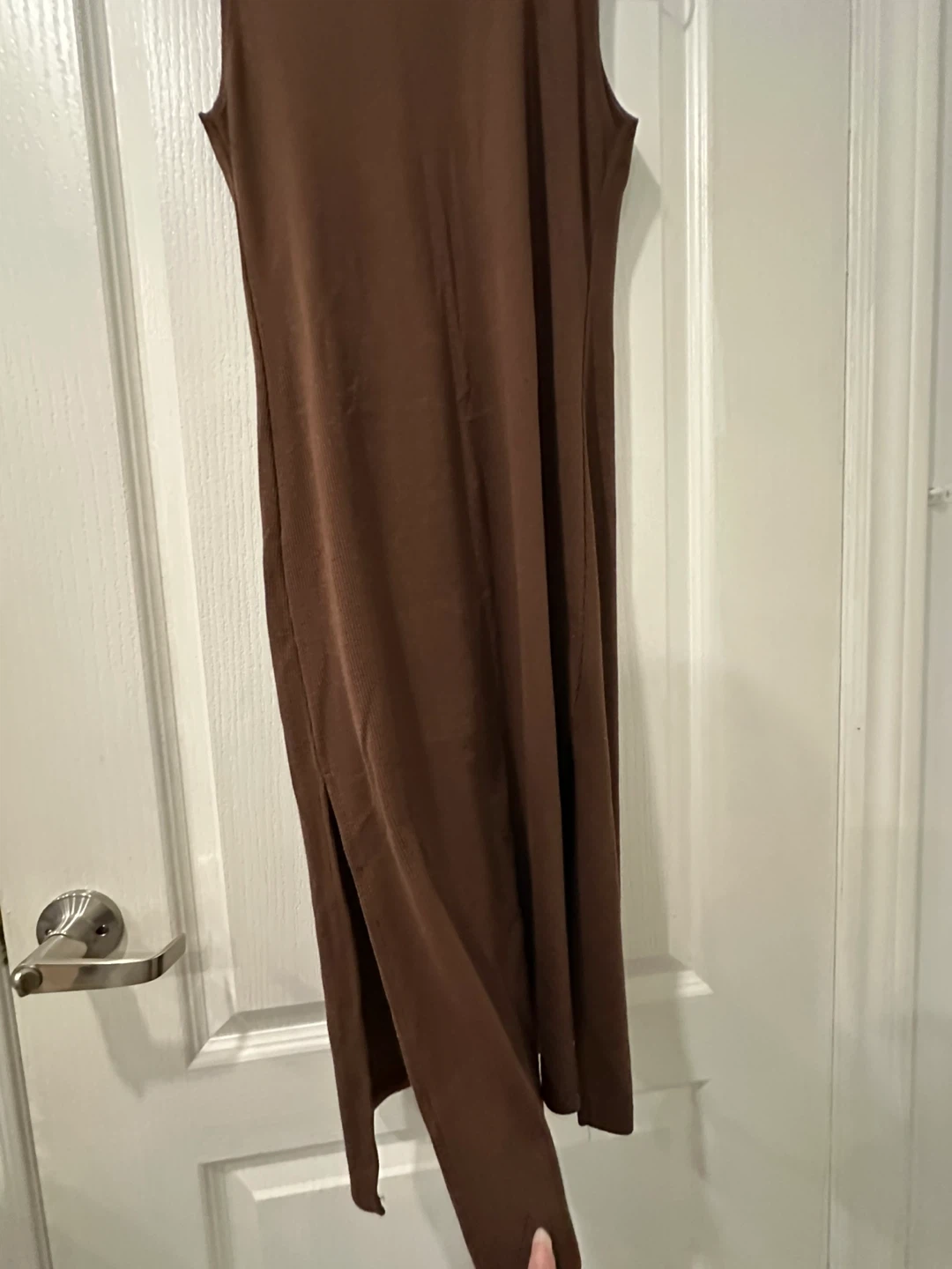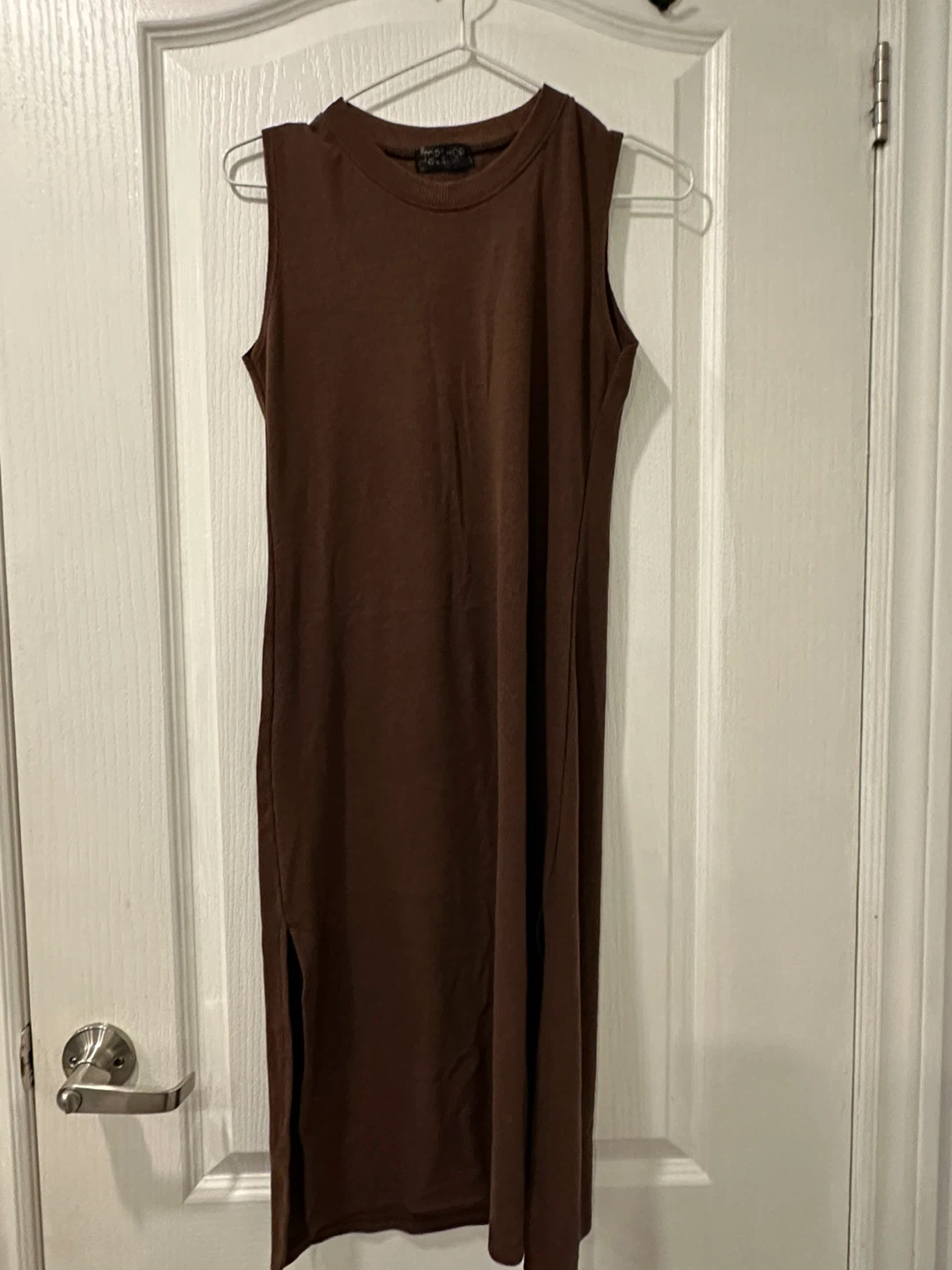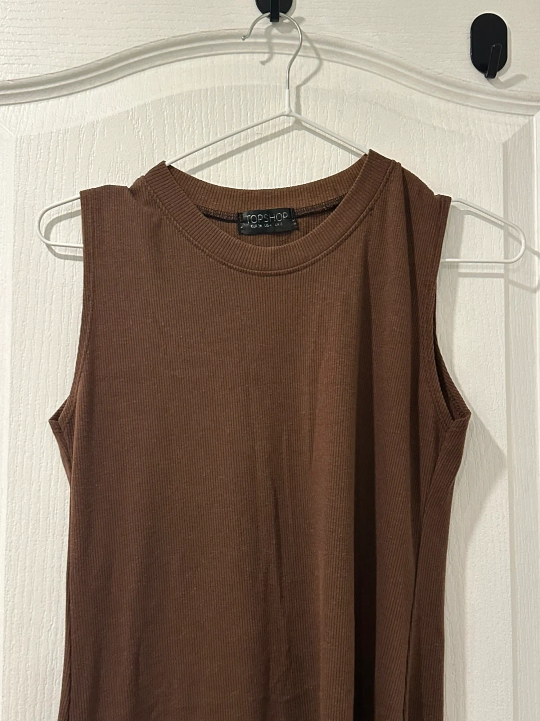 Selling a Topshop brown sleeveless dress. It's a ribbed material and has a slit on one side. Great for summer!