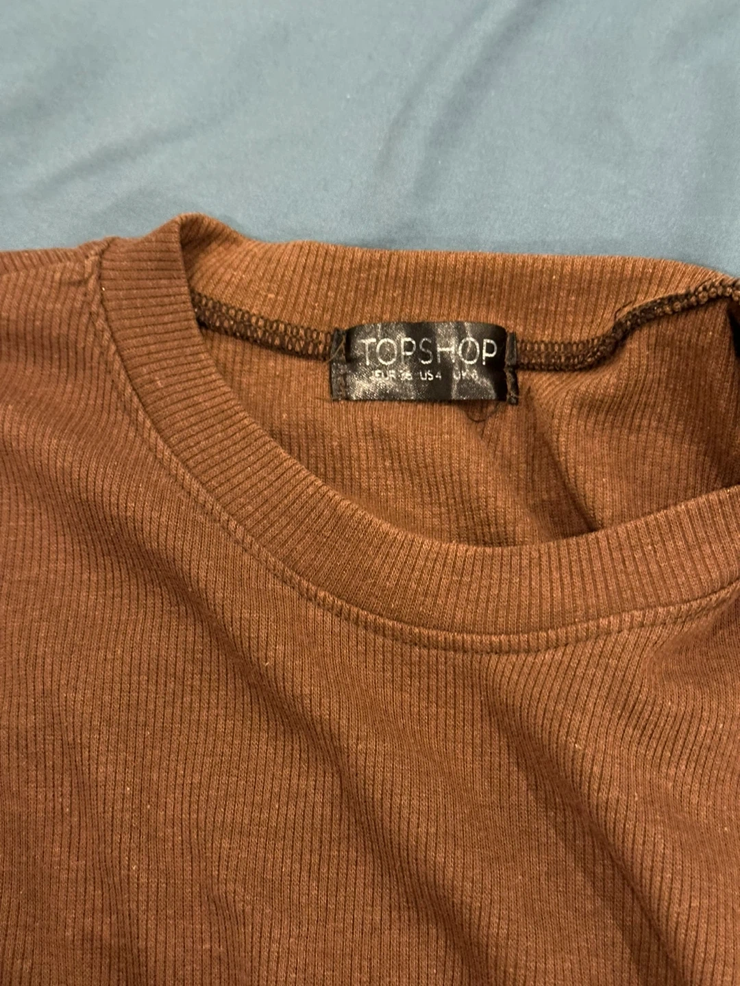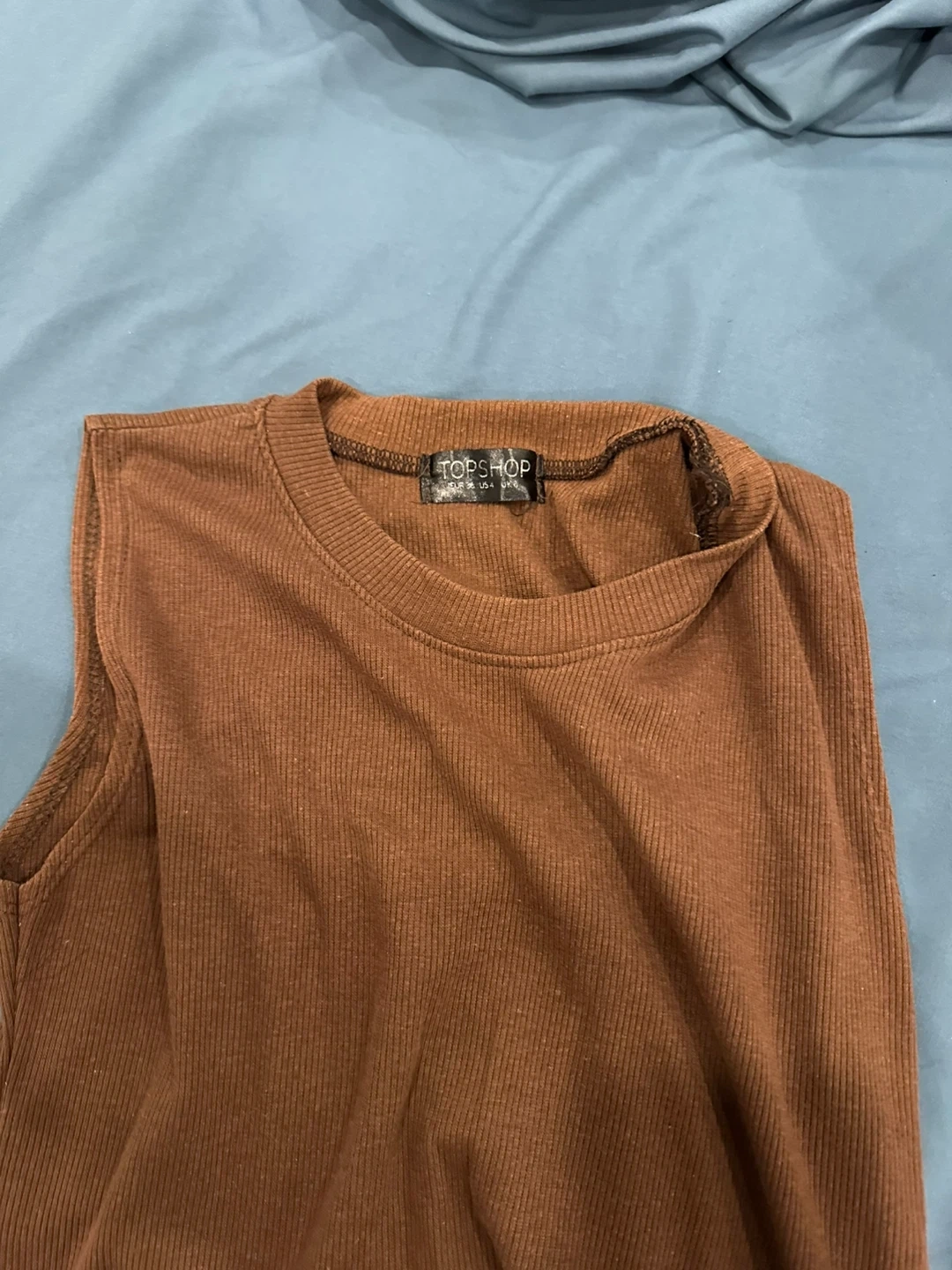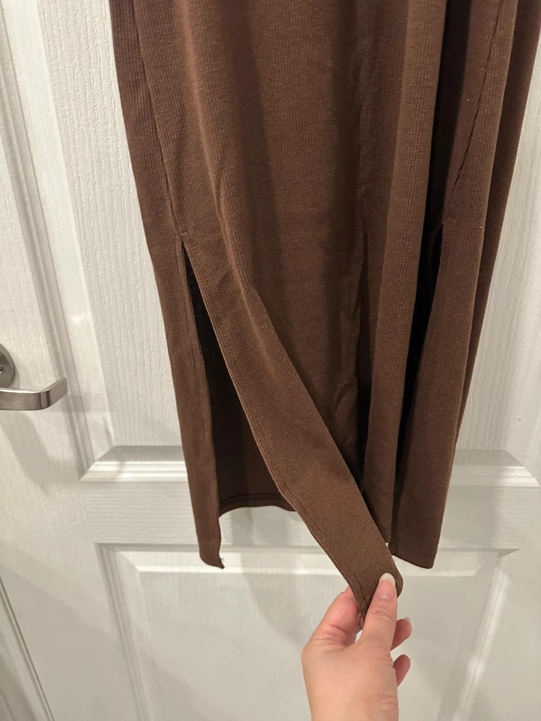 Selling a Topshop brown sleeveless dress. It's a ribbed material and has a slit on one side. Great for summer!
