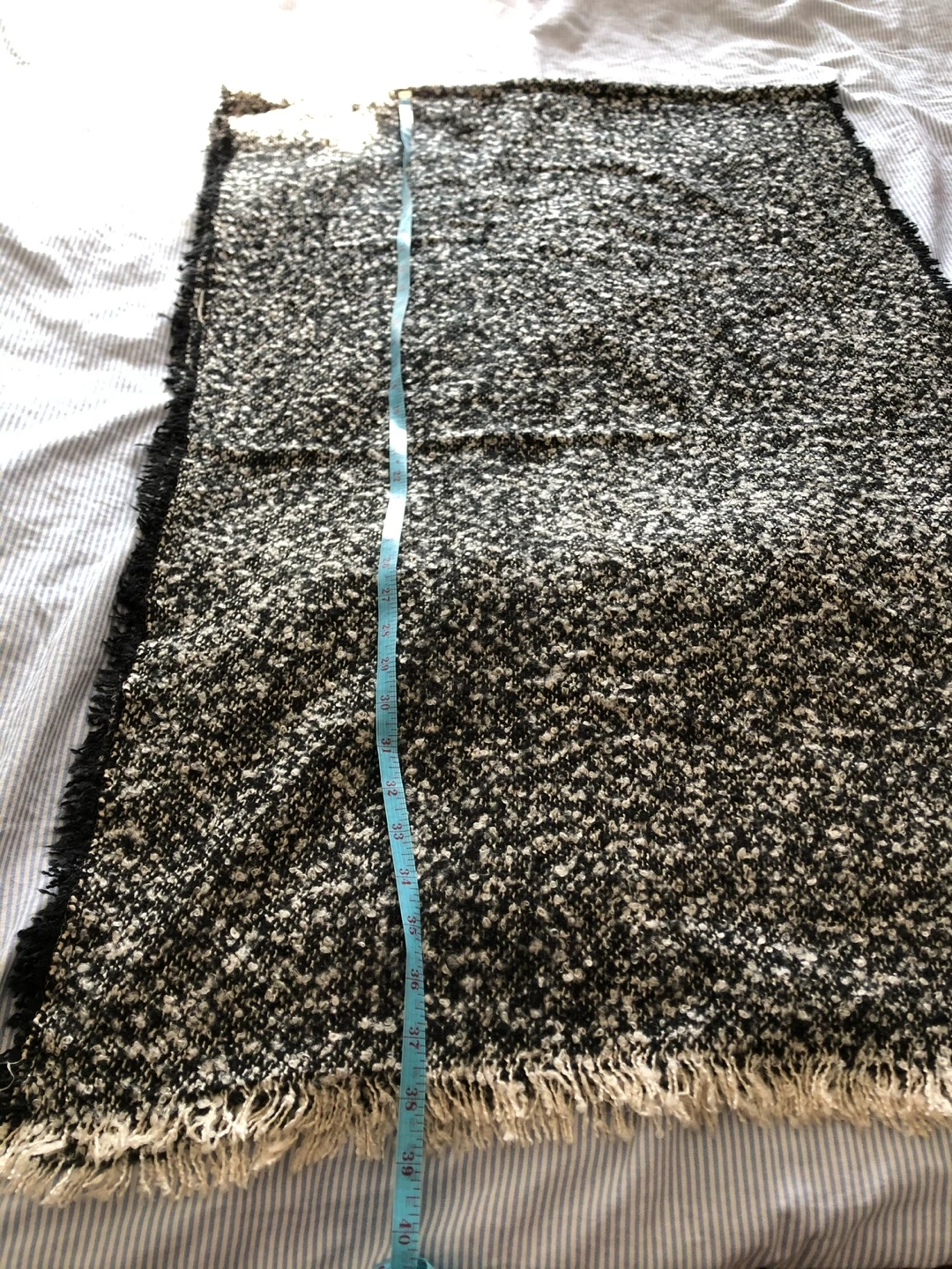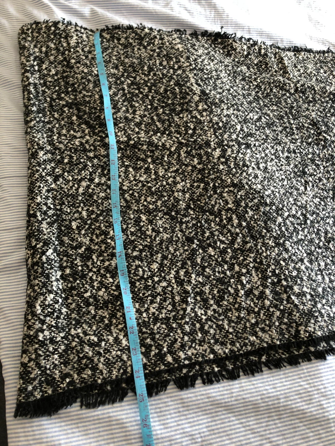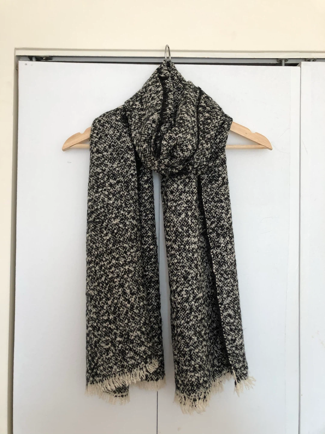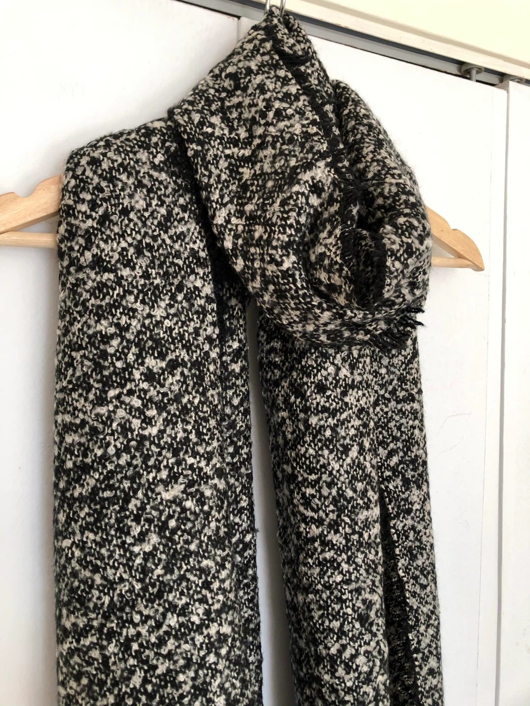 Here's a cozy black and white scarf! It's in great condition and ready to keep you warm. The material feels soft and comfortable. It measures approximately 68 inches long.