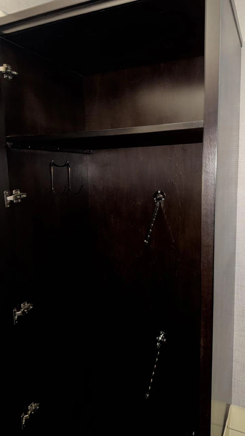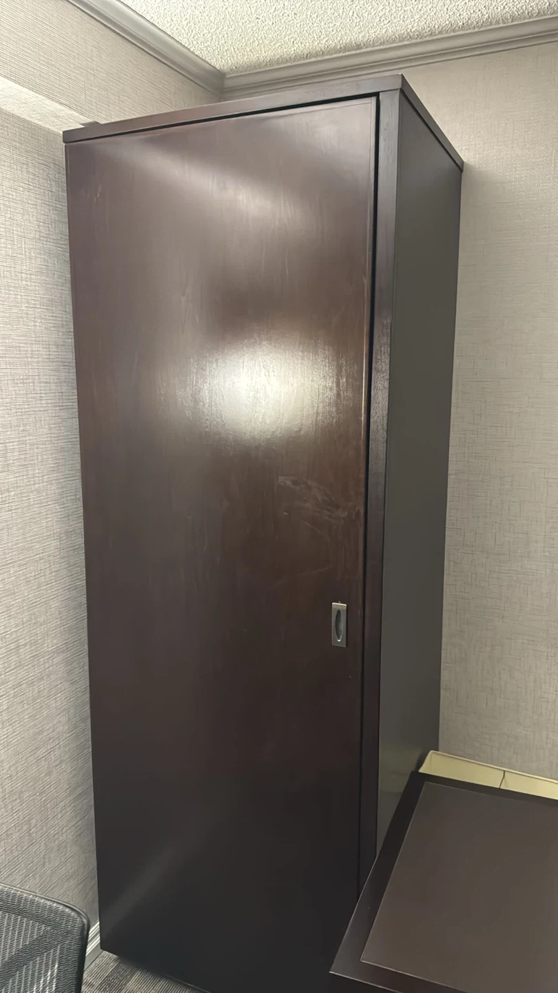 Selling a dark brown wooden wardrobe. It has a sleek design and is perfect for adding extra storage space to any room. It's in good condition and ready to use.