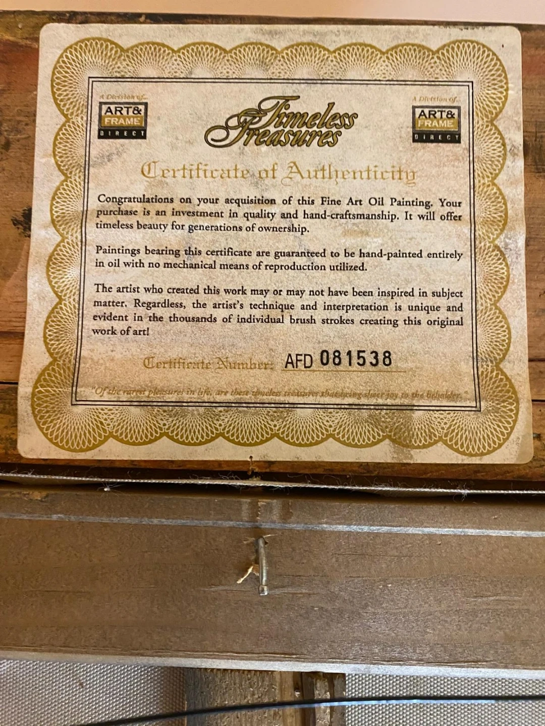 It's an Art & Frame Direct piece featuring a majestic lion. The frame is gold and ornate. It measures approximately 4 feet by 38 inches.