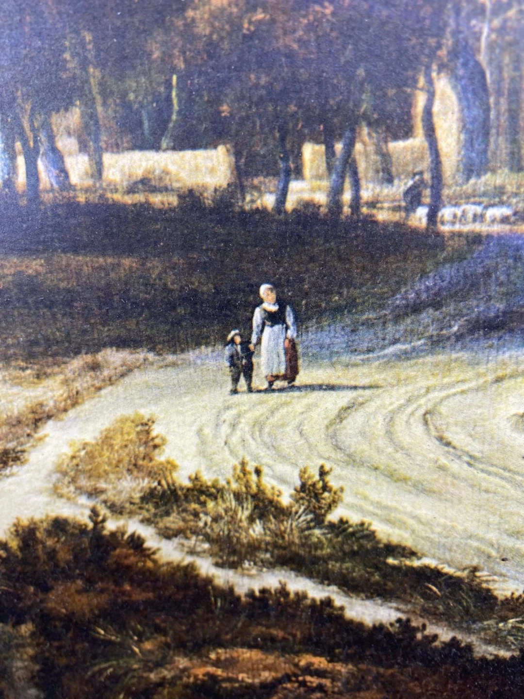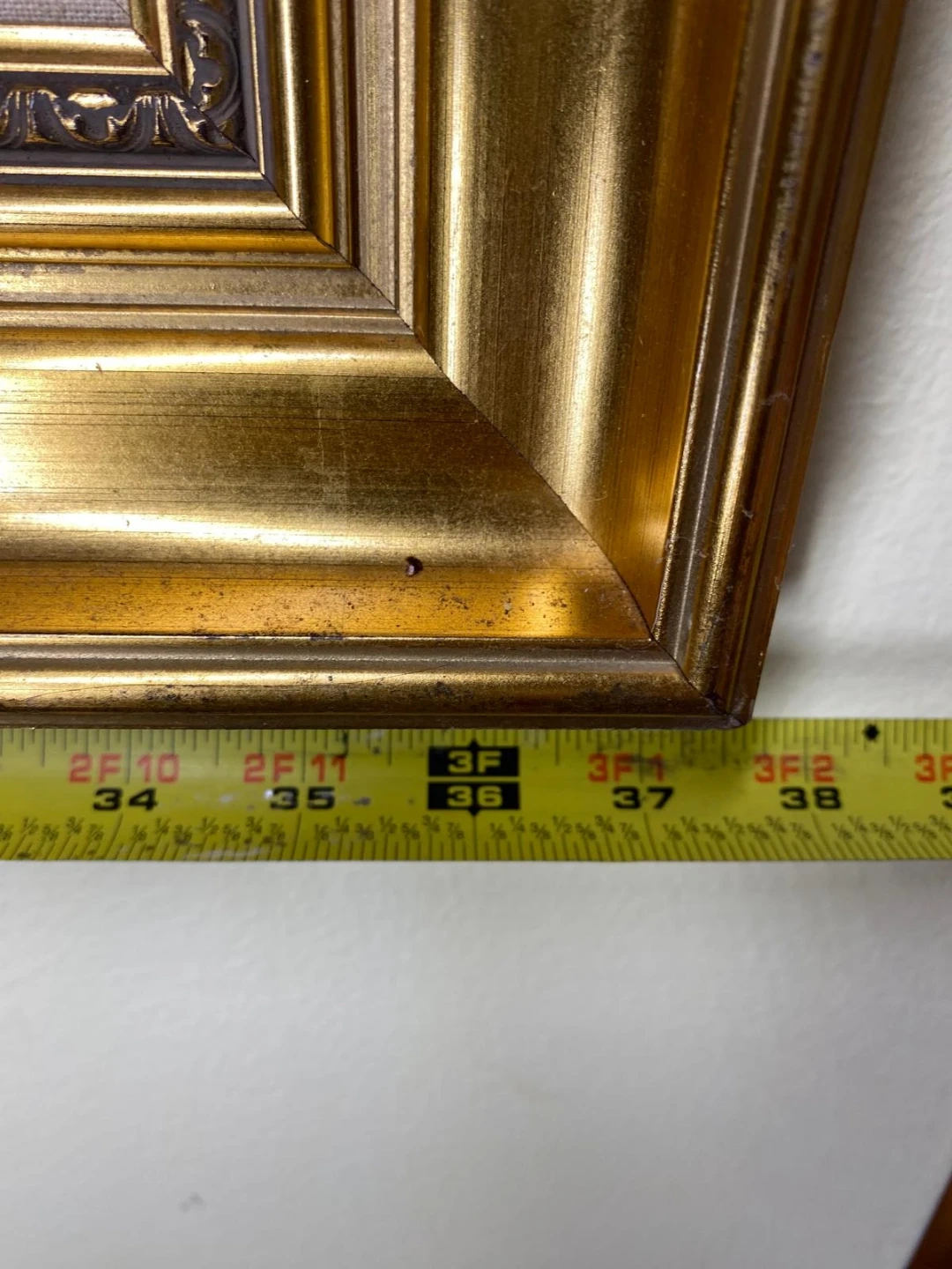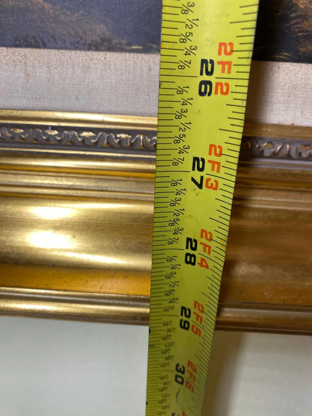 Selling a framed landscape painting. The frame is gold. The painting itself depicts a landscape with trees and people on a path. The frame measures approximately 37 inches in width and 27 inches in height
