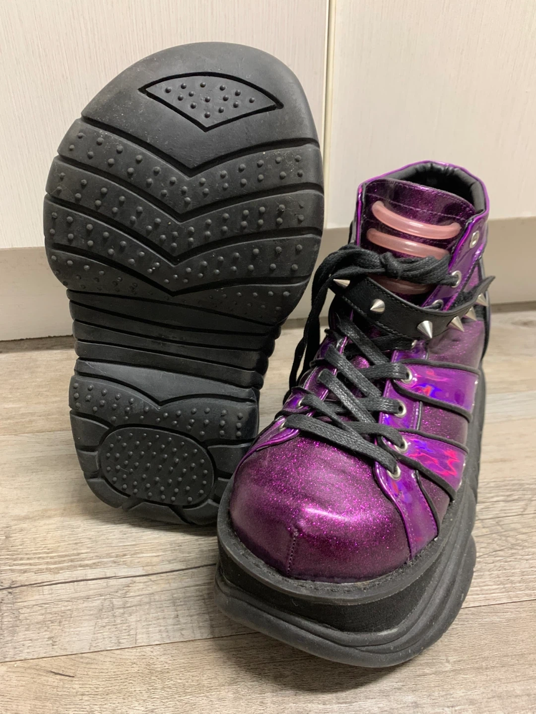 Glittery purple with black laces and studded detailing.