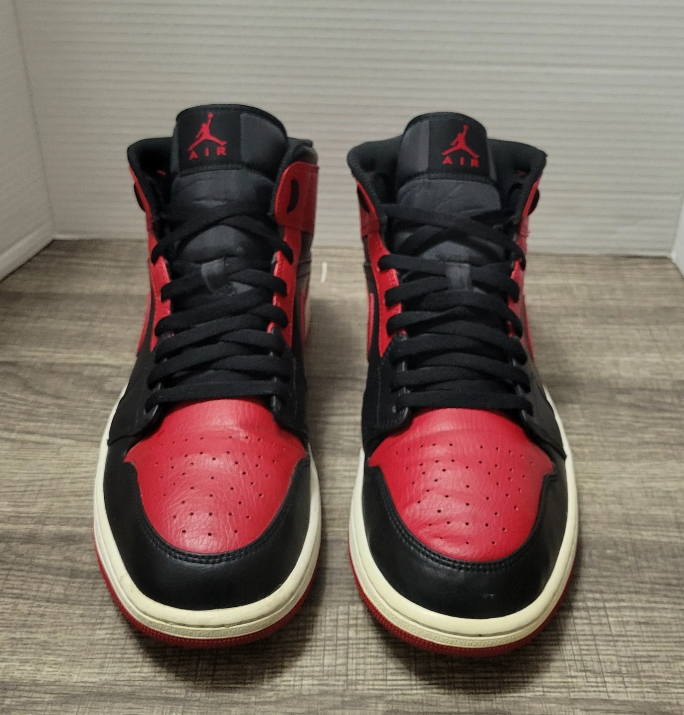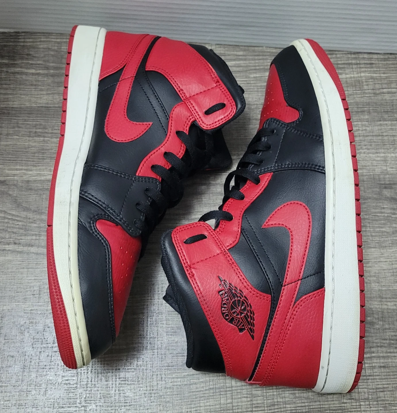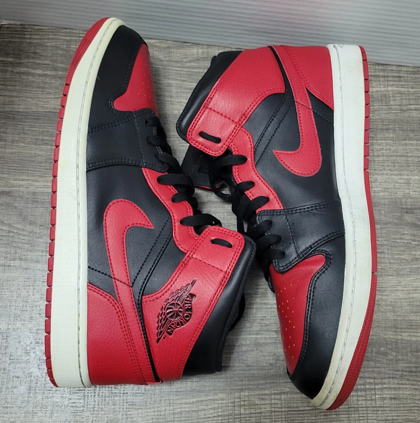 Selling a pair of Air Jordan 1 Mid sneakers in black and red. These are a US size 12. They have some signs of wear, but are still in great condition!