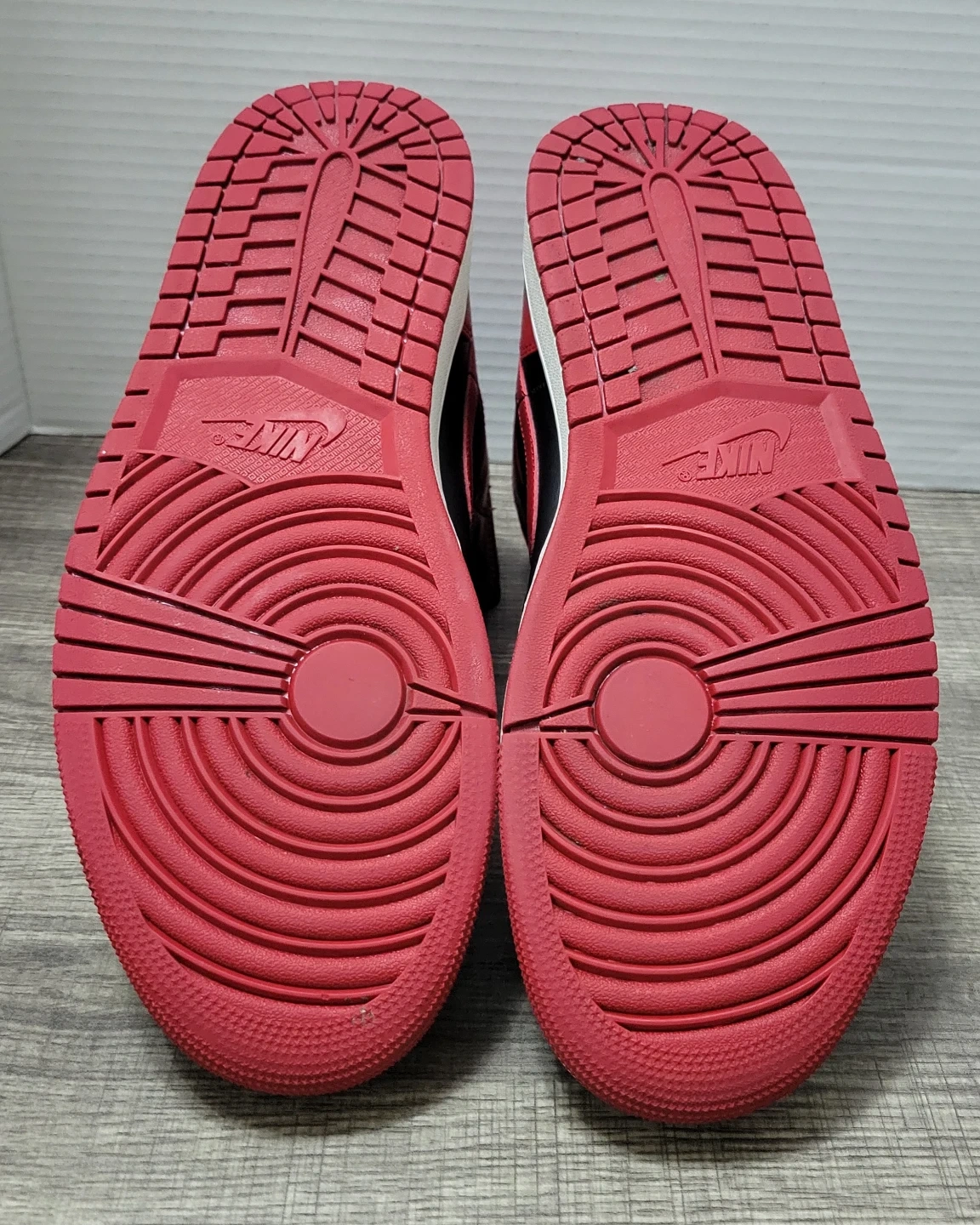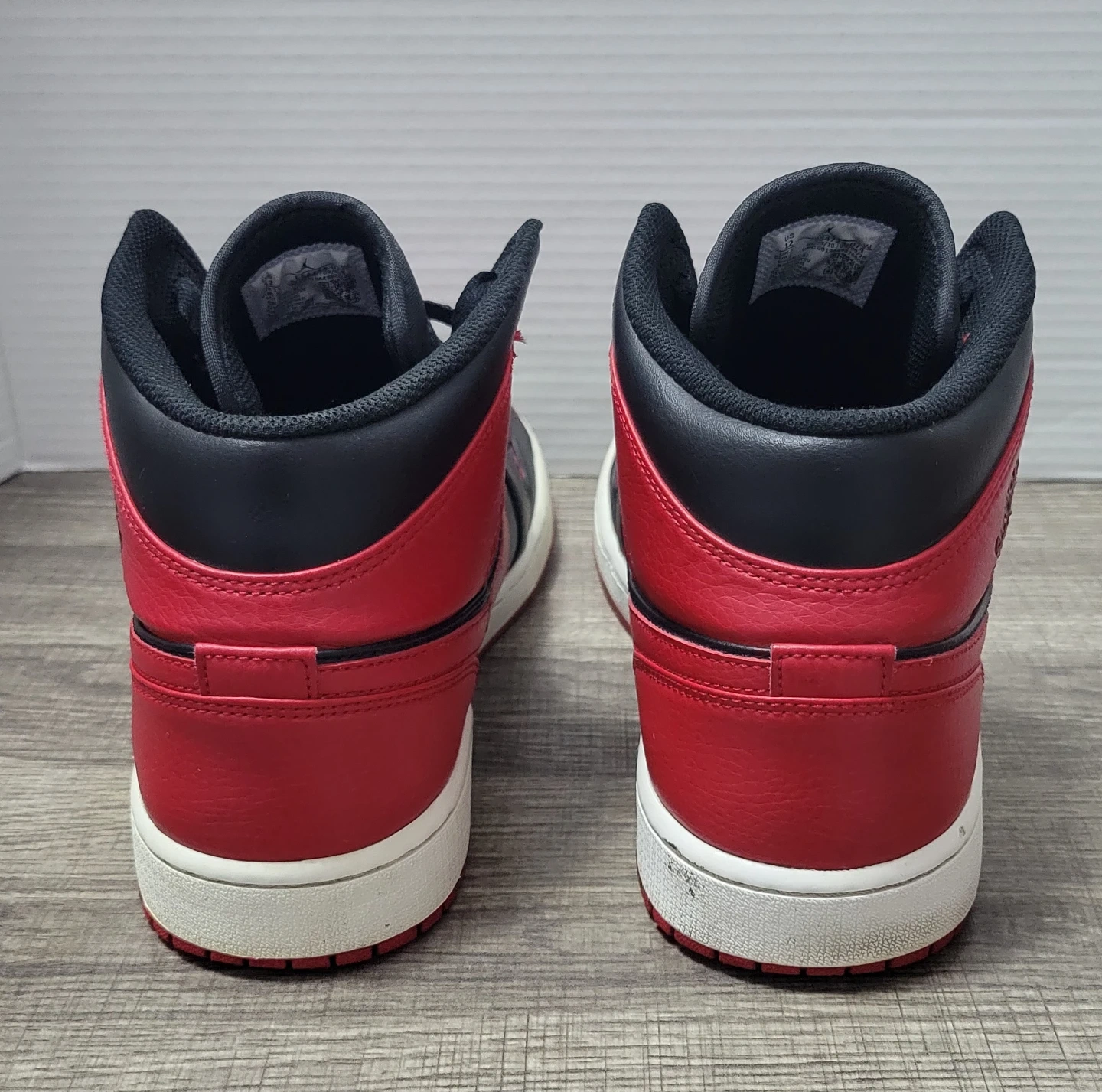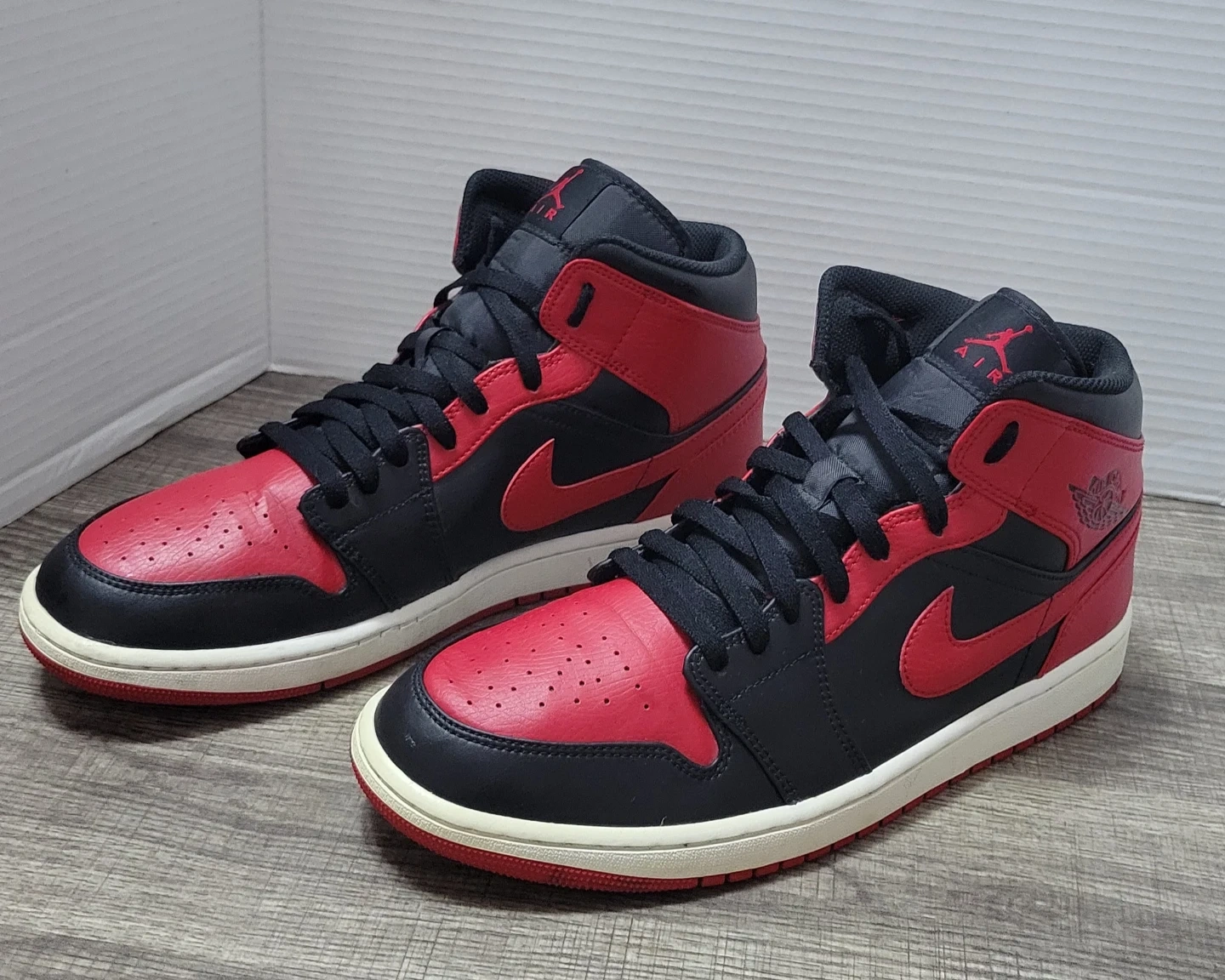 Selling a pair of Air Jordan 1 Mid sneakers in black and red. These are a US size 12. They have some signs of wear, but are still in great condition!