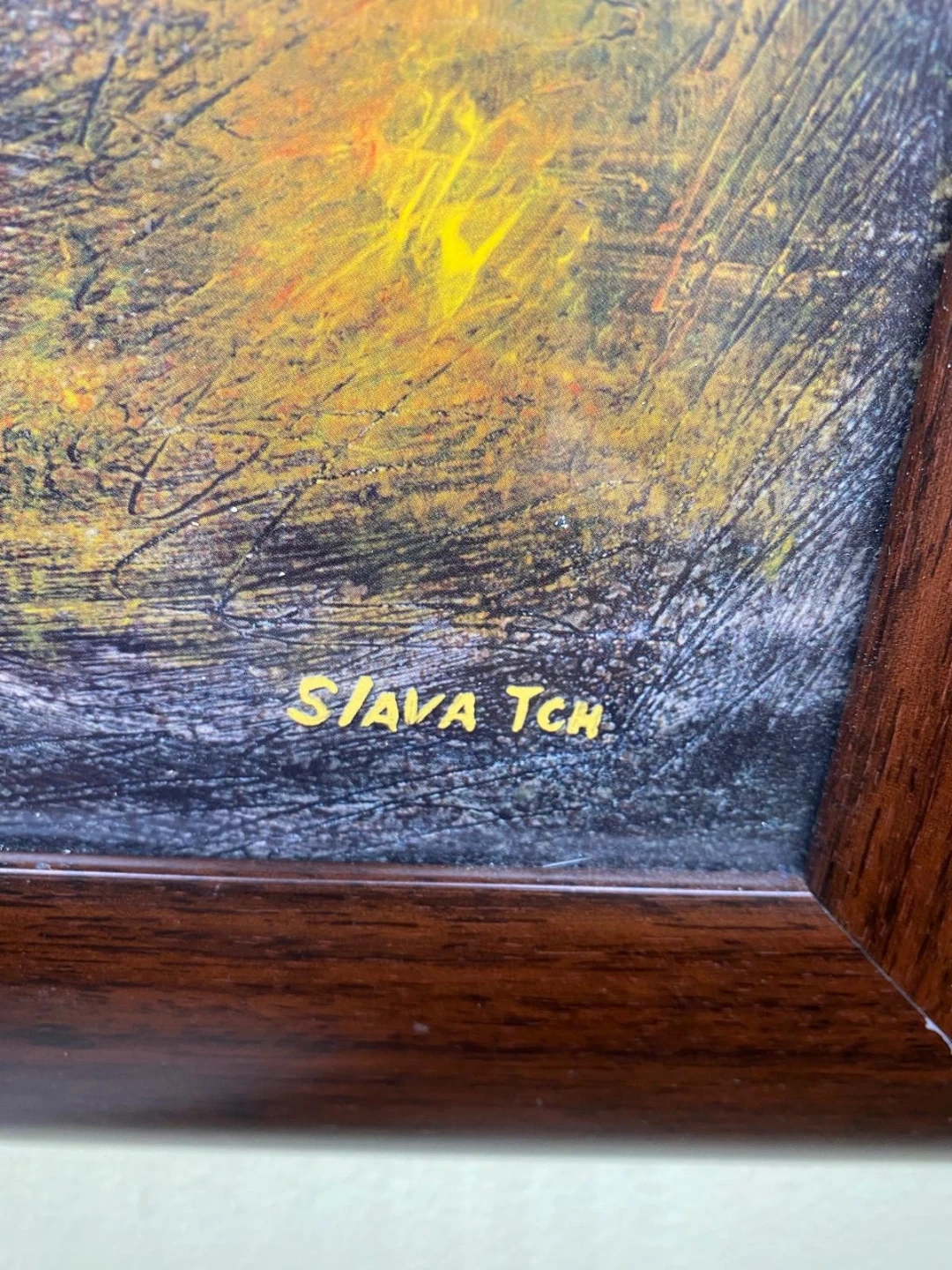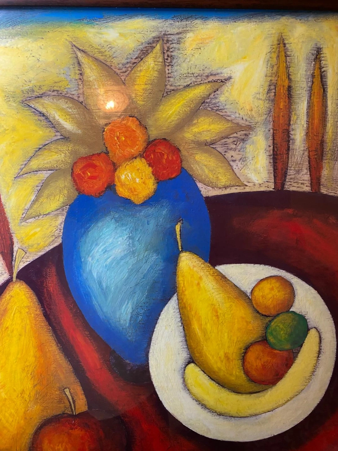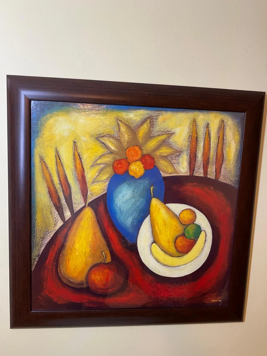 Selling a framed still life painting by Slava Tch. The painting features a vibrant display of fruits and a blue vase. It measures approximately 28 inches by 34 inches.