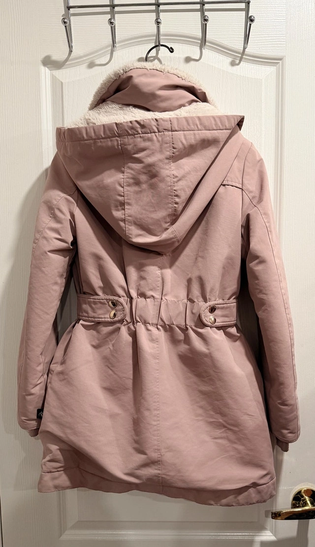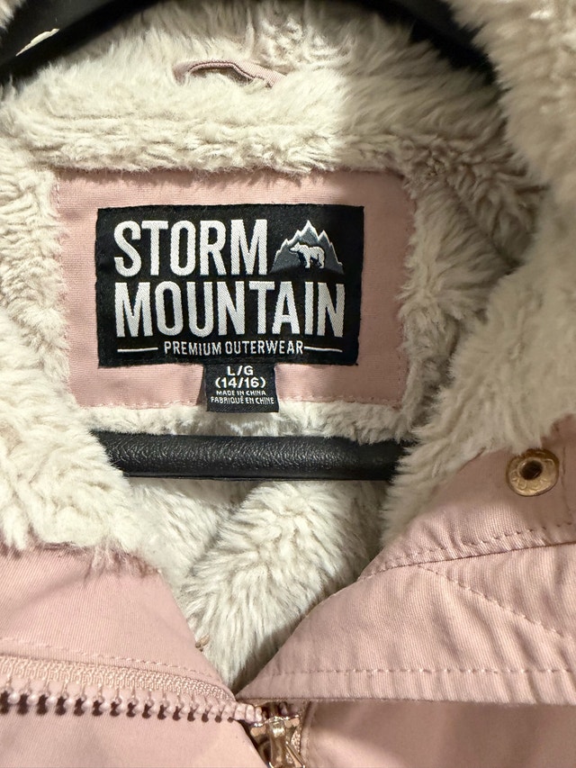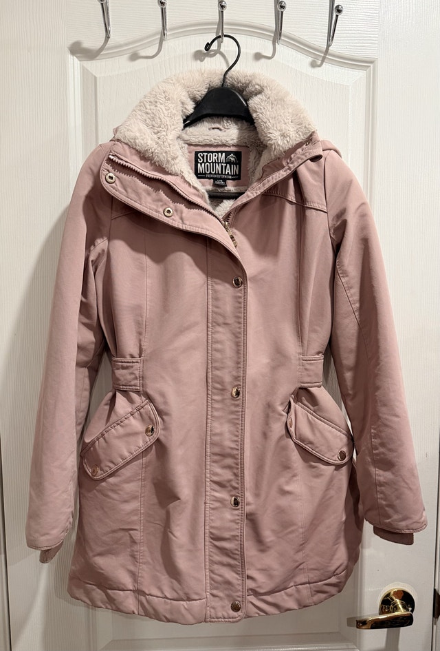 Stay cozy in this Storm Mountain winter jacket, perfect for braving the Canadian weather! This stylish jacket, in a lovely shade of pink, features a warm, faux-fur lined hood, a button-up front and a flattering belted waist. This jacket is in excellent condition, ready to keep you warm and stylish all winter long. Details: * Brand: Storm Mountain * Size: Large (14/16) * Colour: Pink * Material: Shell 100% Cotton, Faux Fur 100% Polyester Looking for a fabulous jacket? This Storm Mountain is priced to sell! If you see this ad, it's still available!