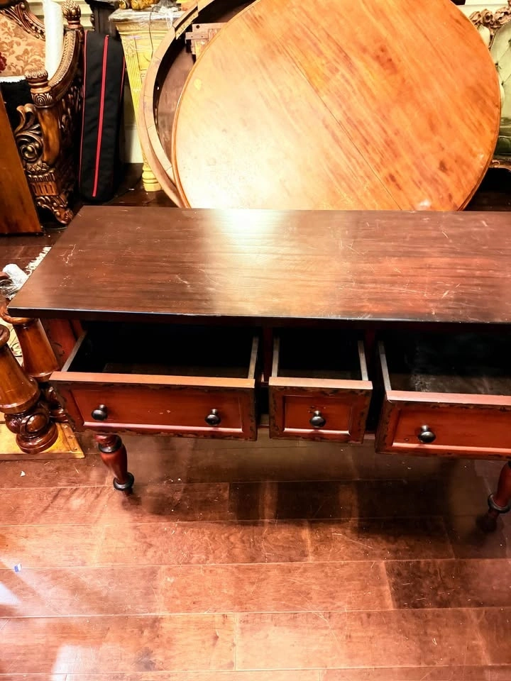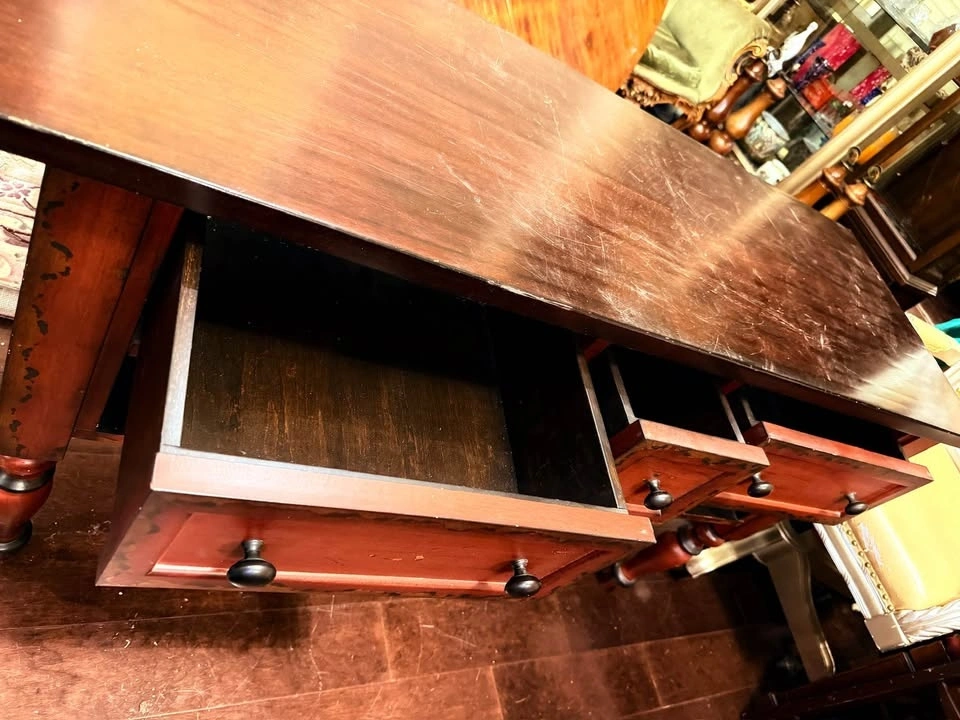 Rich reddish-brown solid wood with a darker stained top, featuring a classic vintage style and turned legs.