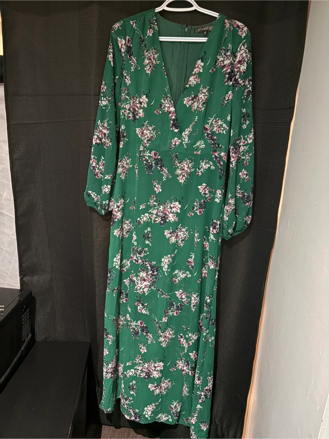 Selling a lovely green floral dress from Dynamite! It features a flattering V-neck and long sleeves, perfect for transitioning between seasons. The dress is in great condition and ready for a new home in your wardrobe