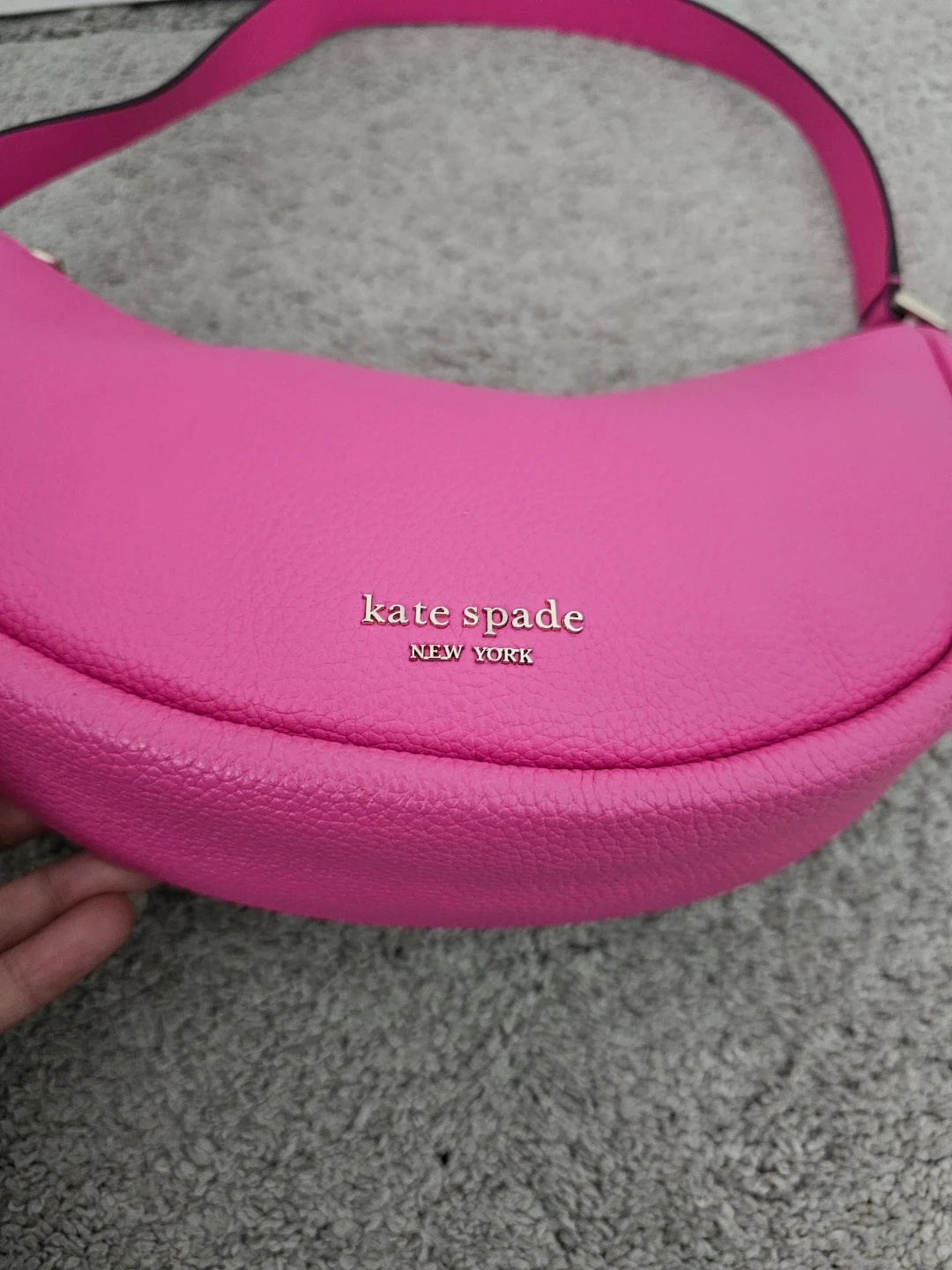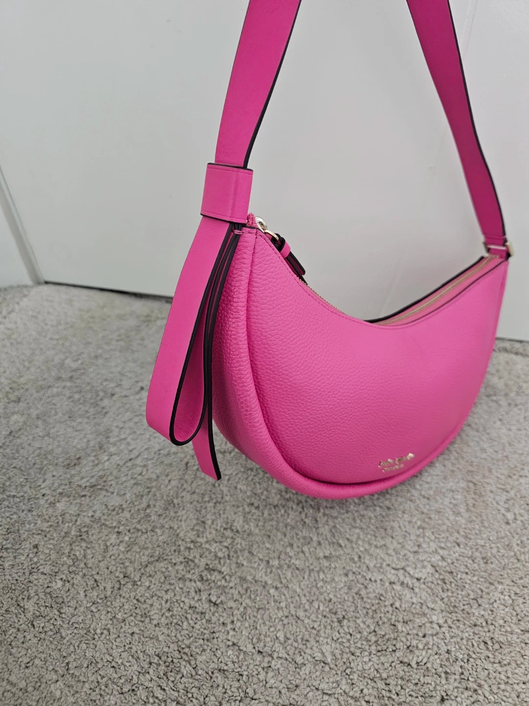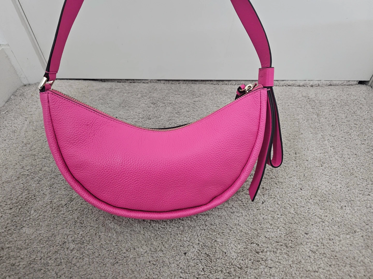 This is a Kate Spade New York crescent bag! It's a vibrant pink colour and made of leather. It's in great condition and ready for a new owner!