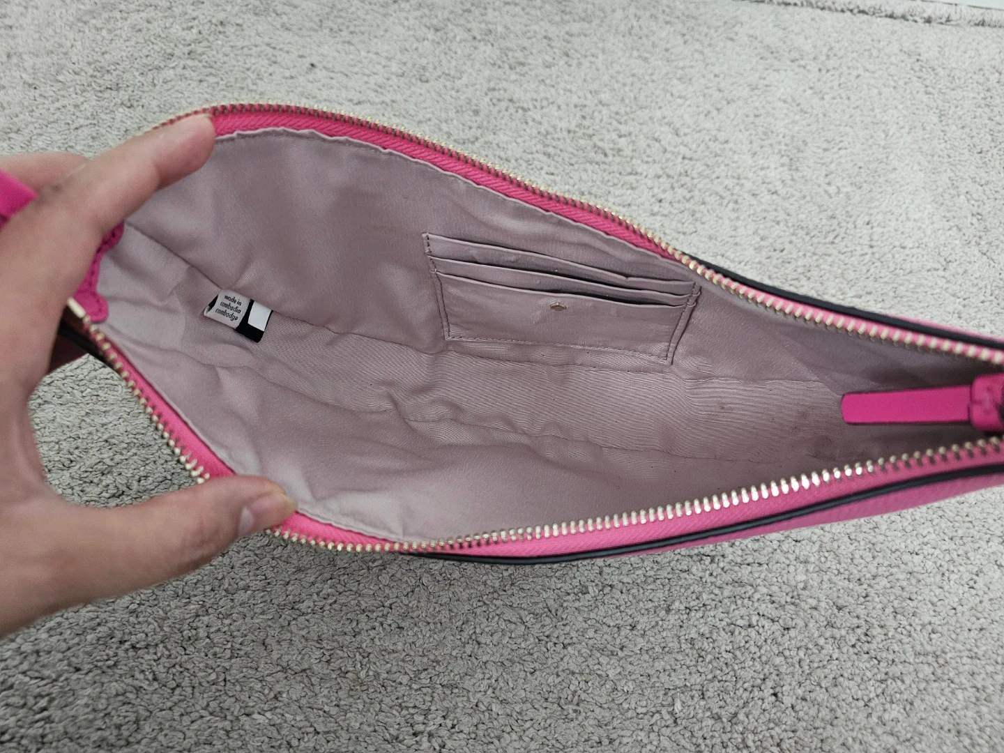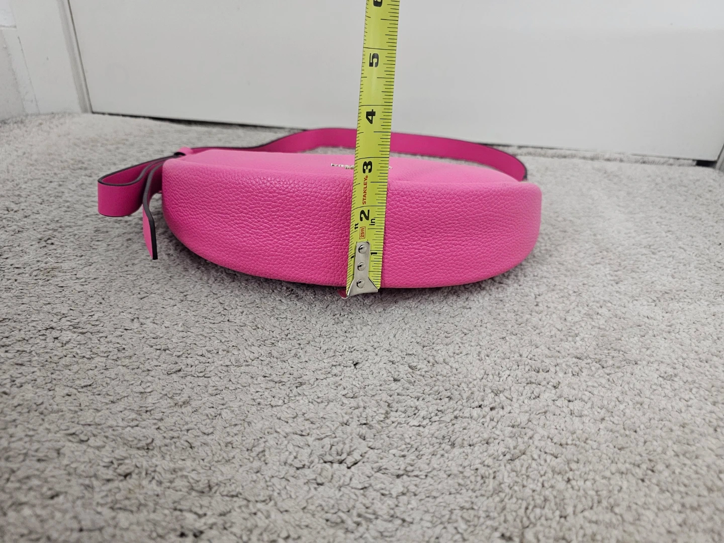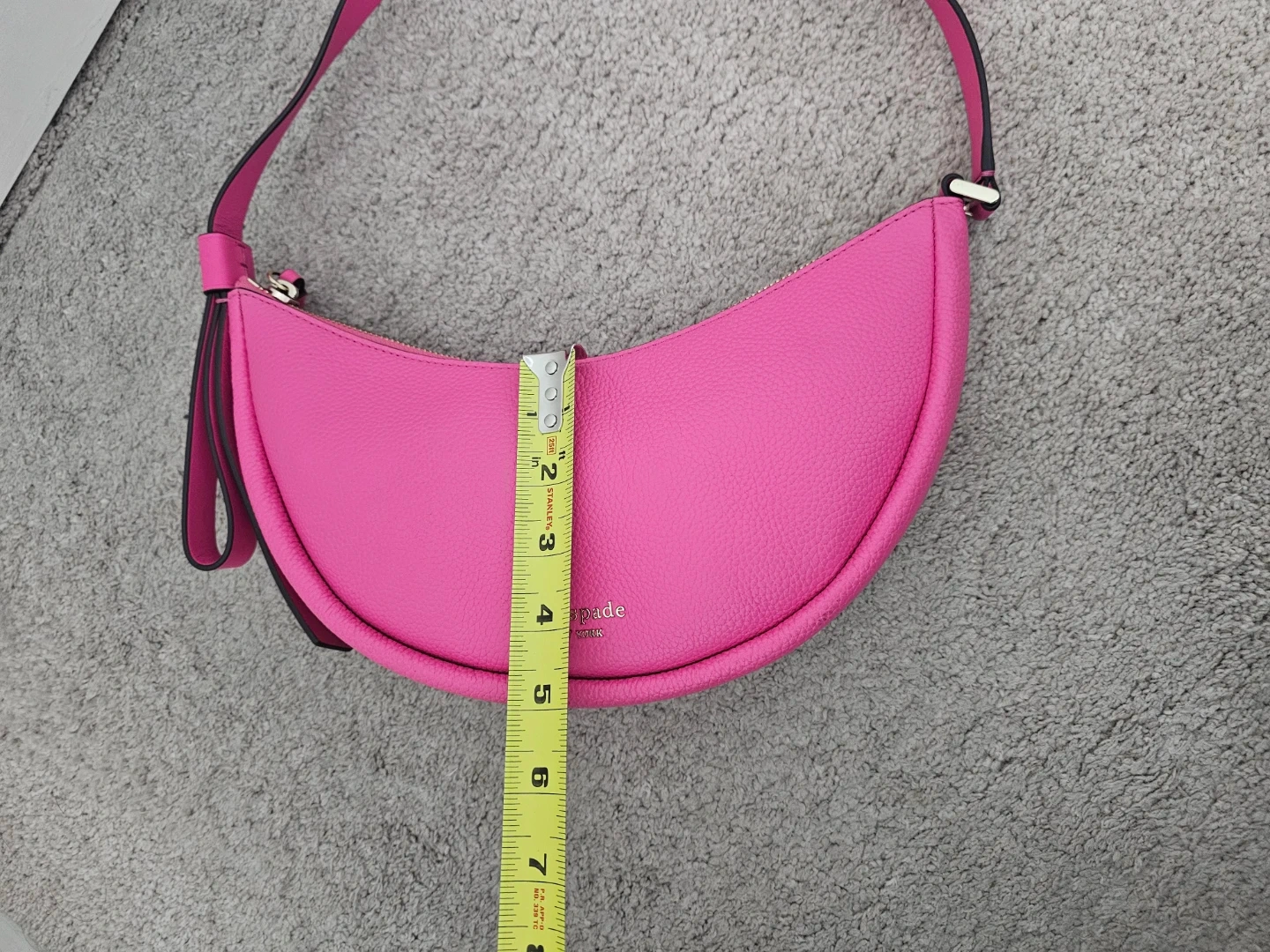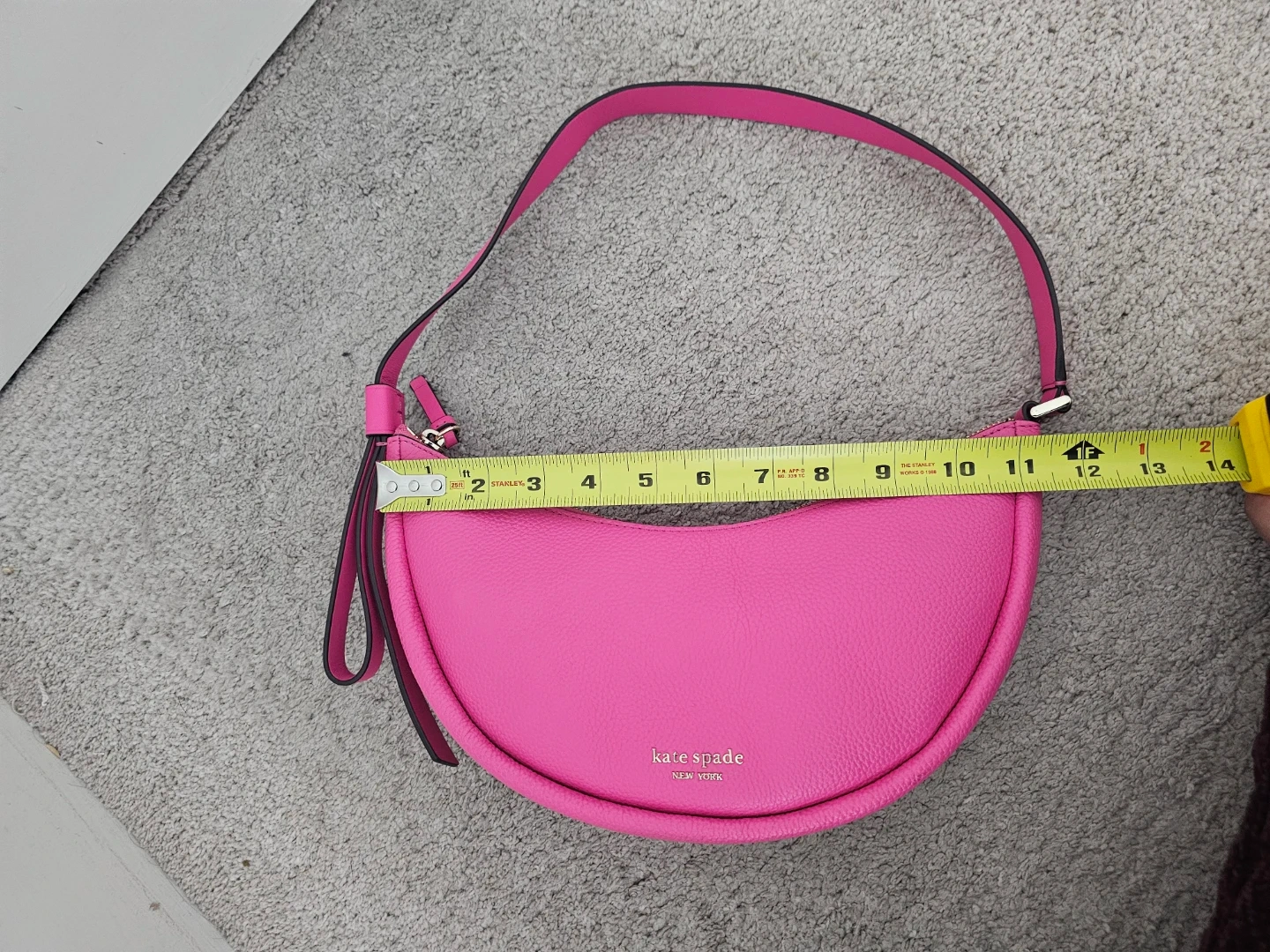 This is a Kate Spade New York crescent bag! It's a vibrant pink colour and made of leather. It's in great condition and ready for a new owner!