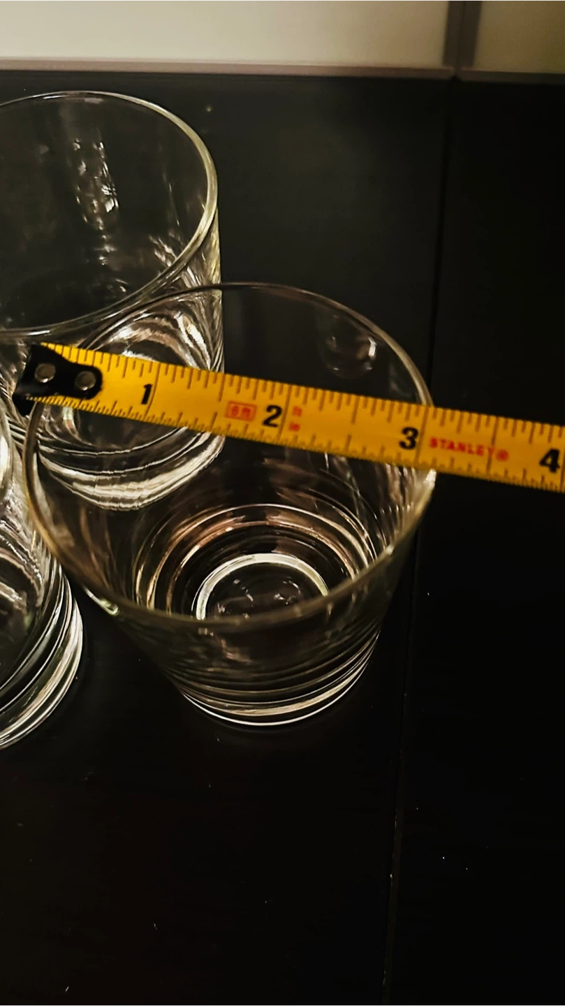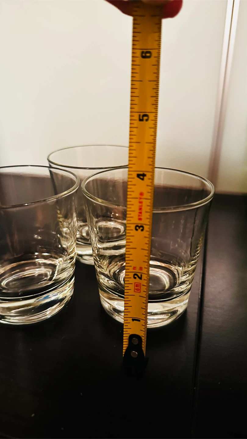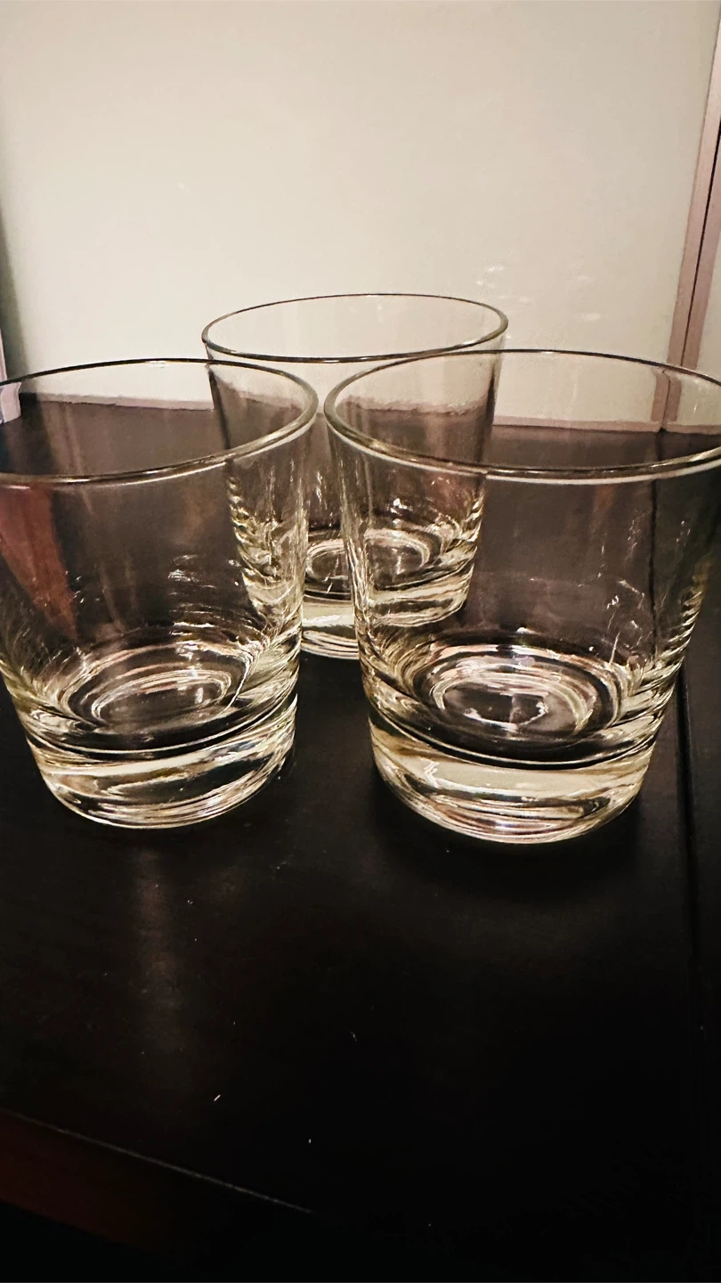 Selling a set of 3 clear glass tumblers! They are in great condition and perfect for everyday use. Each tumbler measures about 3 inches in diameter and stands approximately 3.5 inches tall. They're a simple and stylish addition to any kitchen or bar