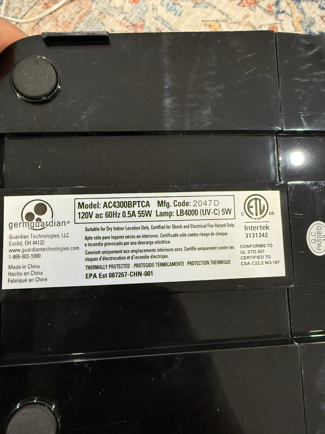 Selling a GermGuardian air purifier, model AC4300BPTCA. It's suitable for dry indoor locations only and certified for shock and electrical fire hazard only. It uses a 120V ac 60Hz 0.5A 55W lamp, LB4000 (UV-C) 5W.