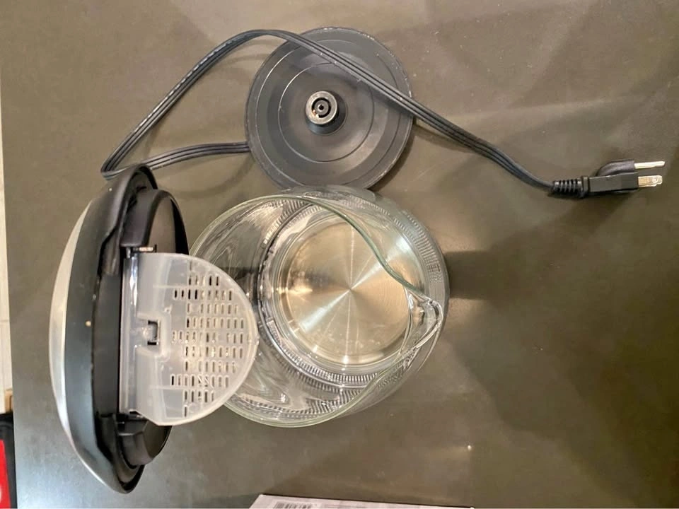 Great condition 1.7L cordless glass kettle with stainless steel base and heating element. Has measurement markings on the side. Comes with charging dock. Box included.