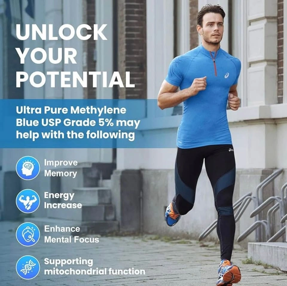Pharmaceutical Grade Purity – Methylene Blue drops made with 99.99% pure methylene blue for humans, formulated with USP grade quality. High 5% Concentration – Potent 5% strength means fewer drops per use compared to lower-dose options, delivering more value from every 120 mL bottle. Simple & Clean Formula – Only methylene blue and distilled water, no fillers or unnecessary additives, ideal for daily wellness routines. Dark Glass Bottle with Dropper – Amber-style glass packaging reduces light exposure while the precision dropper ensures accurate and consistent dosing. Supports Active Lifestyles – Designed for students, professionals, and older adults seeking reliable, Methylene Blue Drops for daily support.