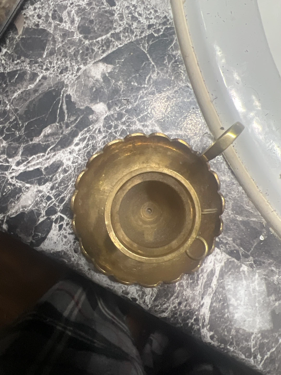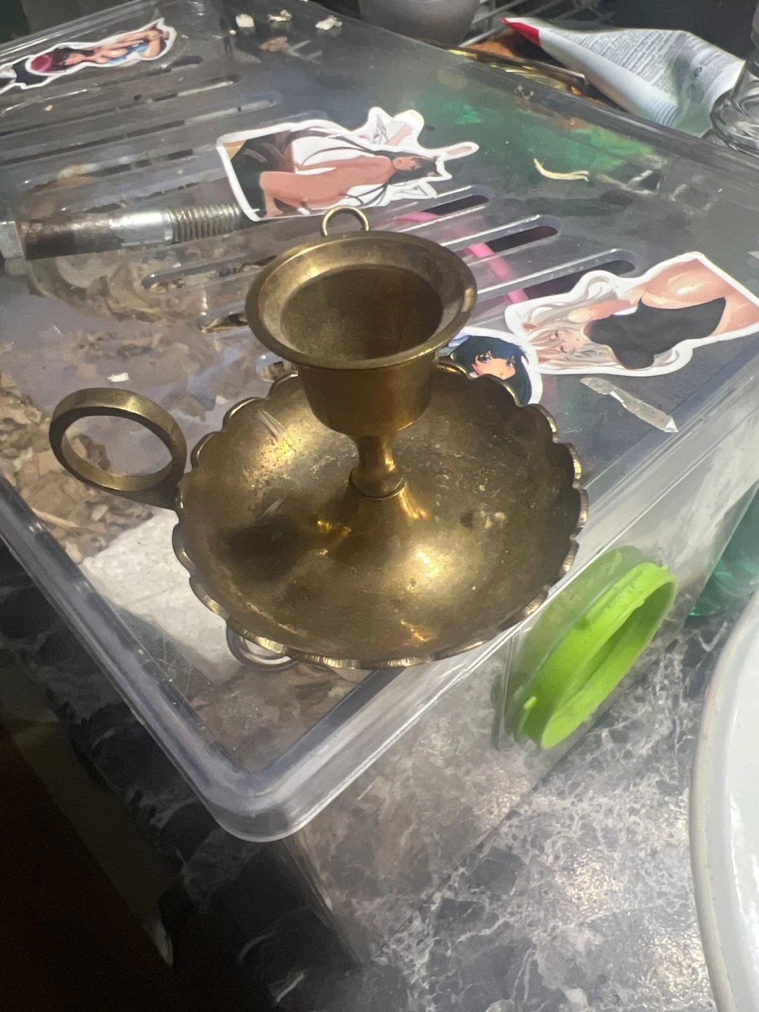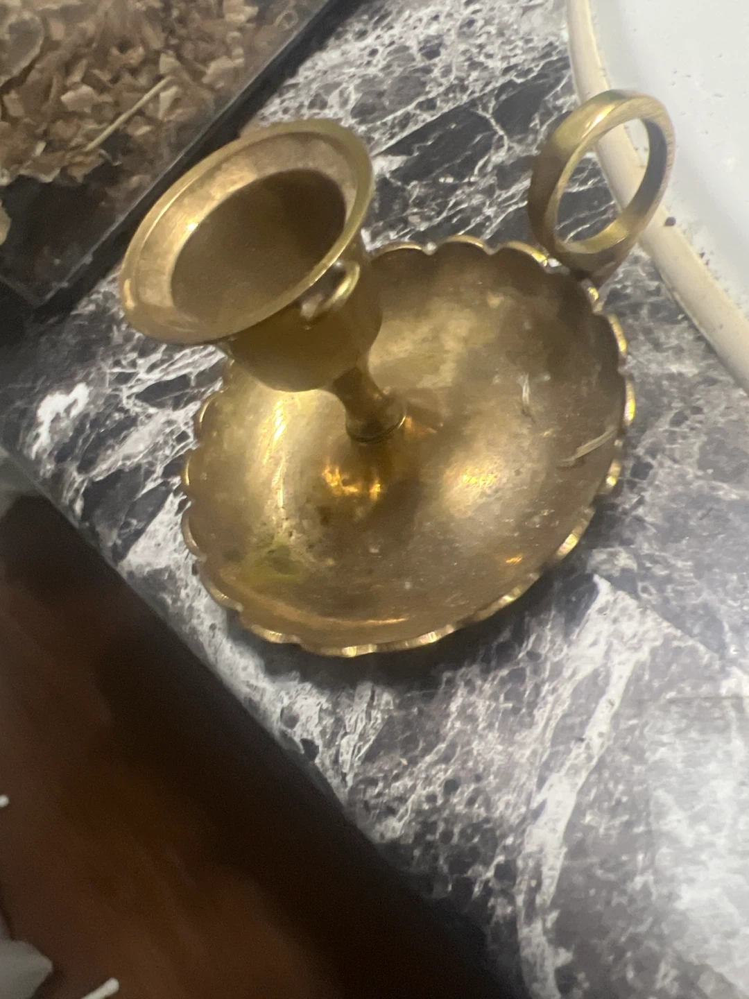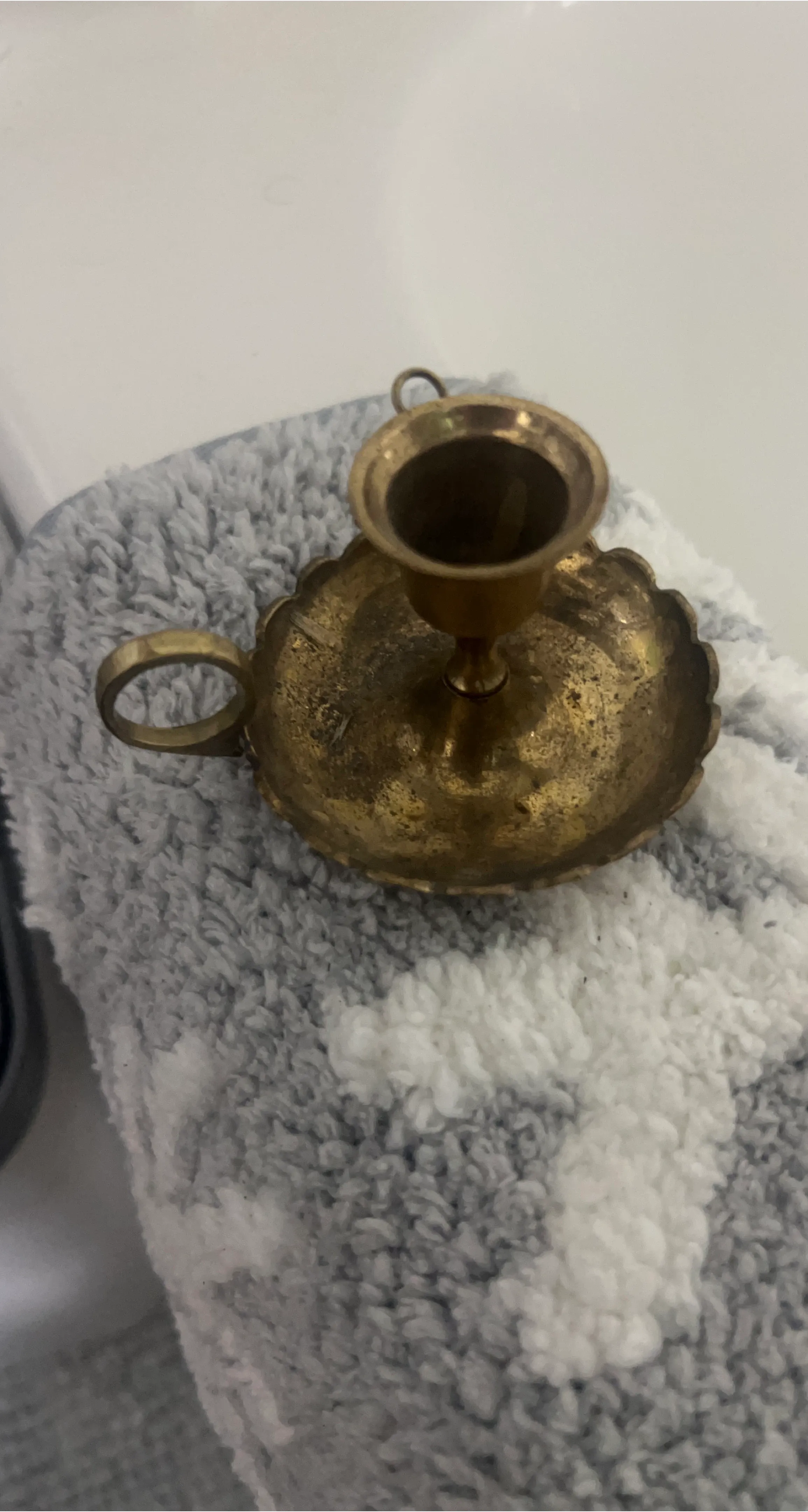 Here's a cute vintage brass candlestick holder. It has a handle and a unique design around the base. Perfect for adding a touch of vintage charm to your home! Pick up only