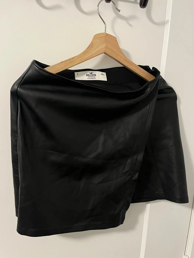 This Hollister black faux-leather skirt in a size small offers an edgy and stylish addition to your wardrobe. This skirt is in good, used condition. Perfect for a night out or a trendy daytime look.