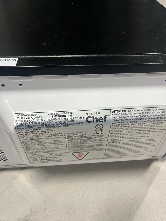 This is a Master Chef microwave with 700 Watts of cooking power. It has seen a fair bit of use but is still in good working condition.