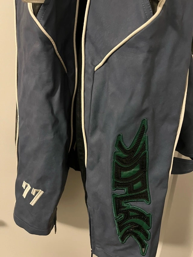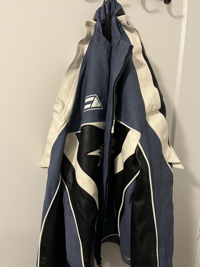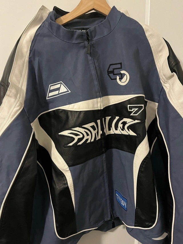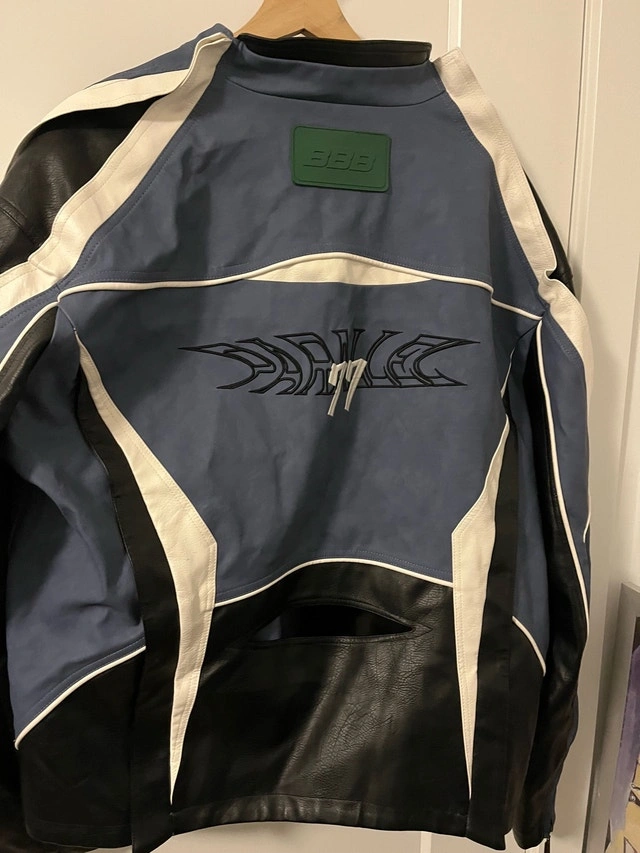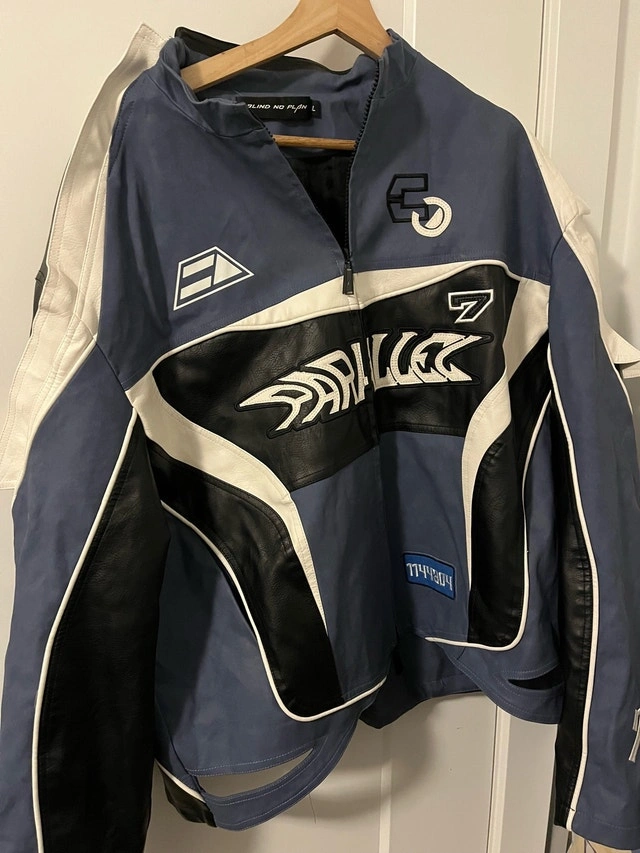 Snag this Blind Mo leather jacket, a real standout piece with its unique design and quality leather. This jacket is in good condition, showing it's ready for more adventures. Features include striking graphics and a comfortable fit, perfect for making a statement. This jacket has been previously loved. Additional details: - Size: Large - Material: Genuine leather - Colour: Primarily blue with black and white accents - Style: Motorsport Looking at similar jackets online, a fair price would be around $250.00. So, I think $250.00 is a reasonable price. If you're seeing this ad, the jacket is still up for grabs!