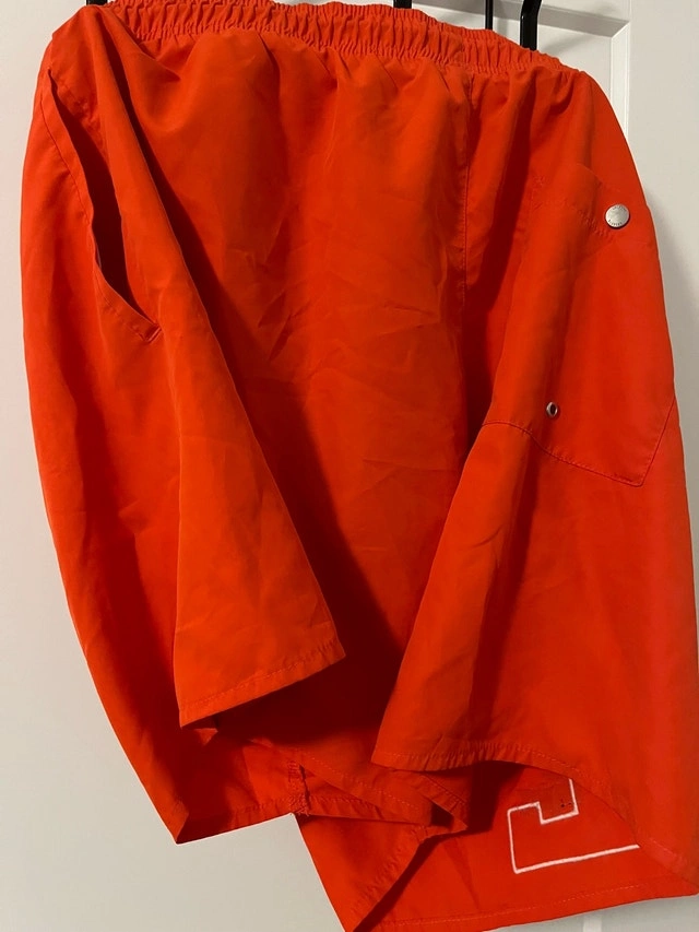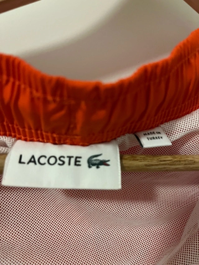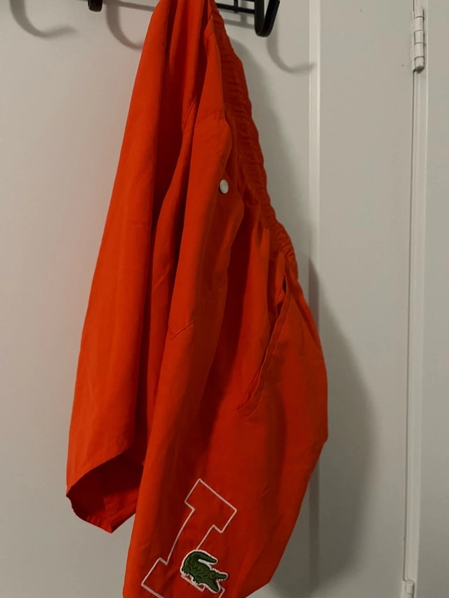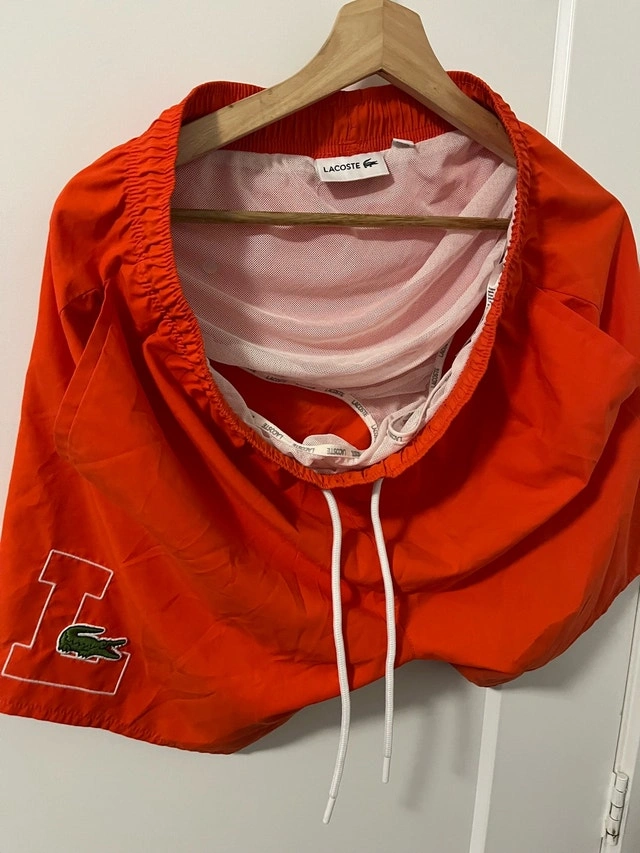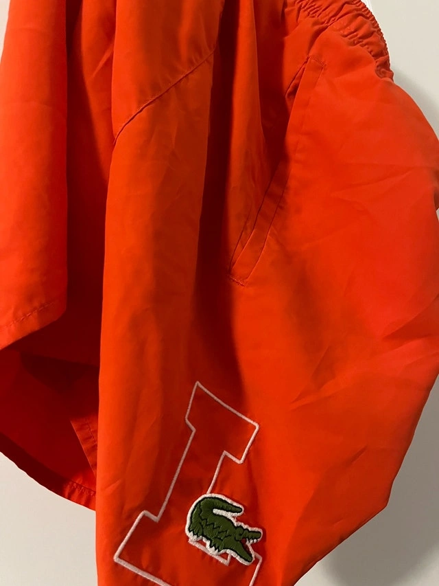 Get ready to make a splash with these vibrant orange Lacoste swim trunks! These trunks feature a comfortable elastic waistband and a stylish design. While these trunks have been enjoyed, they are still in good condition and ready for more sunny days.