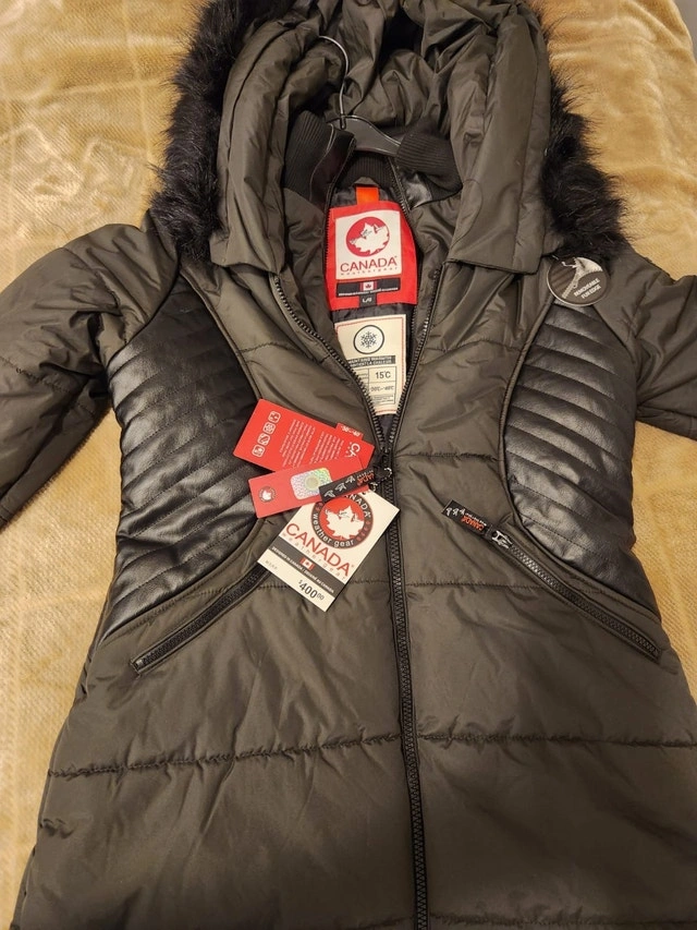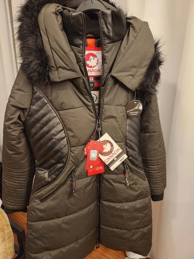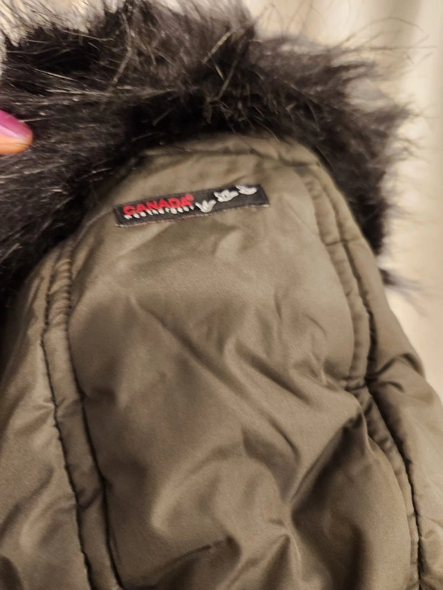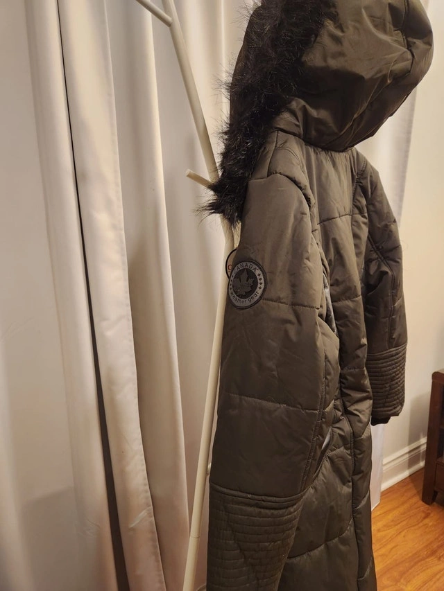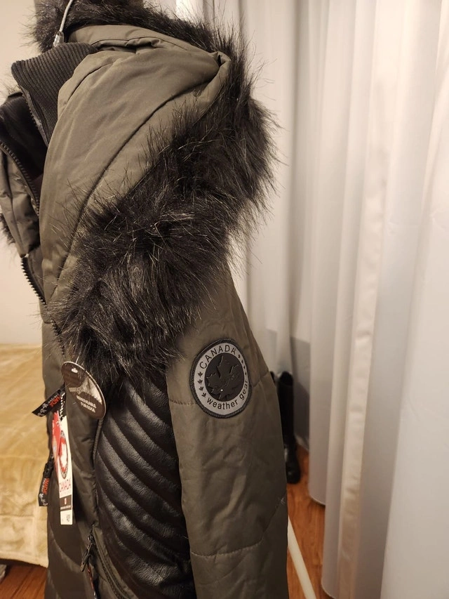 I'm selling a stylish and functional Canada Weather Gear winter coat, perfect for staying warm during the colder months, size Large. This coat features a sleek design with quilted detailing and a faux fur-trimmed hood.