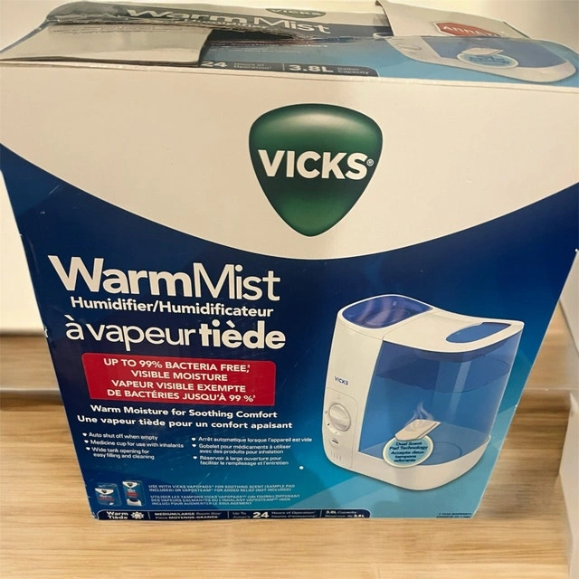 This Vicks Warm Mist Humidifier provides soothing comfort and visible moisture. It's been previously owned but is in good condition and ready to use. Perfect for adding moisture to the air, especially during dry seasons or when you're feeling under the weather.