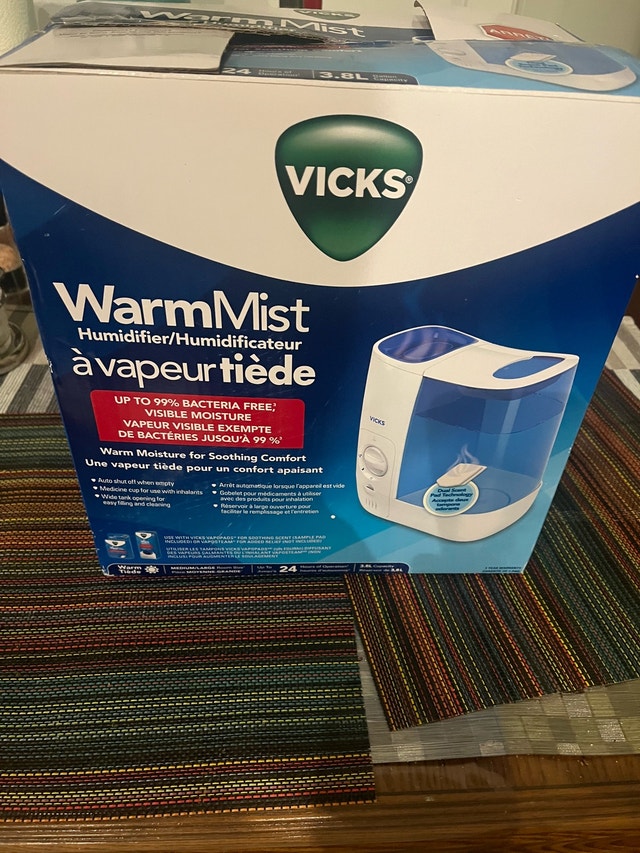 This Vicks Warm Mist Humidifier provides soothing comfort and visible moisture. It's been previously owned but is in good condition and ready to use. Perfect for adding moisture to the air, especially during dry seasons or when you're feeling under the weather.