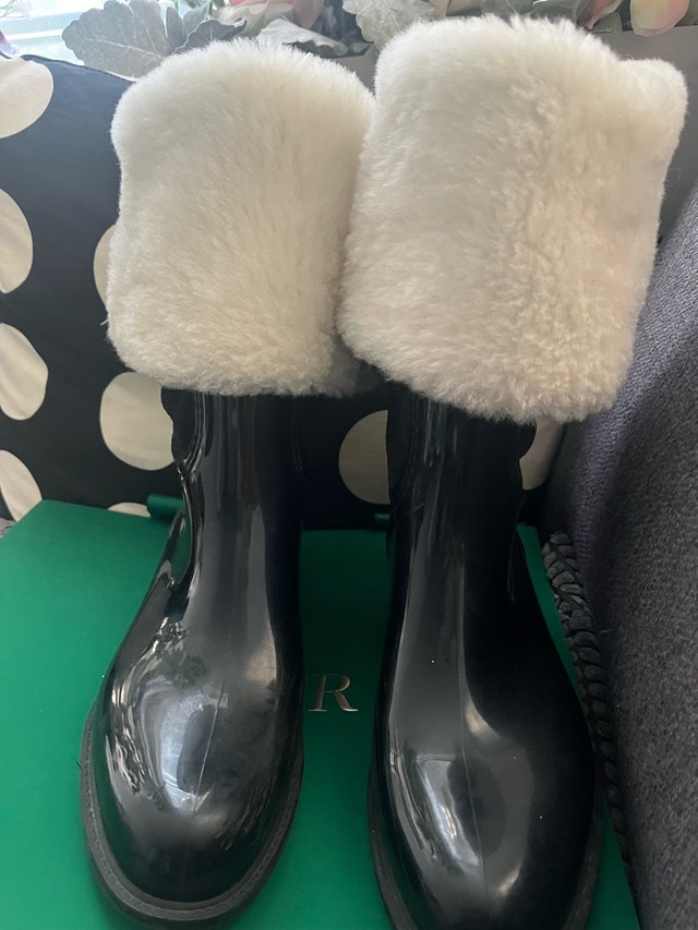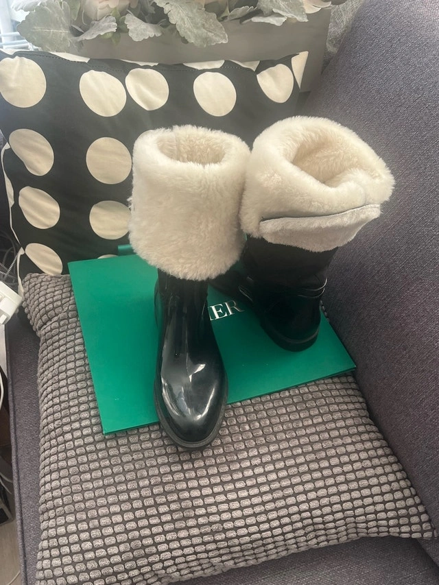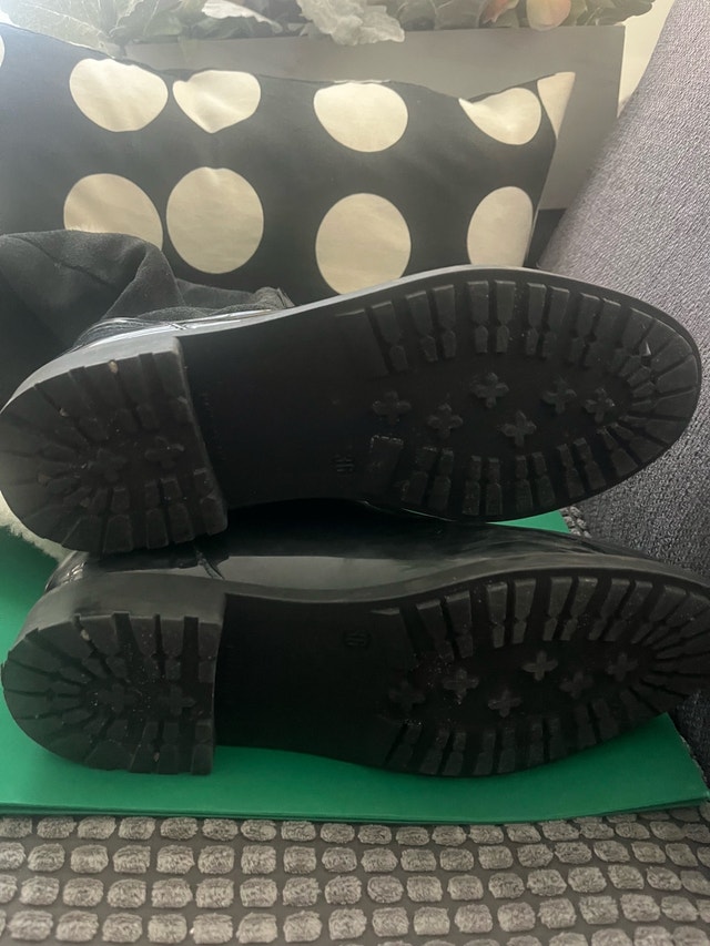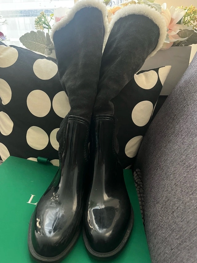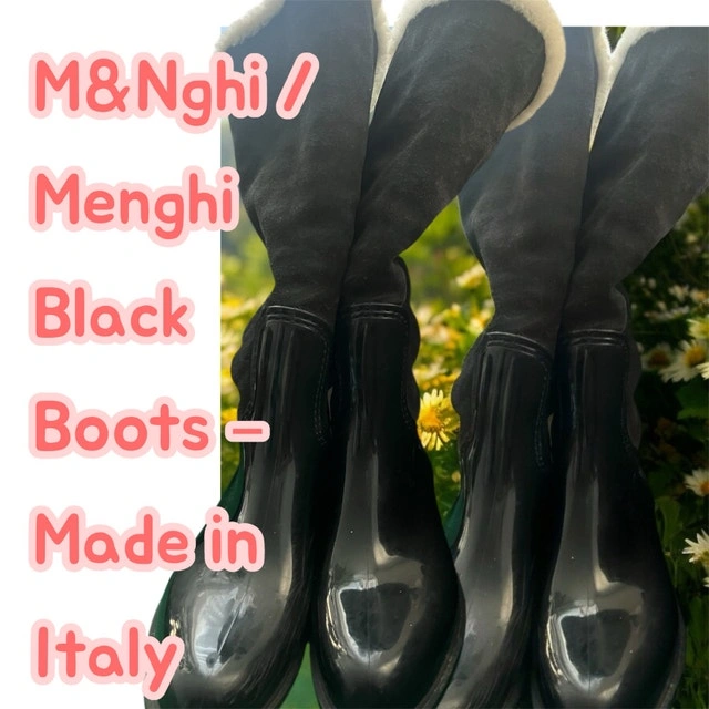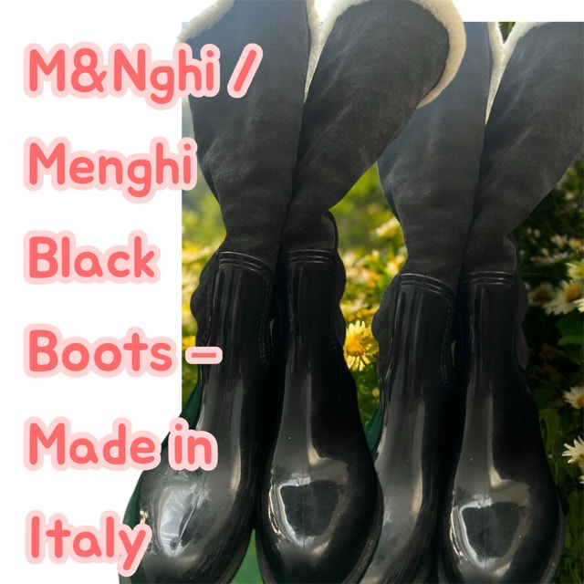 Step out in style with these Menghi black boots, crafted in Italy. The boots feature a sleek, high-cut design with a glossy finish and a plush, cozy lining, perfect for adding a touch of luxury to your cold-weather wardrobe. While these boots have been previously loved, they remain in good condition, ready for new adventures.