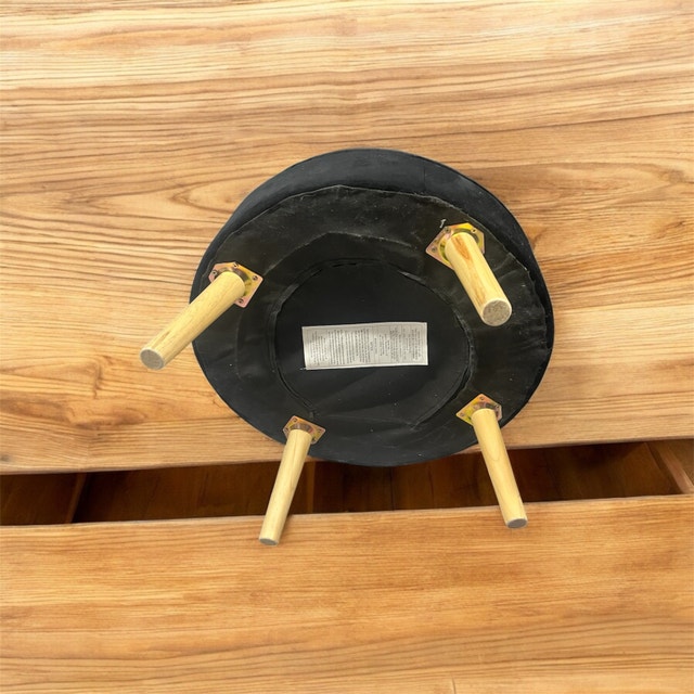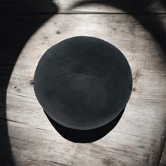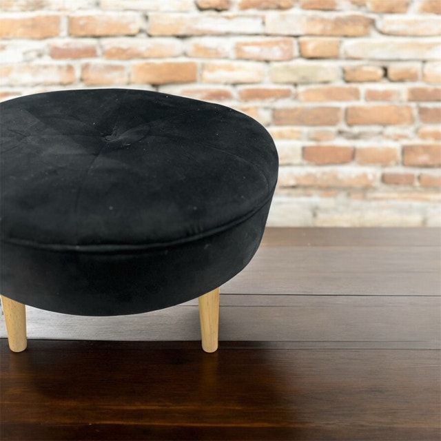 Add a touch of elegance to your living space with this chic black velvet ottoman. This round ottoman is perfect as a footrest, a small side table, or extra seating. This item is in used condition, but it's still as cute as a button!