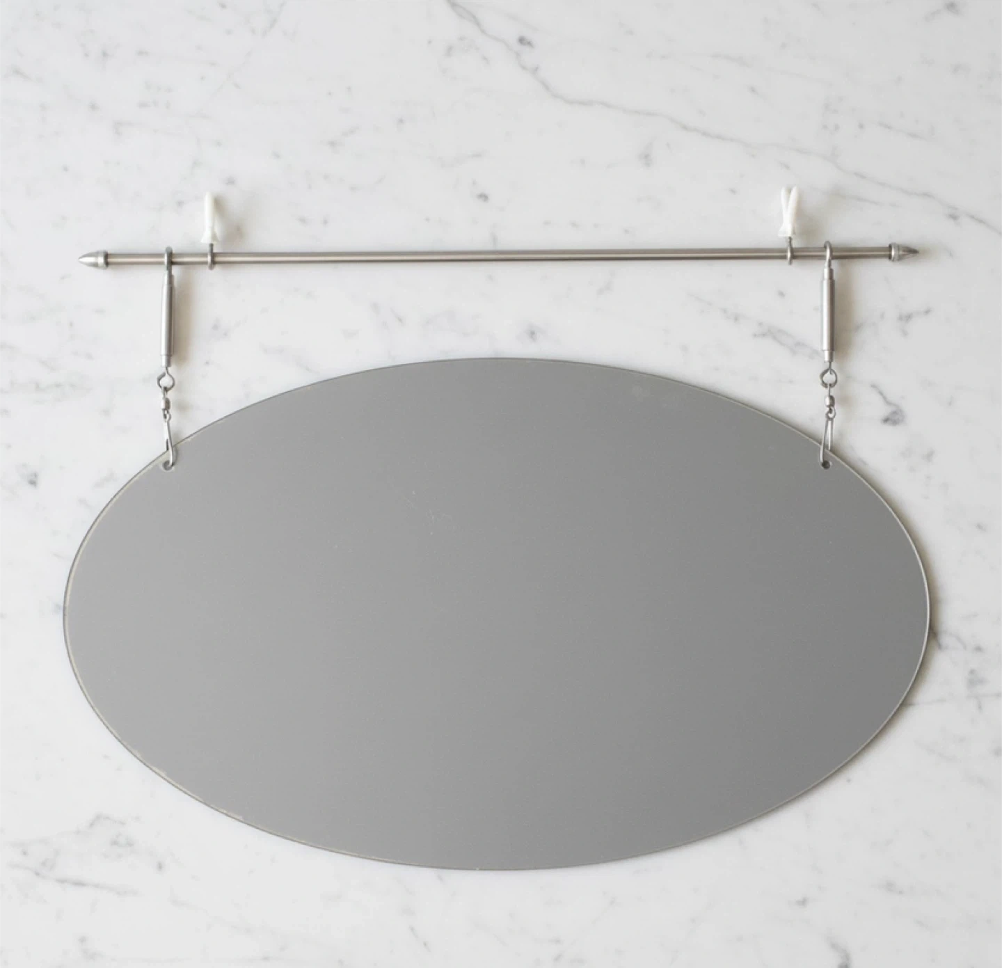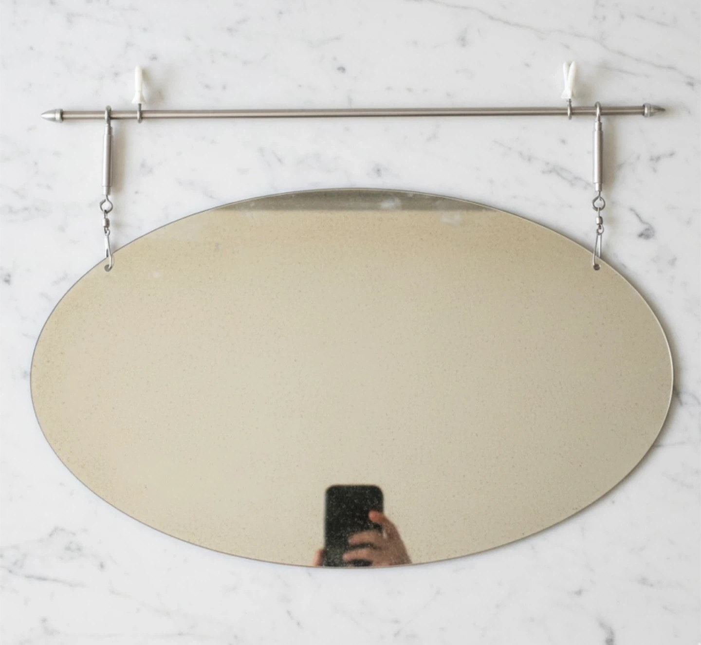 Unique vintage “Trapeze style” hanging mirror. Super sturdy. Has a metal rail and chains to hold the oval mirror. It would look great in any room! It's in great perfect condition