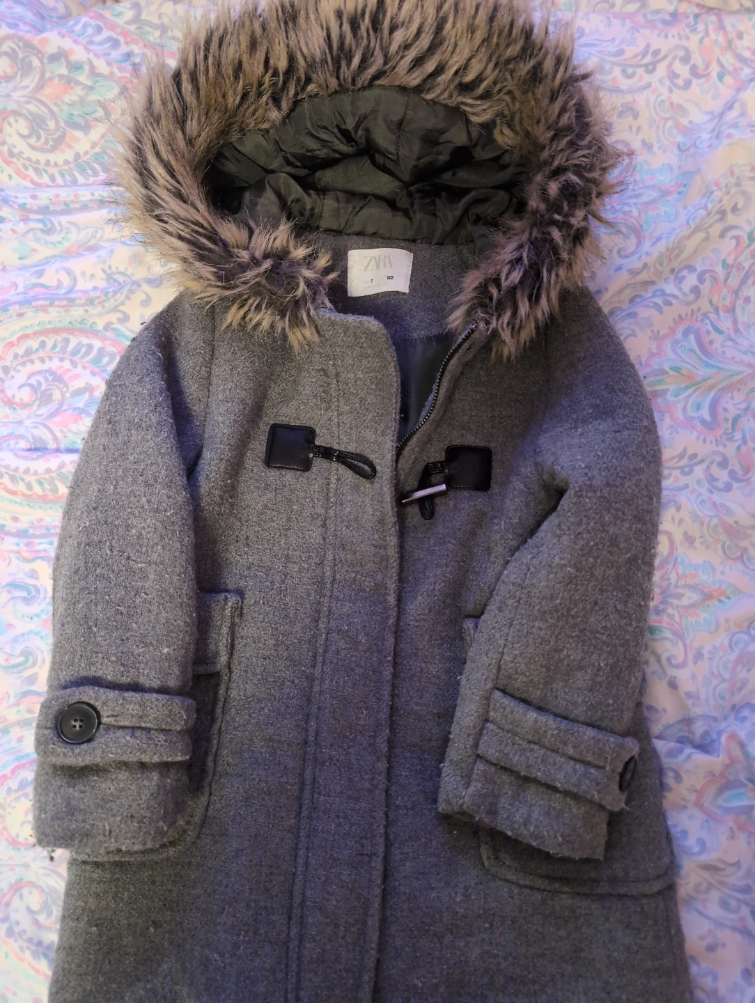 Selling a gently used Zara grey coat. It's a wool blend and size 7. Features a faux fur hood and toggle closures. Perfect for keeping your little one warm!