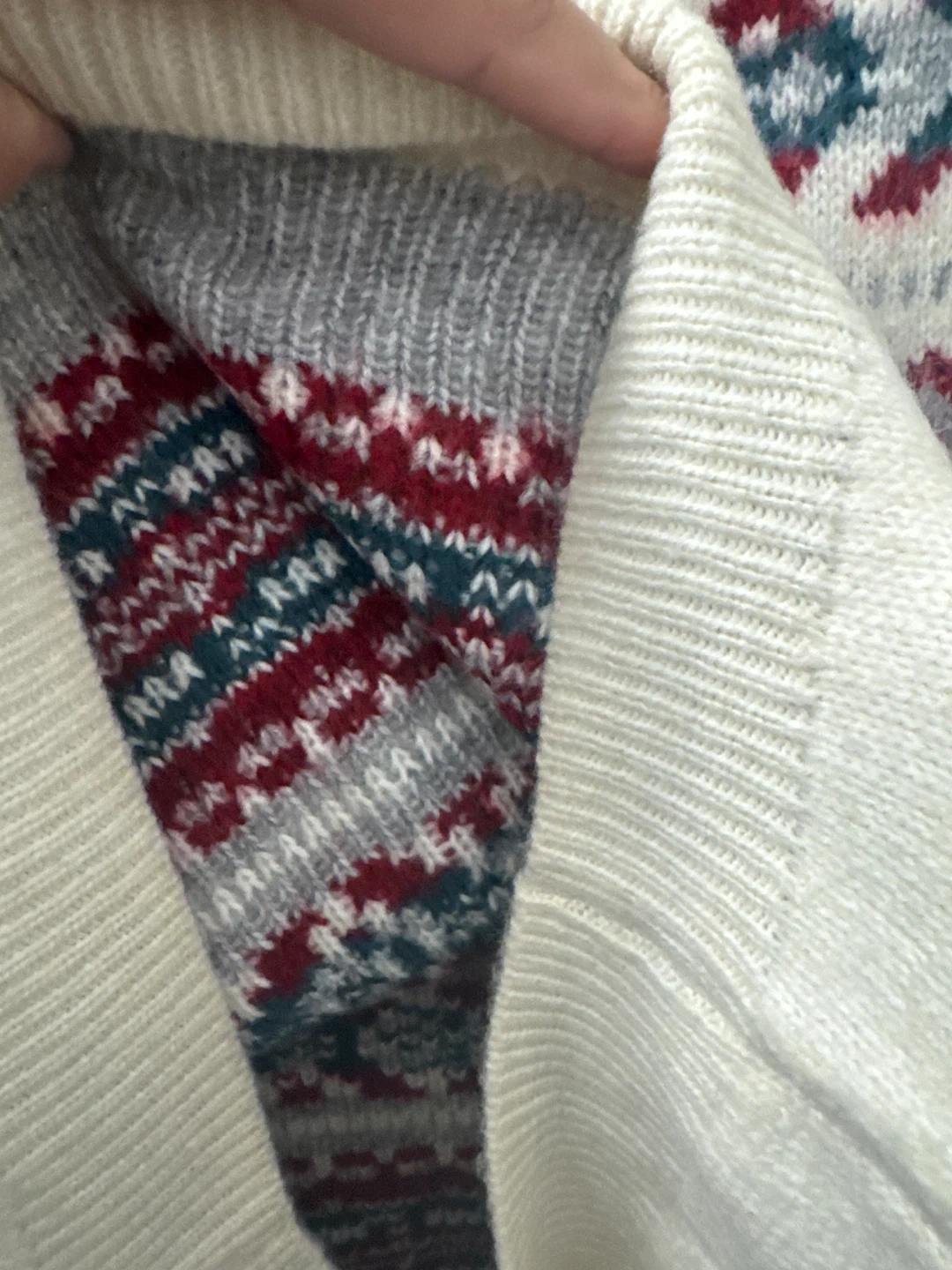 Cozy Joe Fresh knit sweater, size L/G. Features a cream base with red, grey, and teal accents in a geometric pattern. Perfect for layering!