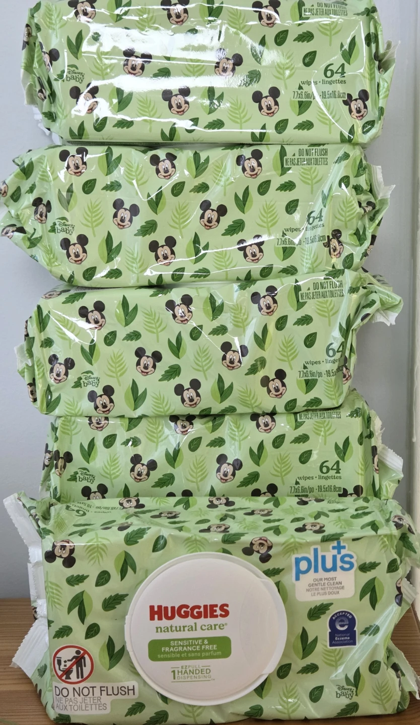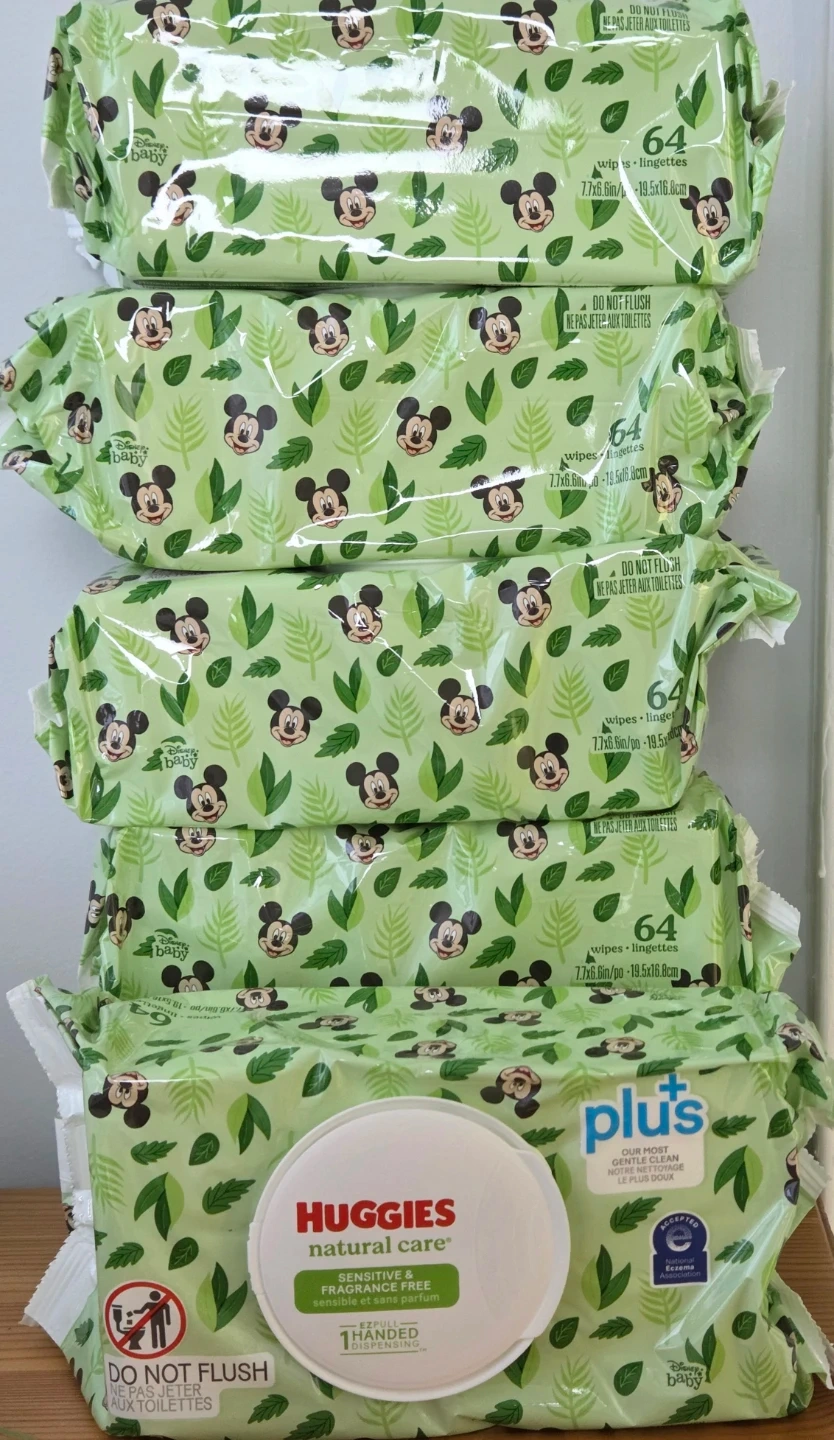 6 packs of Huggies Natural Care wipes with a cute Disney Baby design! These wipes are sensitive and fragrance-free, perfect for your little one. Each pack contains 64 wipes, sized at 7.7x6.6in / 19.5x16.8cm.