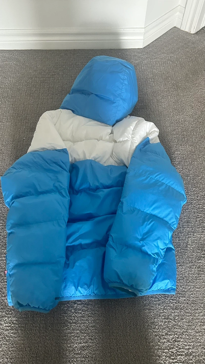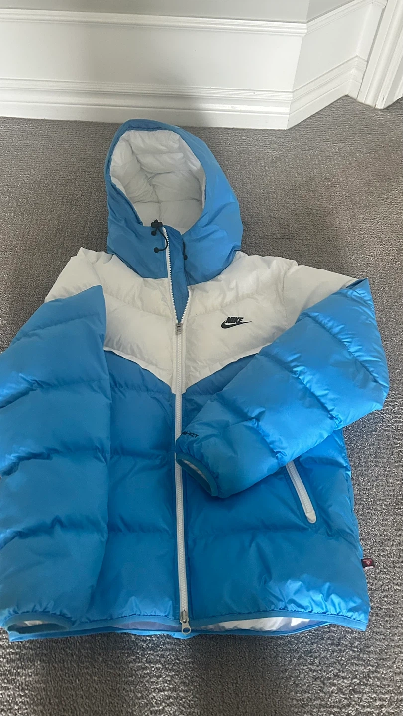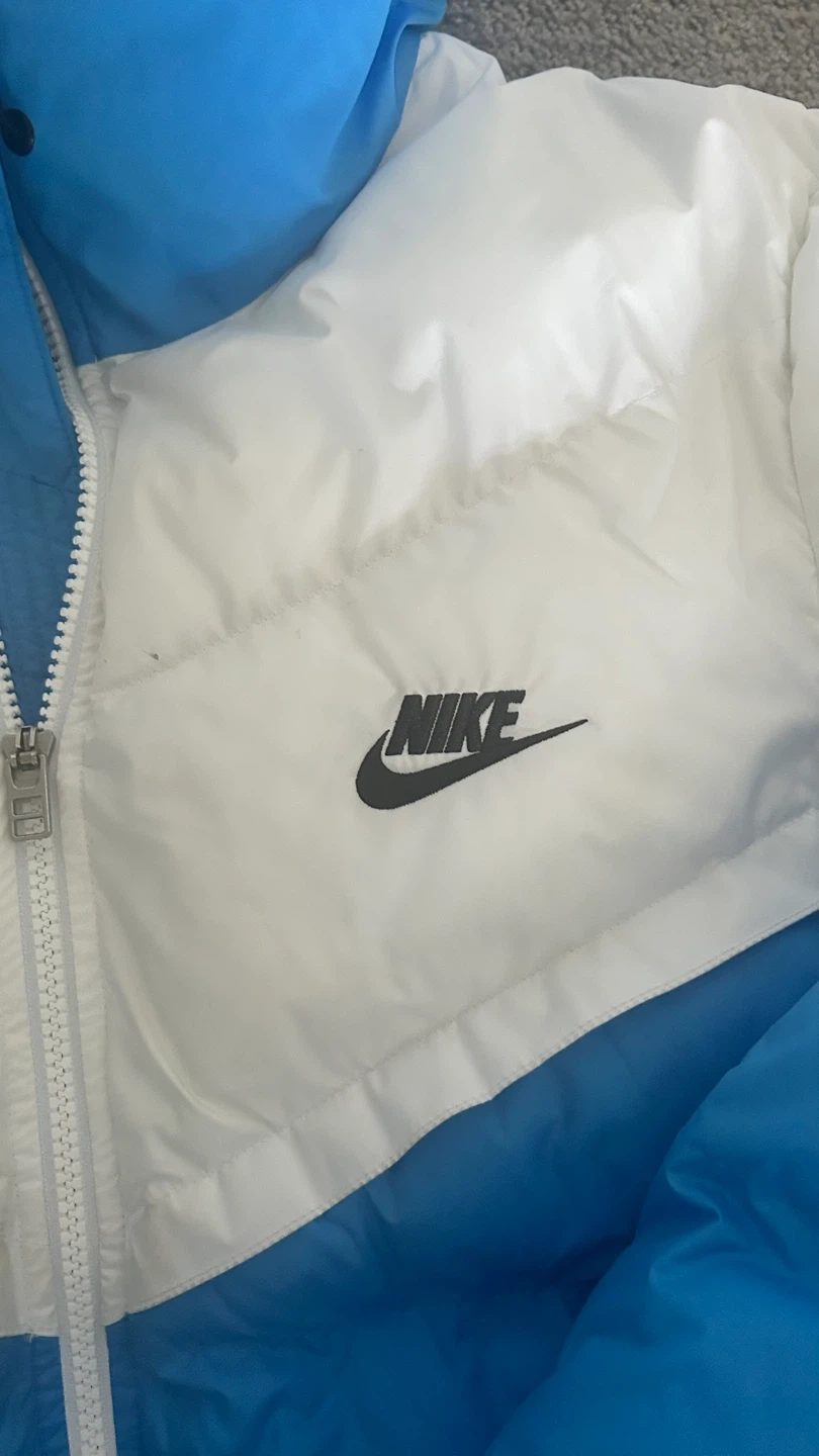 Nike blue and white puffer jacket with a bold chevron design across the chest. Features a full-zip front, padded hood, elastic cuffs, and a zippered side pocket for convenience. Lightweight but well-insulated for warmth, with a sleek finish and classic embroidered Nike logo. Great for everyday wear, street style, or colder weather.