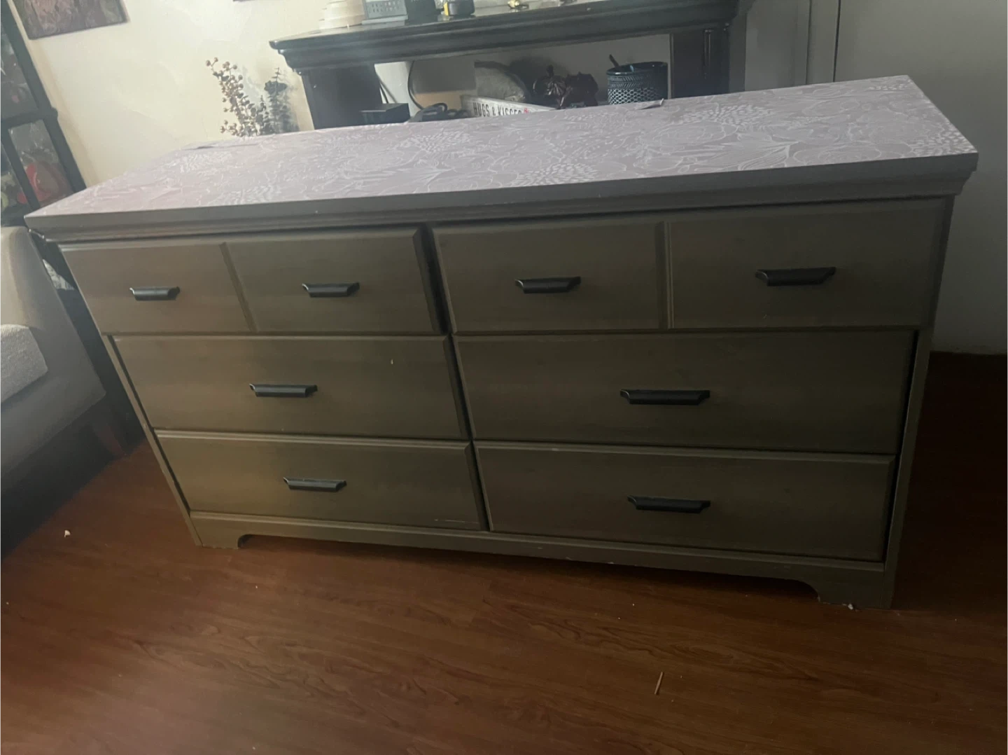 Selling a dresser with 7 drawers. It has a light gray color with a floral design on top. It's in good condition and ready for a new home!