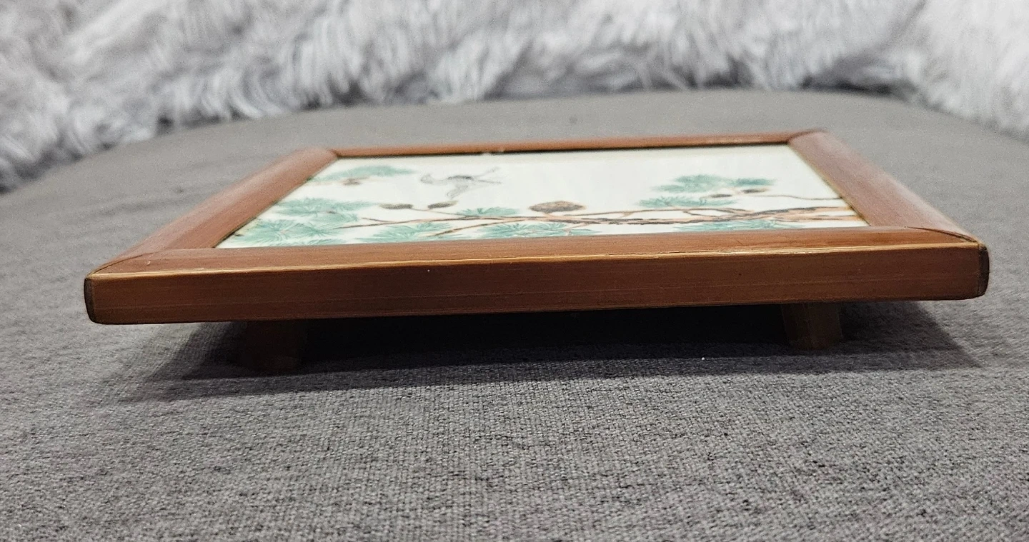 Selling a lovely vintage tile art piece in a Japanese style. It has a wooden frame. The tile itself features a crane and pine branch design. It measures approximately 8 inches square. A unique piece to add to your collection or home decor!