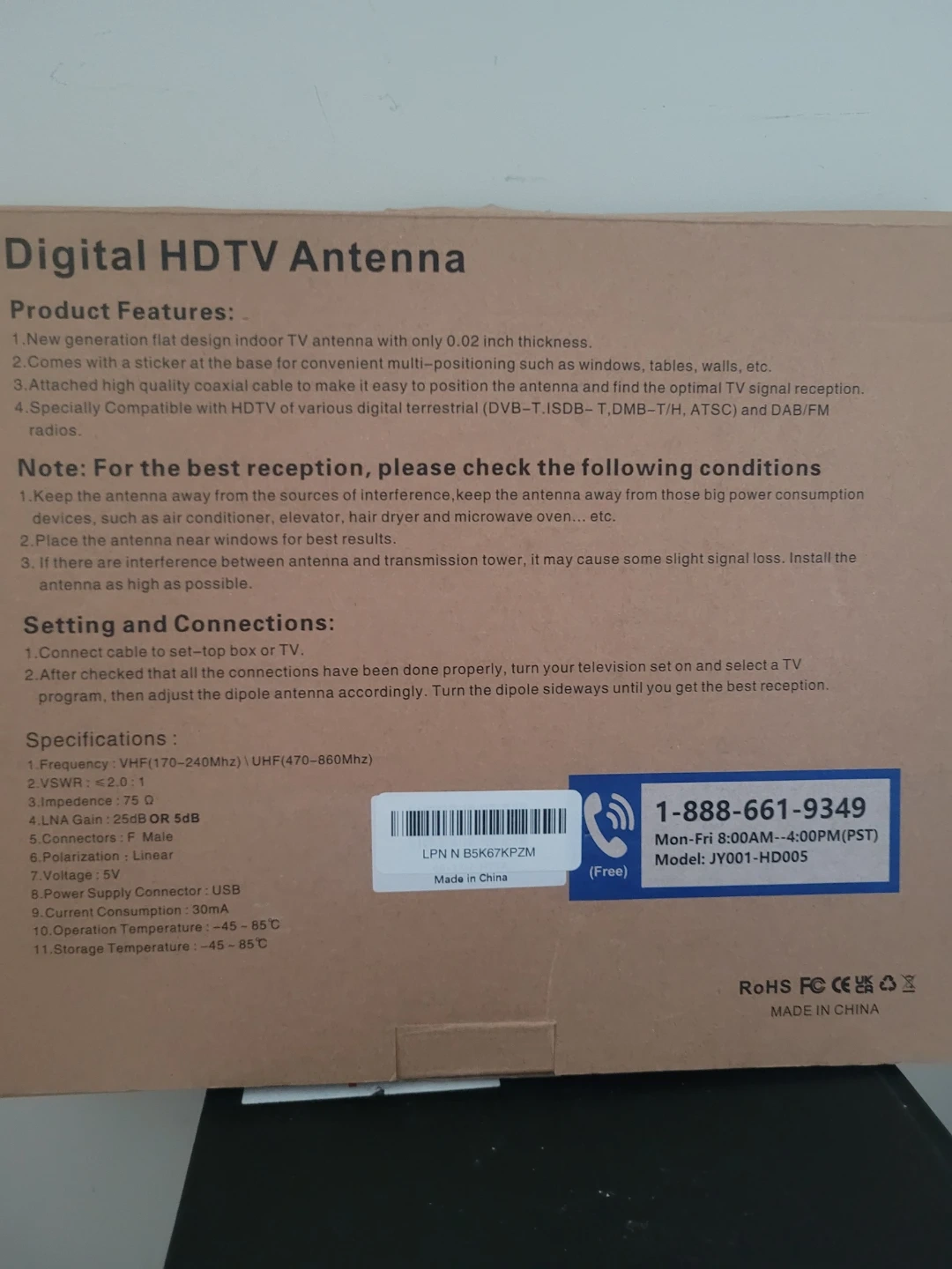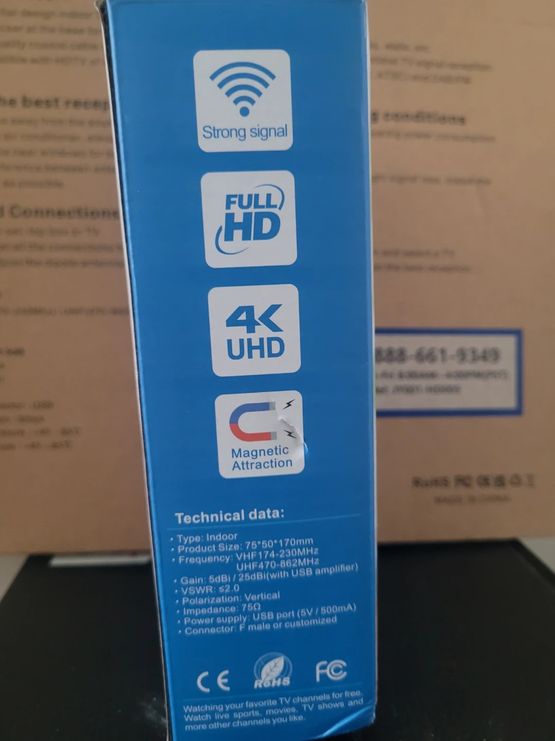Selling a digital HDTV antenna! It's a new generation flat design indoor TV antenna with only 0.02 inch thickness. It comes with a sticker at the base for convenient multi-positioning such as windows, tables, walls, etc. Attached high quality coaxial cable to make it easy to position the antenna and find the optimal TV signal reception. It's specially compatible with HDTV of various digital terrestrial (DVB-T.ISDB-T.DMB-T/H, ATSC) and DAB/FM radios. It has a strong signal, full HD, 4K UHD, and magnetic attraction. The type is indoor, product size is 75*50*170mm, and frequency is VHF174-230MHz\UHF470-862MHz