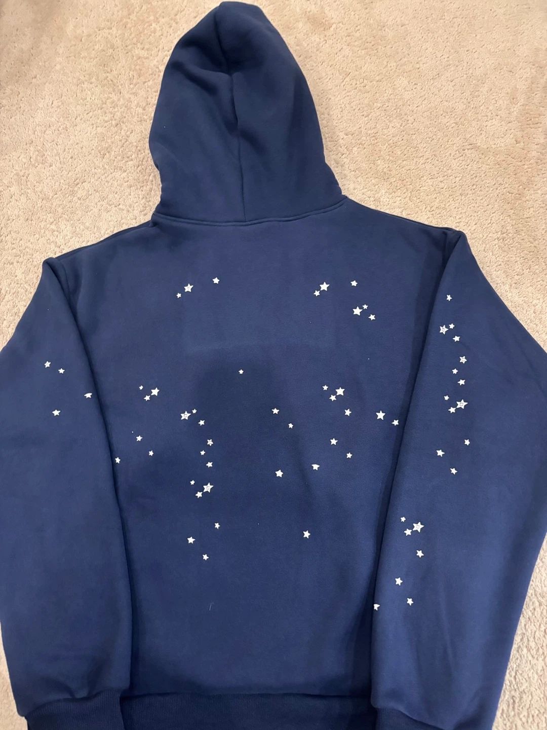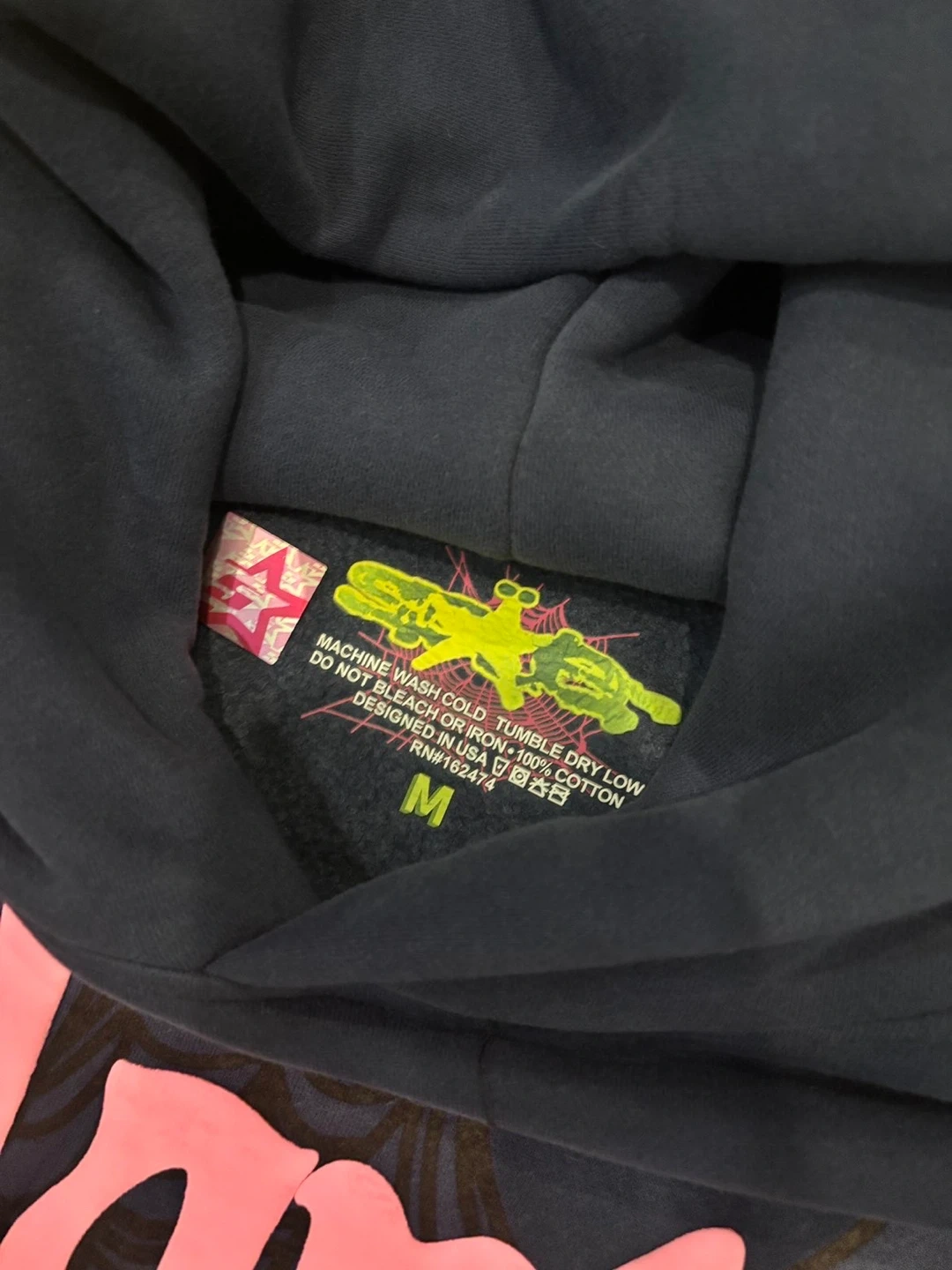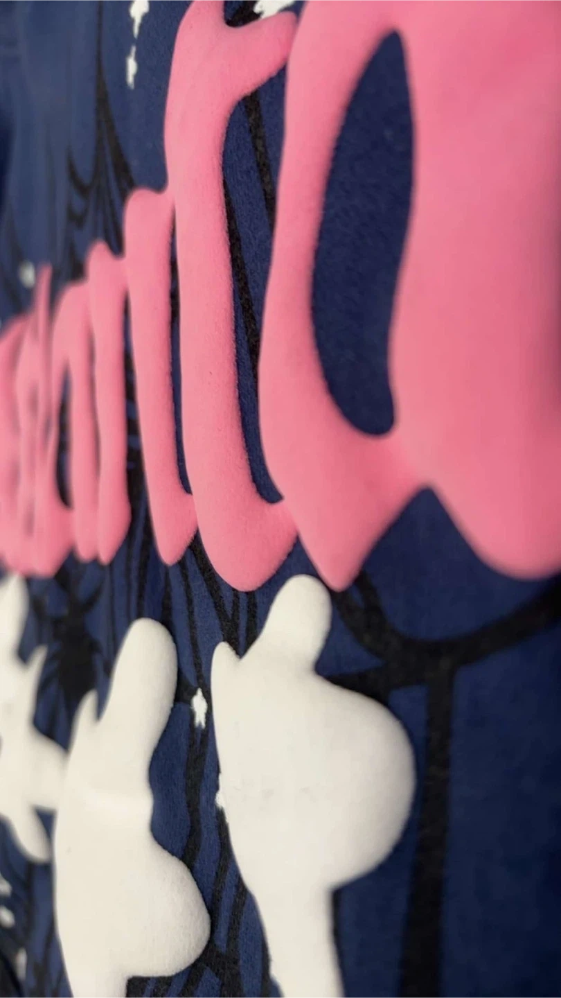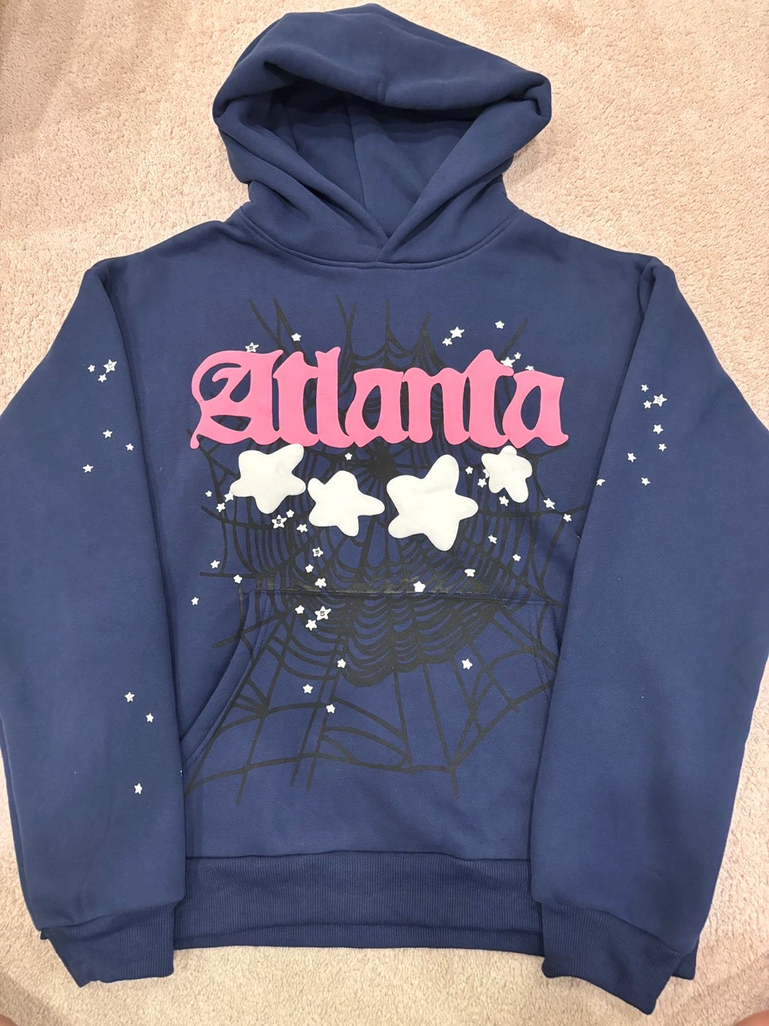 Cozy Atlanta hoodie in size medium! The hoodie is a nice blue colour with a pink "Atlanta" design on the front. It also features a spiderweb and star pattern. Perfect for staying warm and stylish! Spider hoodie (Sp5der. DM for details.