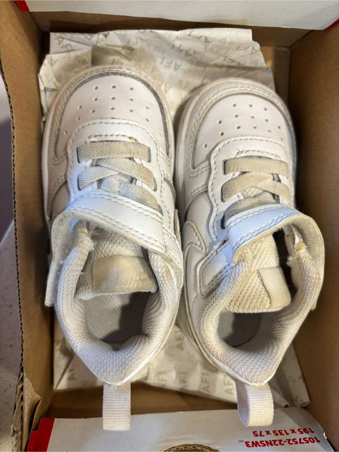 These are a pair of Nike Air Force 1 toddler shoes in size 5C. They show some signs of wear, but still have lots of life left in them! They come with the original box