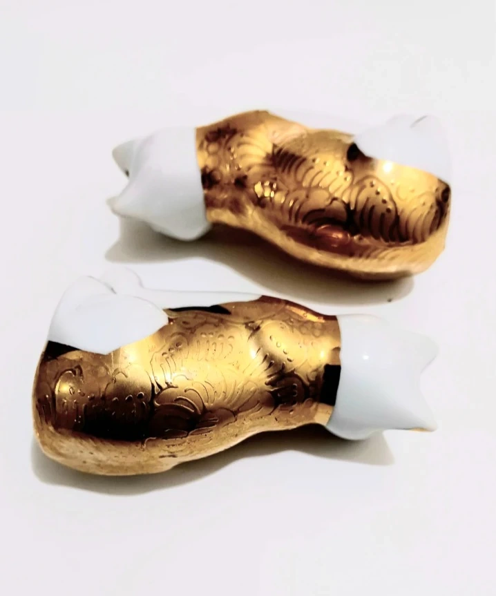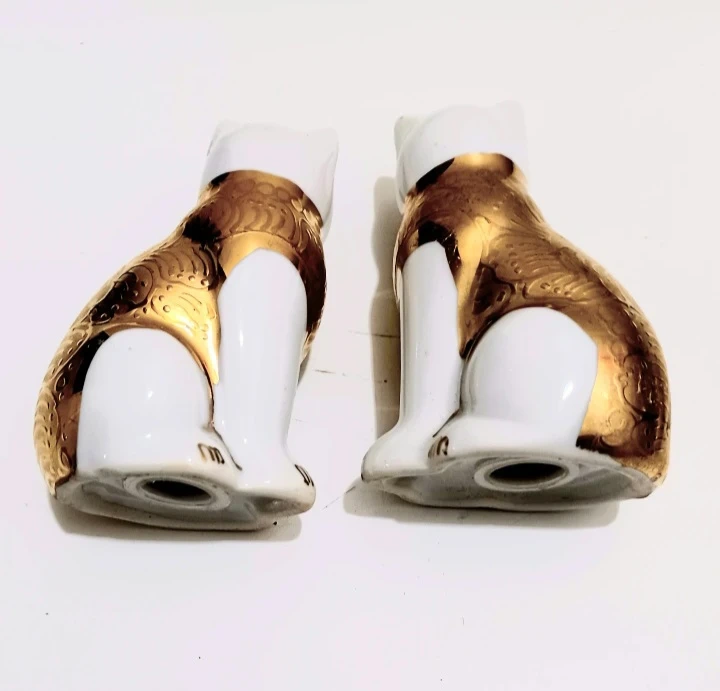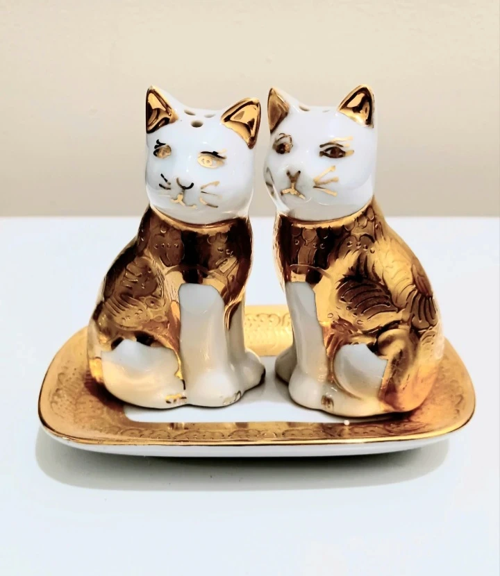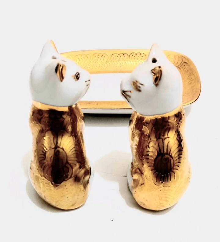Set of 3 features Two Hand-painted Ceramic Cats with exquisite gold accents, perched elegantly on a Hand Painted tray.