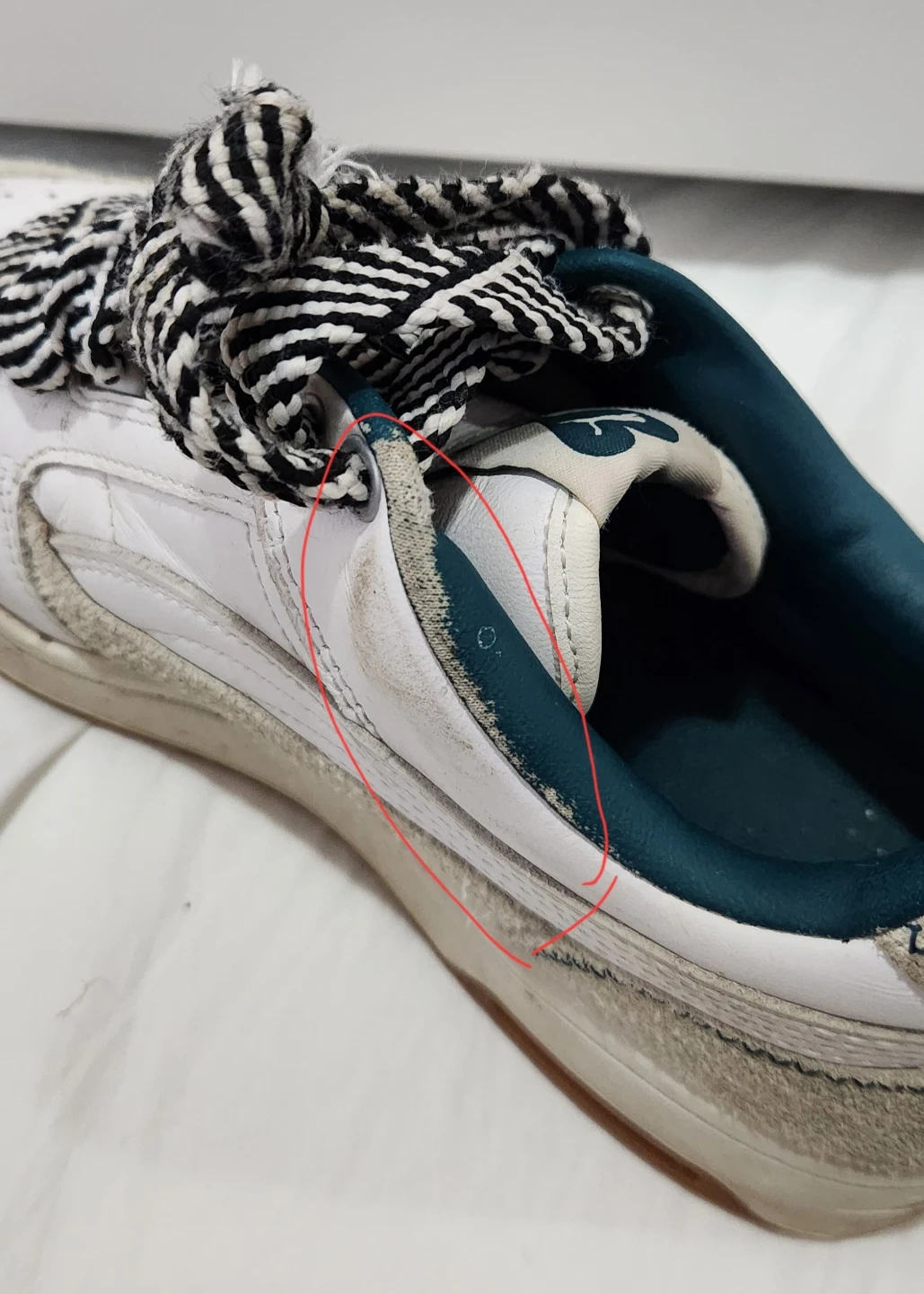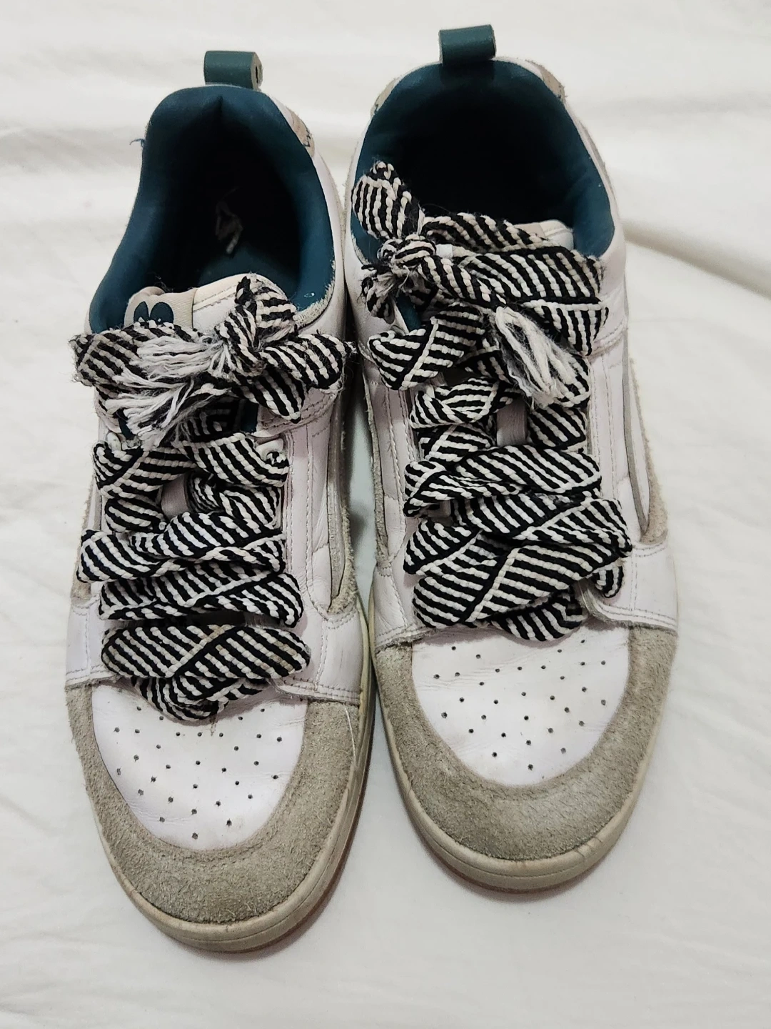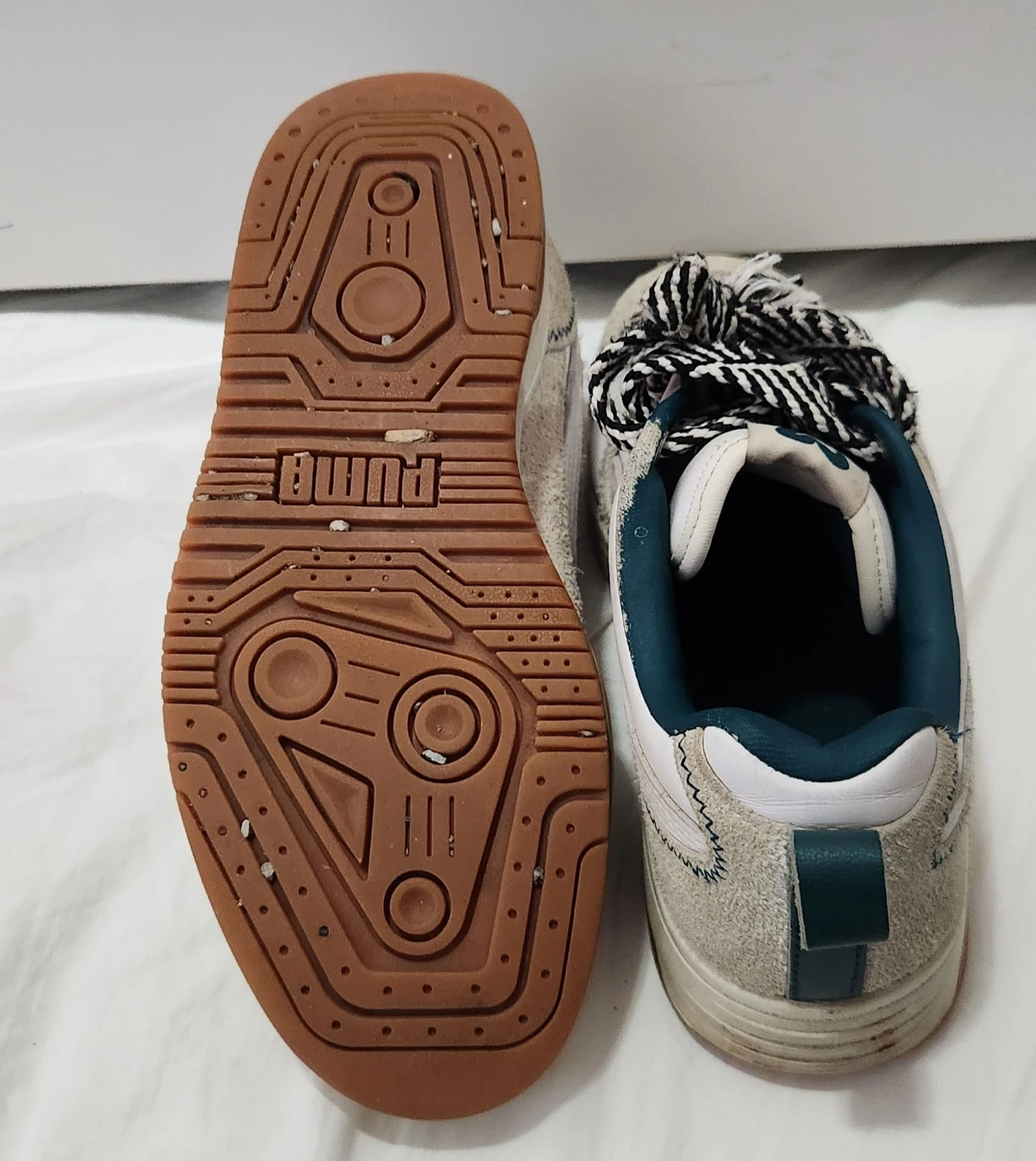 Selling a pair of Puma sneakers in white and grey. They show some signs of wear, as pictured. The laces are black and white striped. Size UK 5, EUR 38, US 6, CA 6