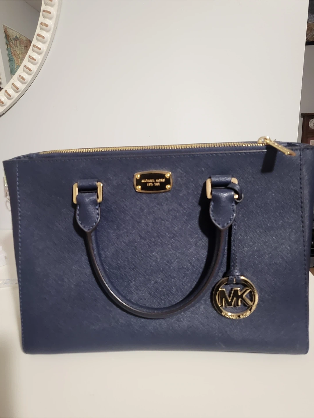 A stylish navy satchel handbag from Michael Kors. It's in great condition and perfect for everyday use! The bag features the iconic MK logo charm and gold-tone hardware.