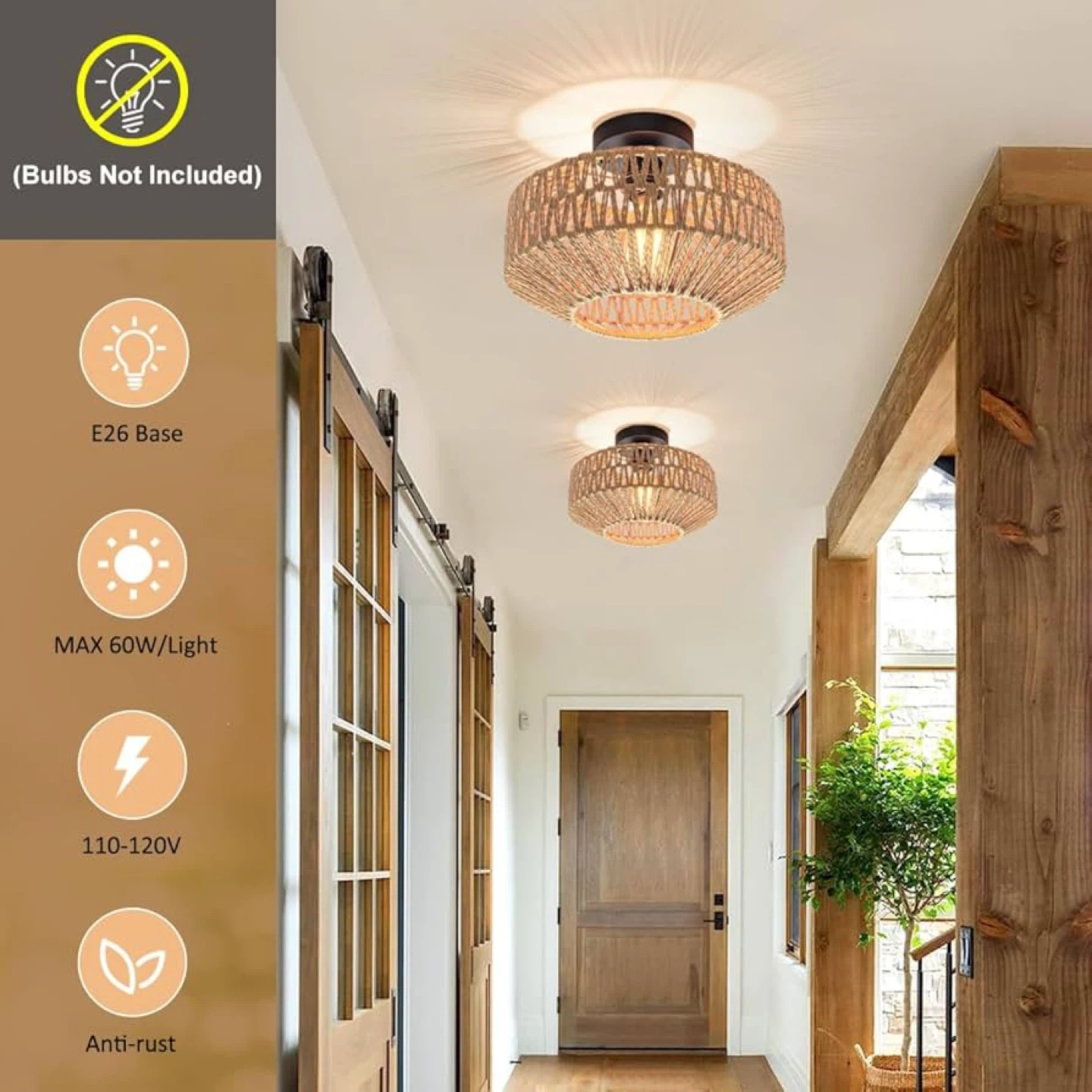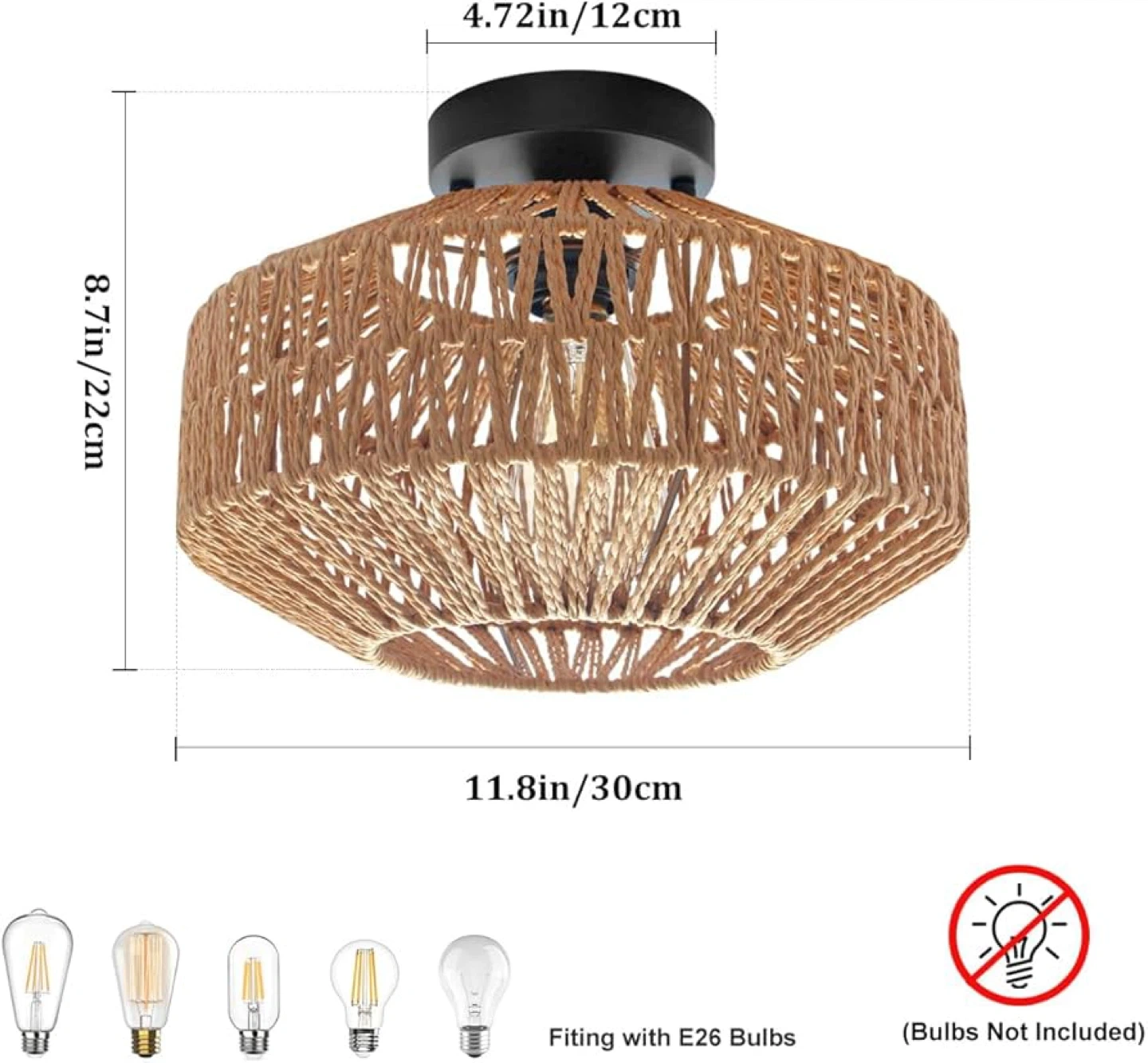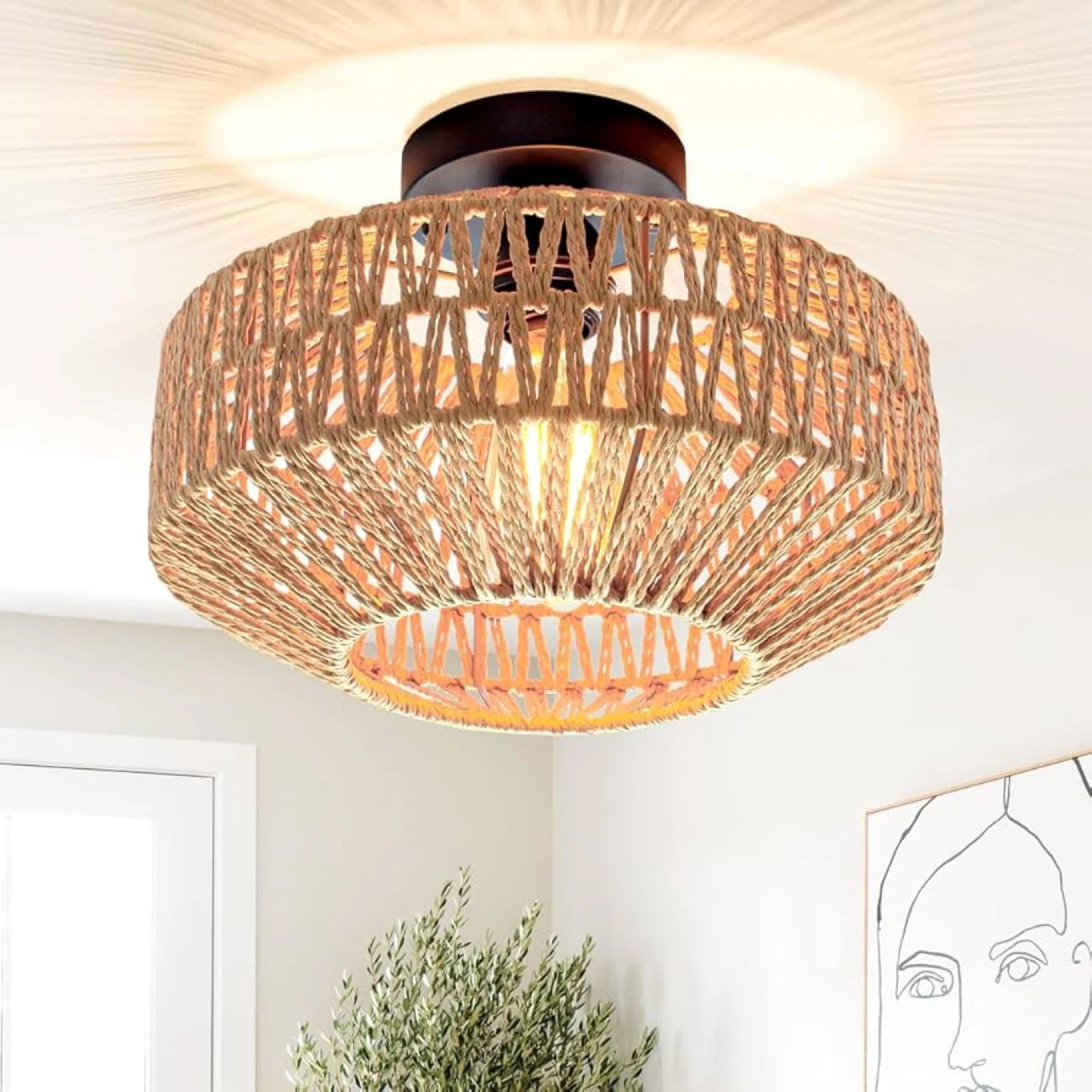 Semi Flush Mount with Hand-Woven Shade for Bedroom, Kitchen, Livingroom Entryway